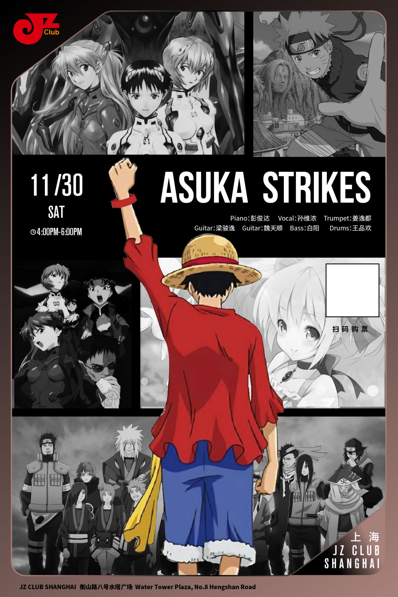 11月30日下午四点,一支由7位音乐家组成的爵士乐队,将在JZ Club带来“Asuka Strikes”爵士动漫主题音乐会!现场将呈现包括《新世纪福音战士》、《死神》、《海贼王》、《火影忍者》等一系列大家耳熟能详的动漫主题曲爵士版演绎,带大家穿越回那些充满激情与梦想的时光,重温那些经典的动漫瞬间~千万不要错过!