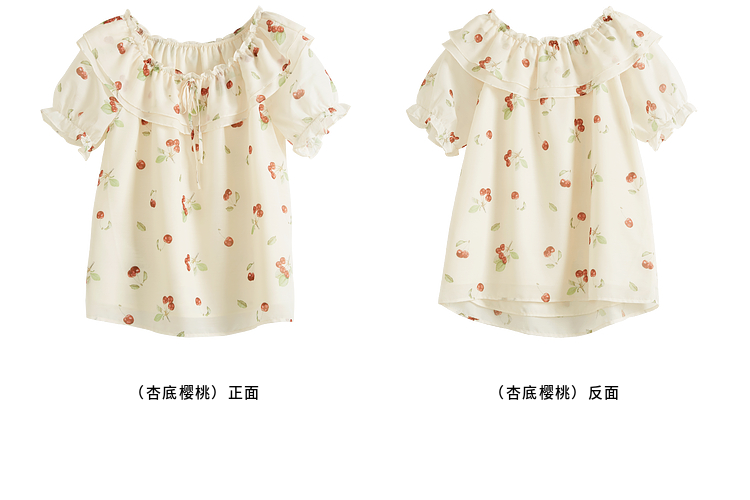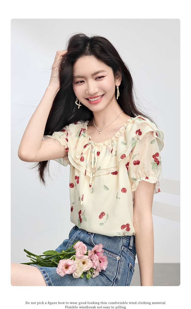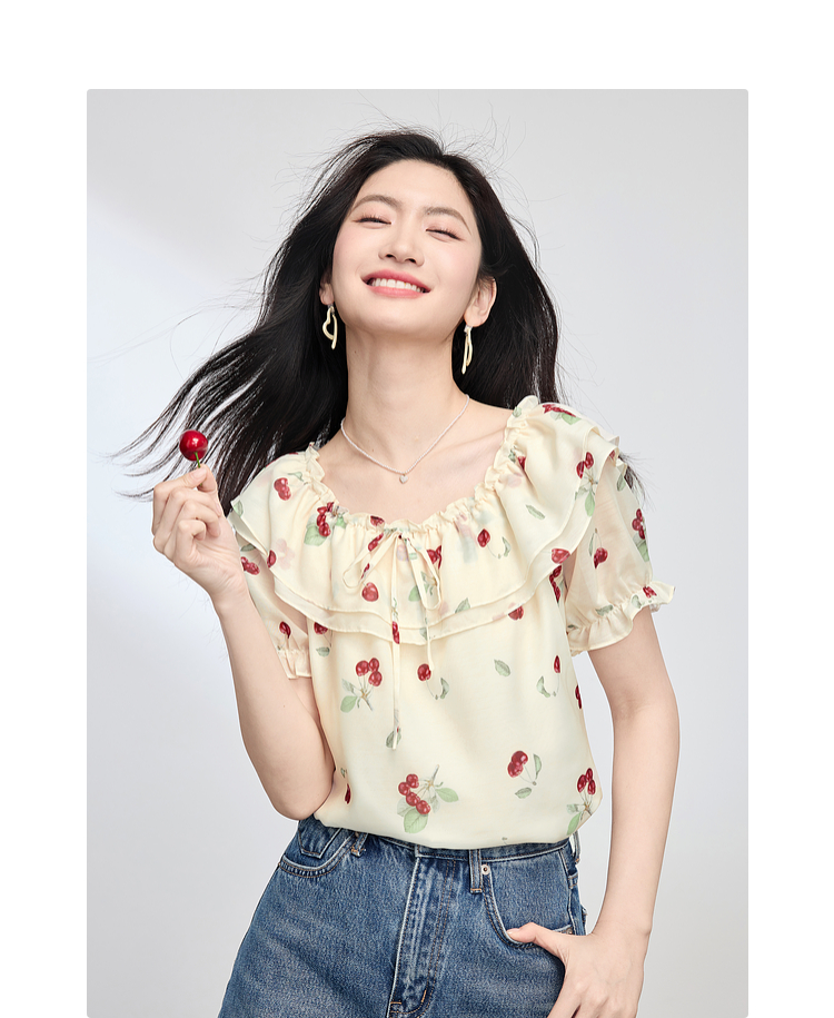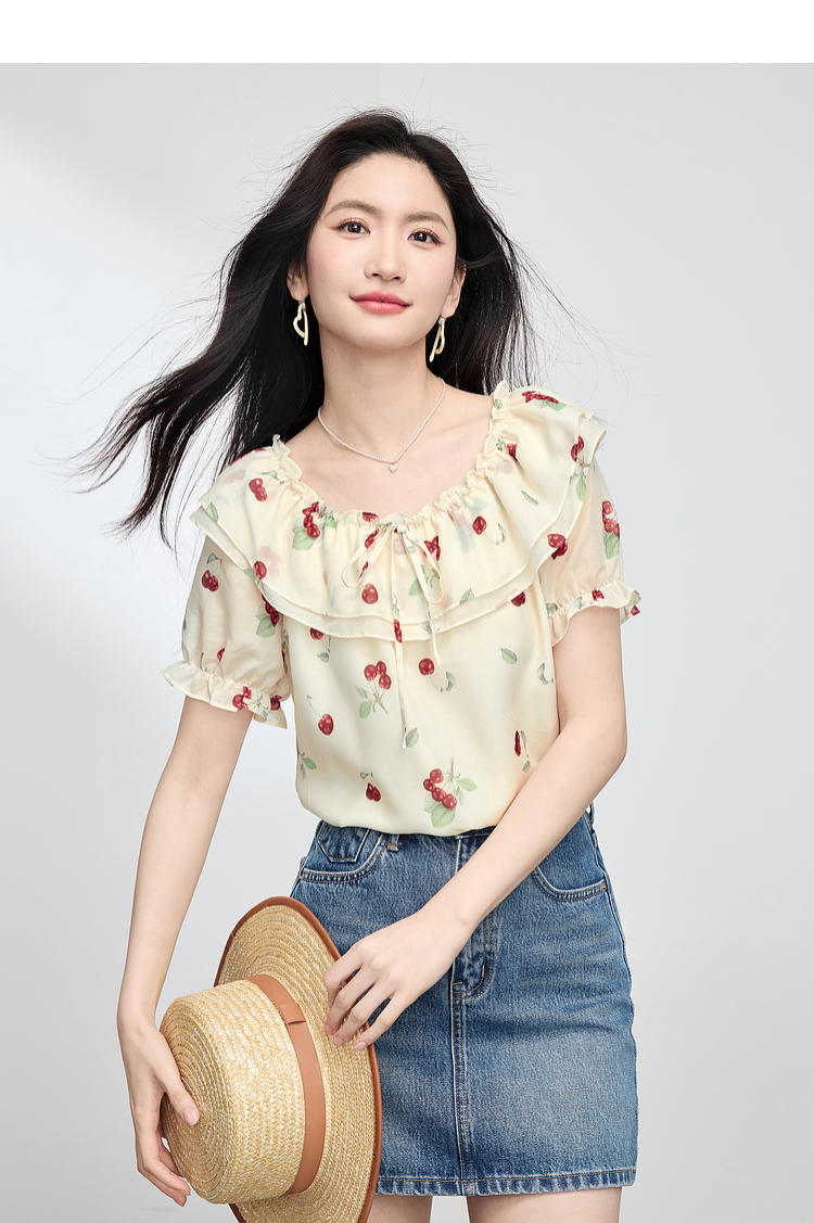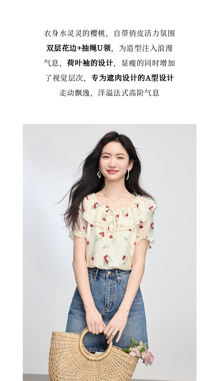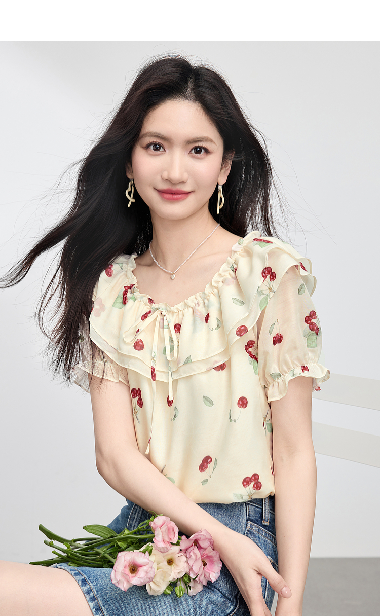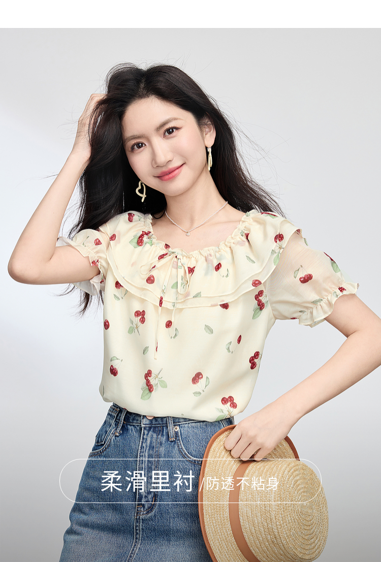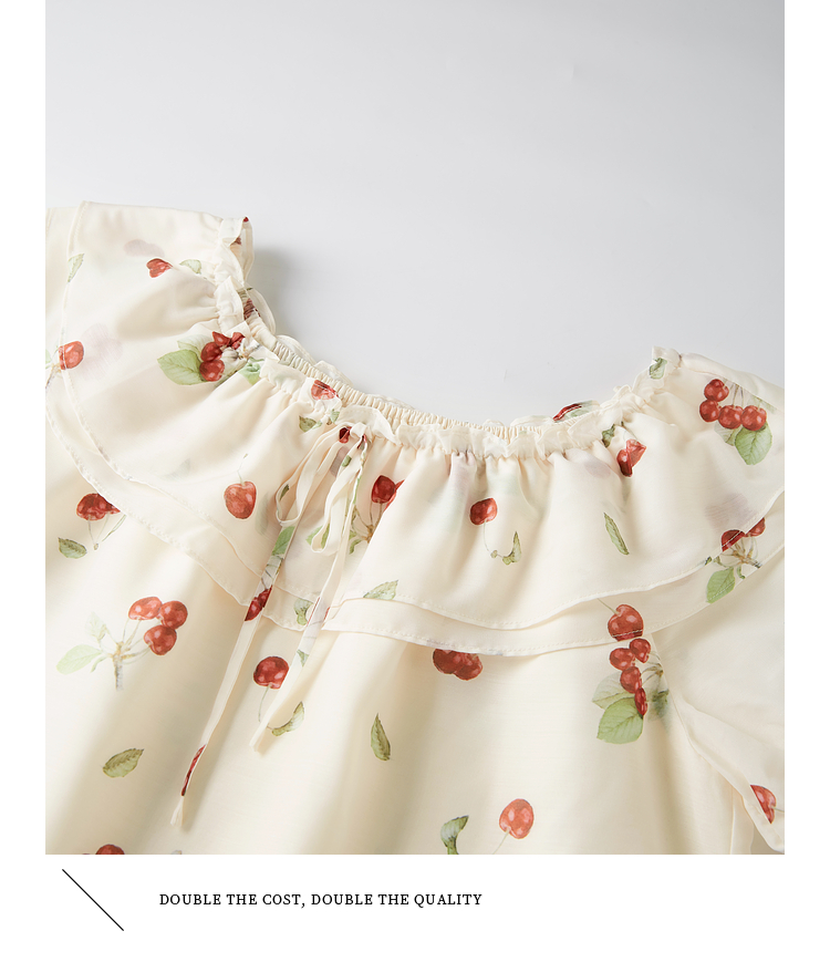 熙世界法式樱桃印花雪纺衫女夏2025新款双层花边领荷叶袖小衫上衣