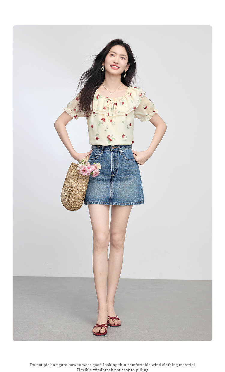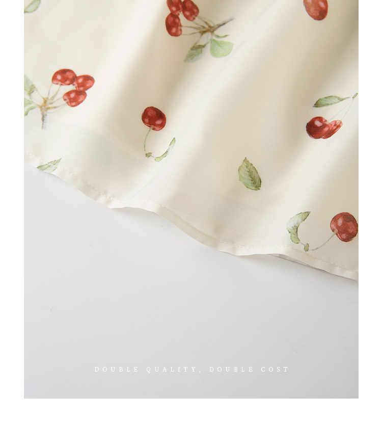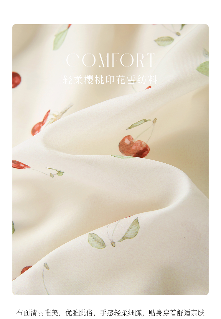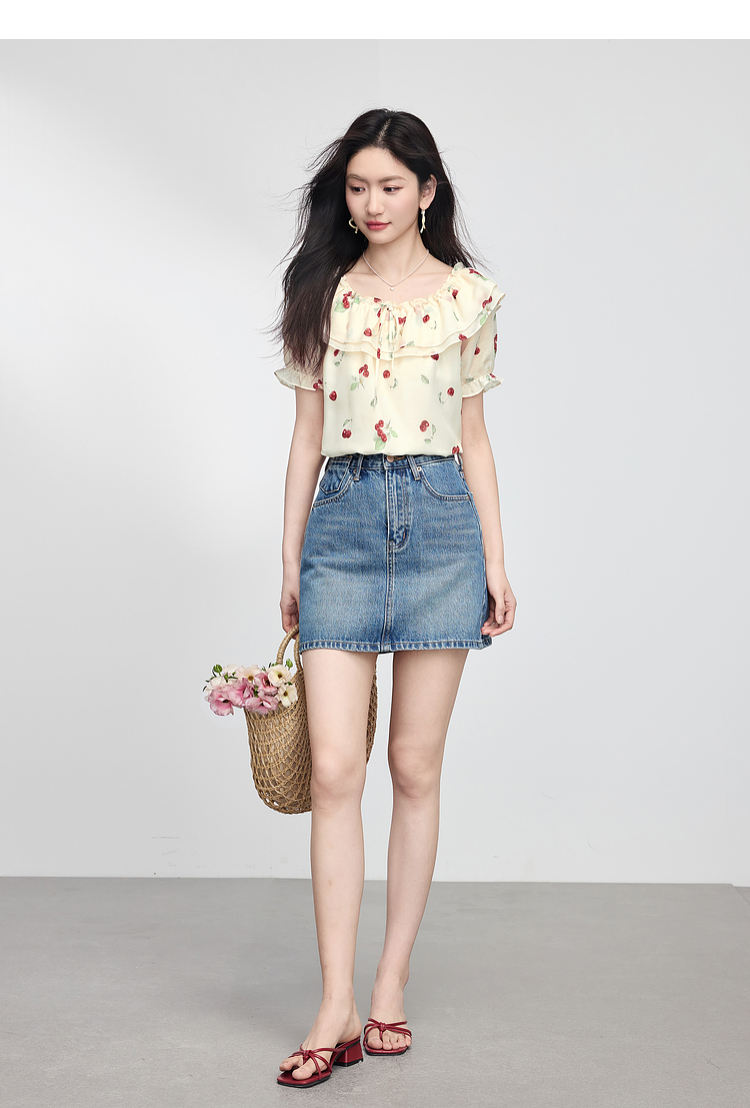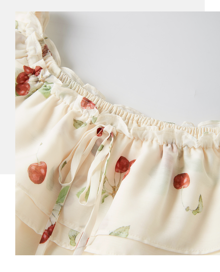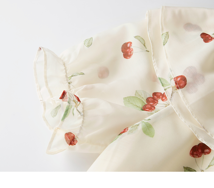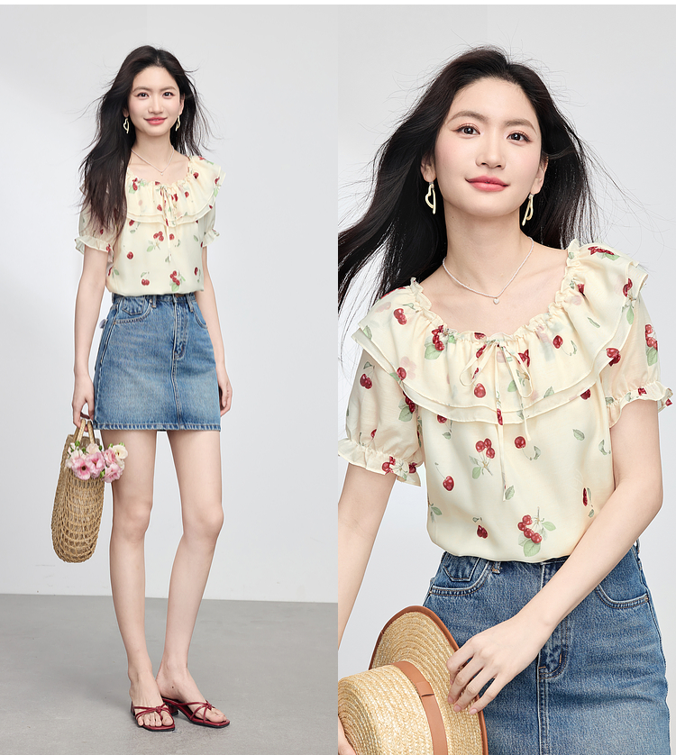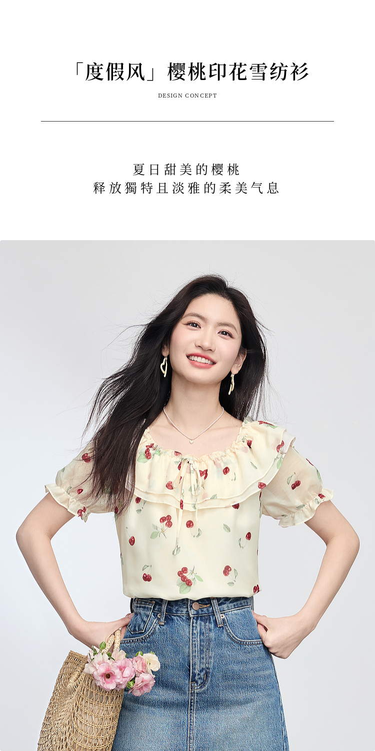 熙世界法式樱桃印花雪纺衫女夏2025新款双层花边领荷叶袖小衫上衣