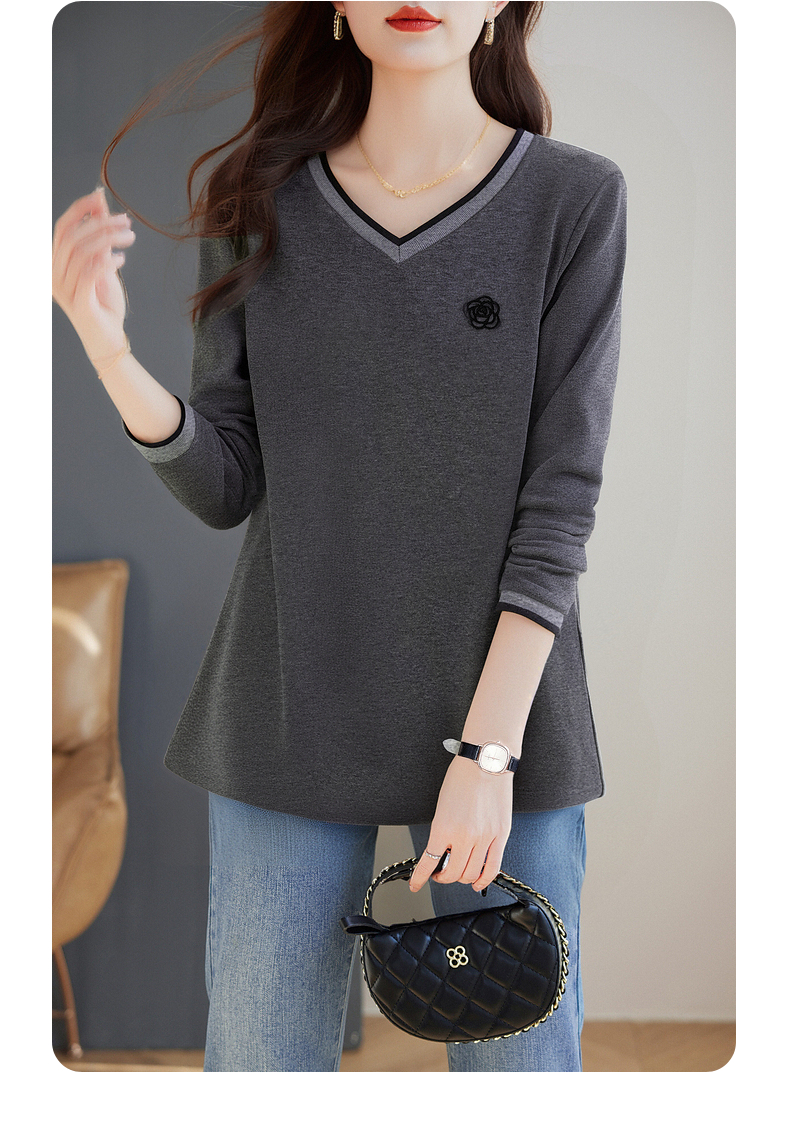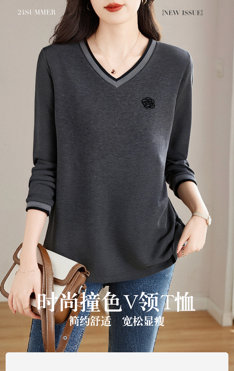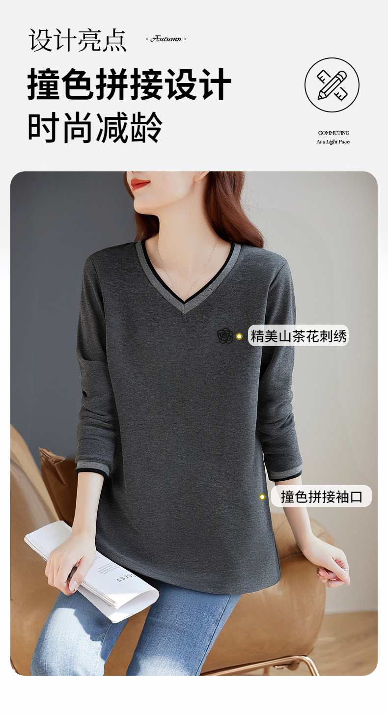 宽松长袖t恤女士春秋季新款妈妈上衣胖mm大码女装洋气v领打底衫女