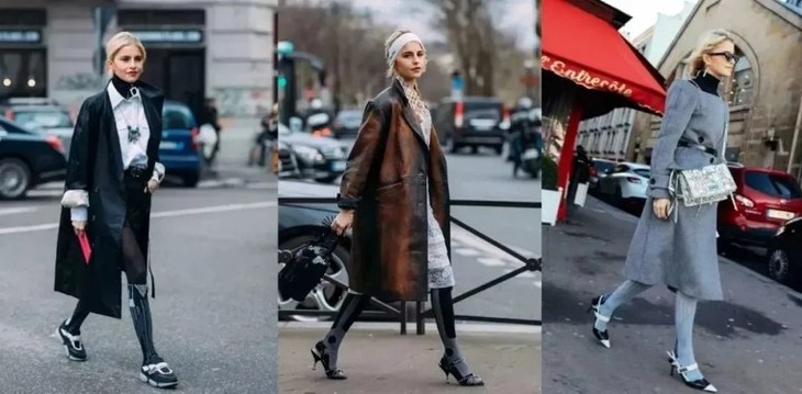 如果是穿裙装或one piece的衣服,可以试试用中长袜来打造"上松下紧"的搭法,一双长袜子轻松中和上半身的厚重感,让整体造型轻盈不少。