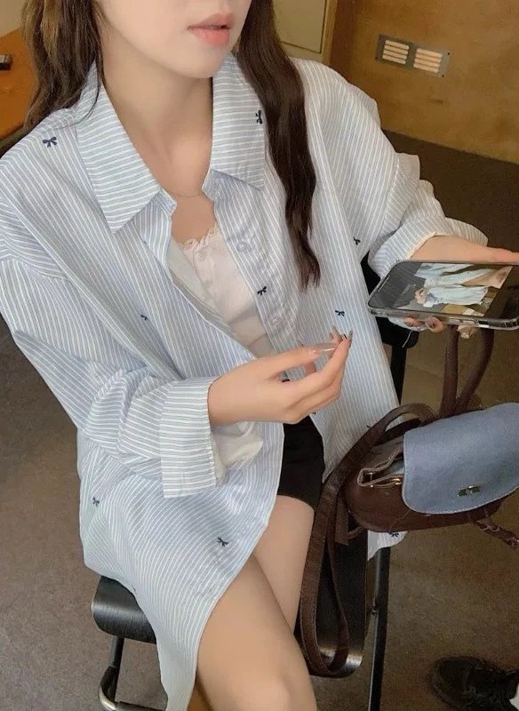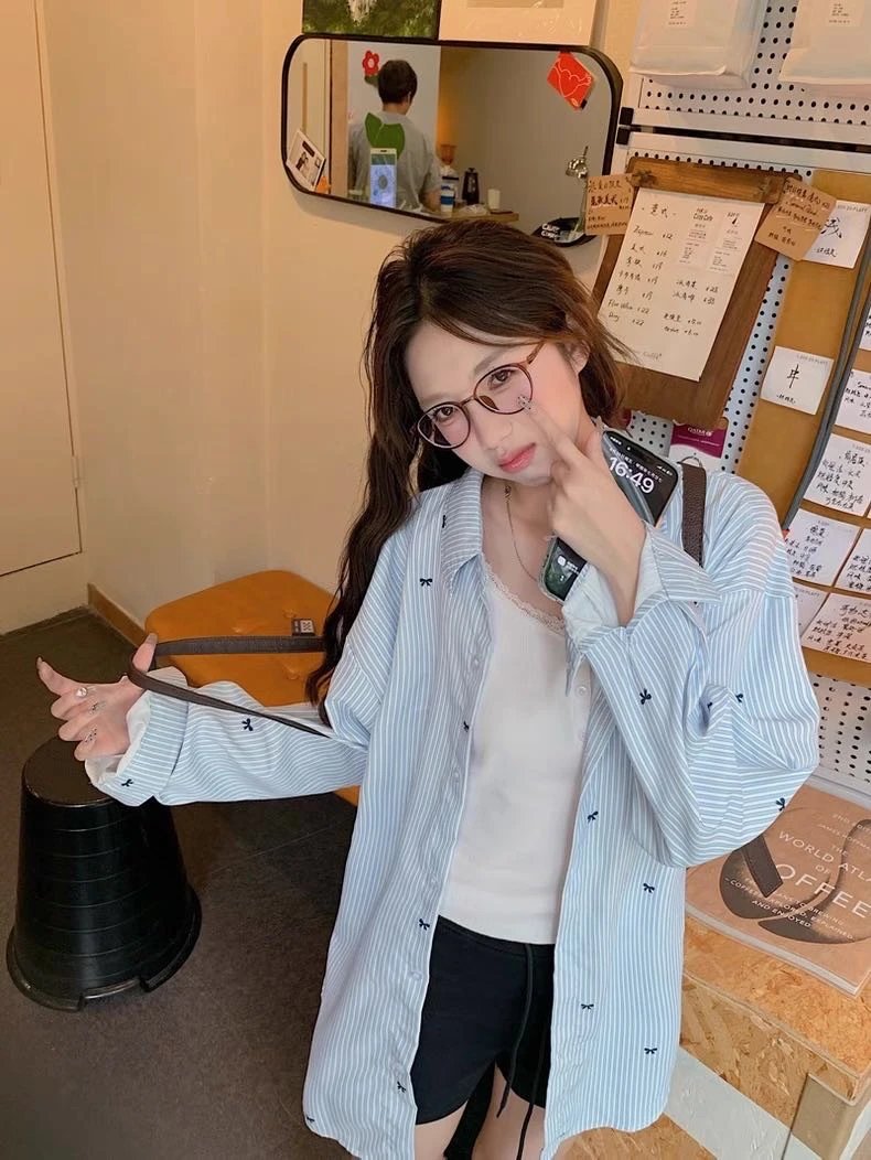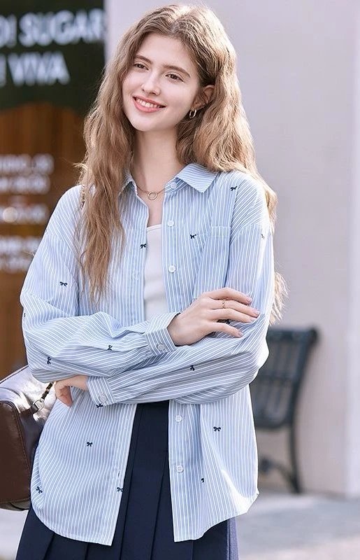 【商品品名】蝴蝶结刺绣条纹衬衫