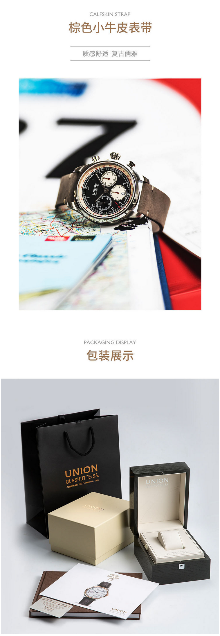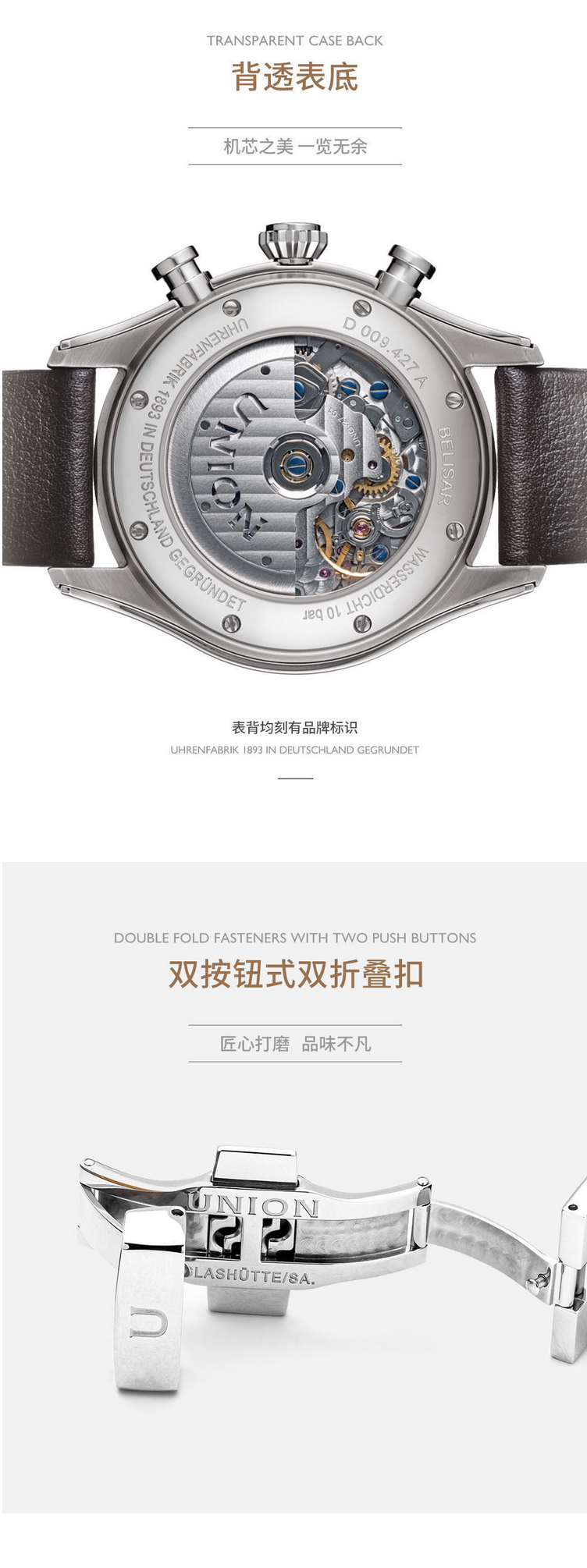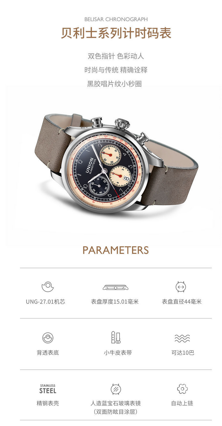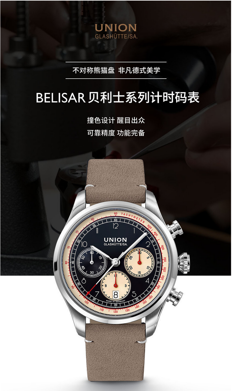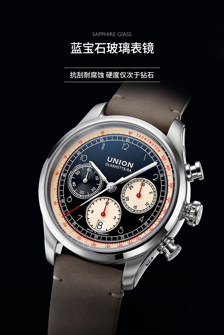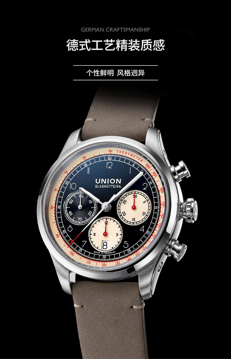 宇联(UNION GLASHÜTTE)德国手表贝利士系列 小牛皮机械男士熊猫盘计时码表 D009.427.16.052.00