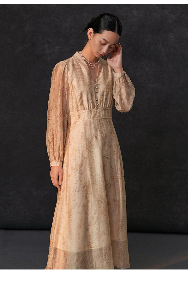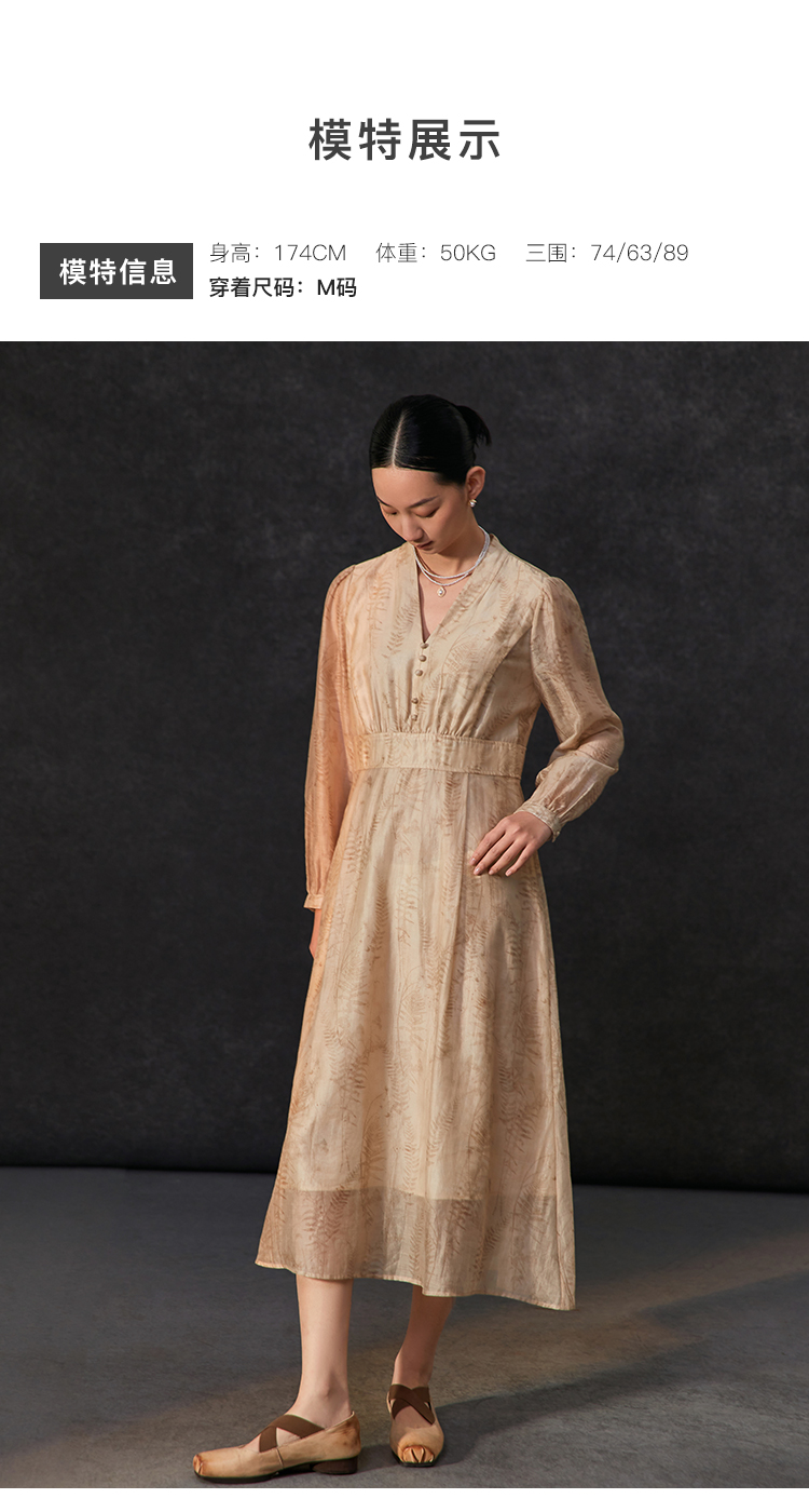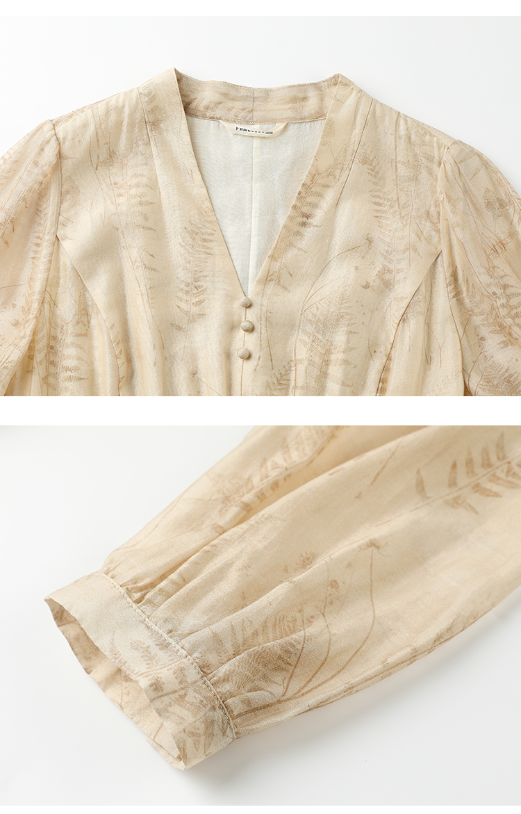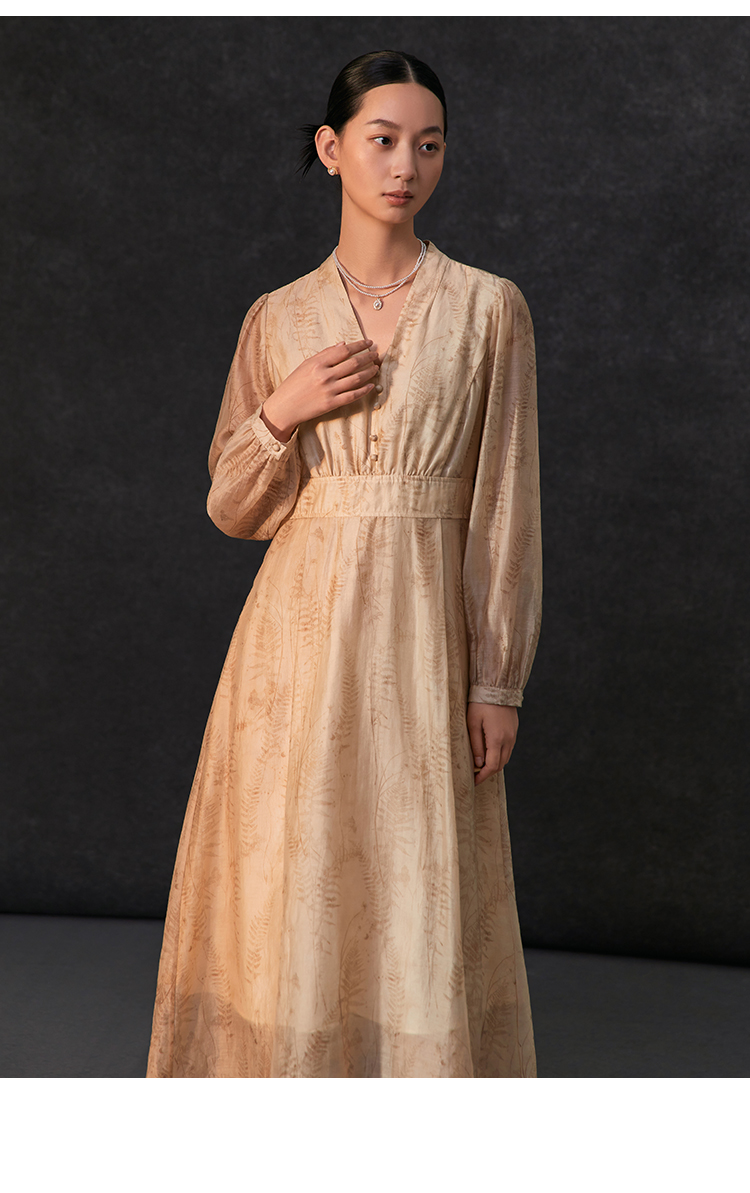 famecoco植物印花天丝混纺连身长裙女优雅v领连衣裙FAC1FA008