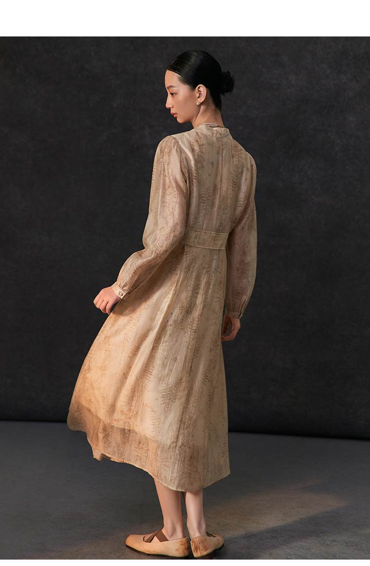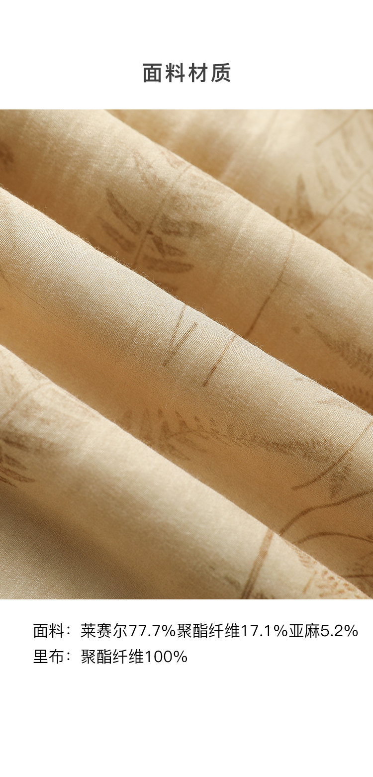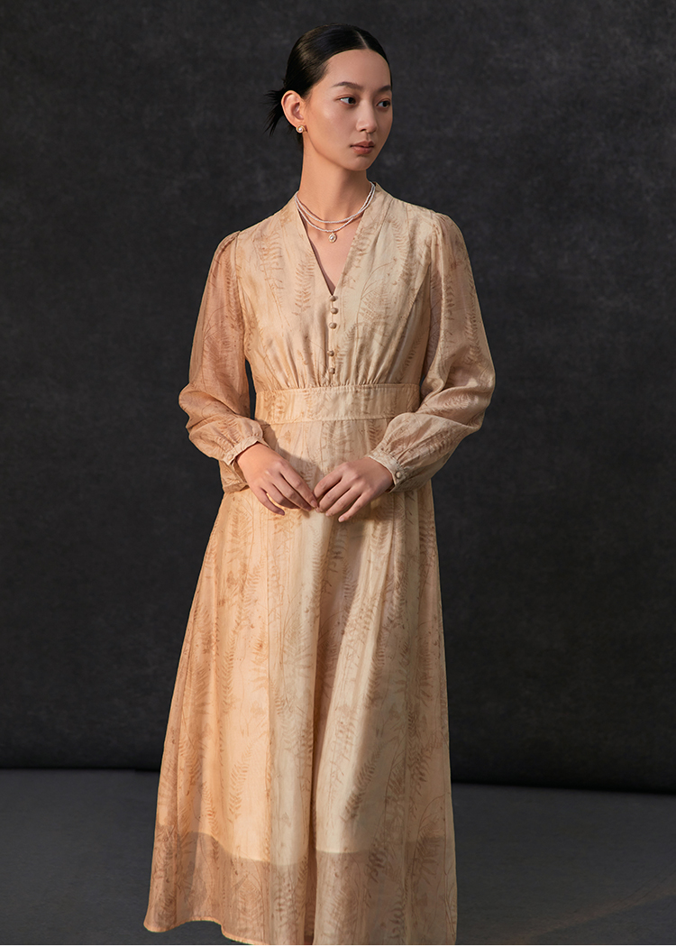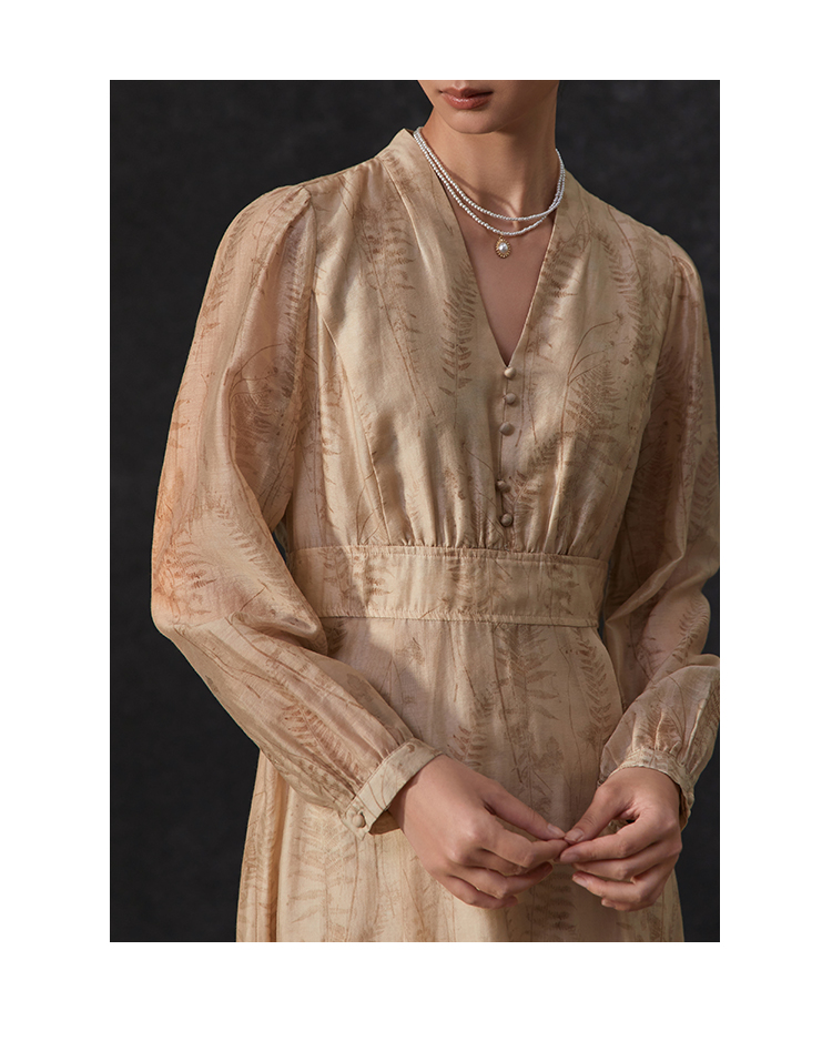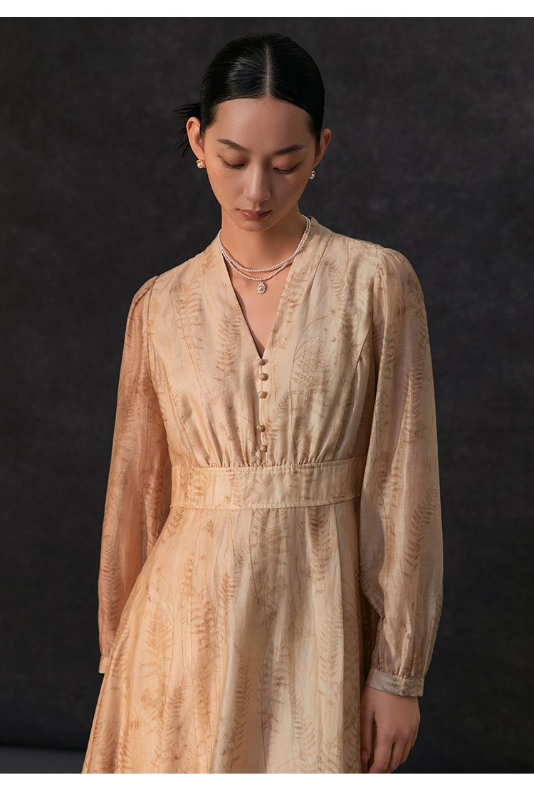 famecoco植物印花天丝混纺连身长裙女优雅v领连衣裙FAC1FA008