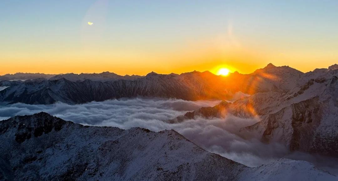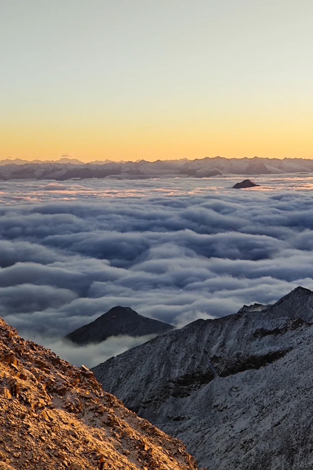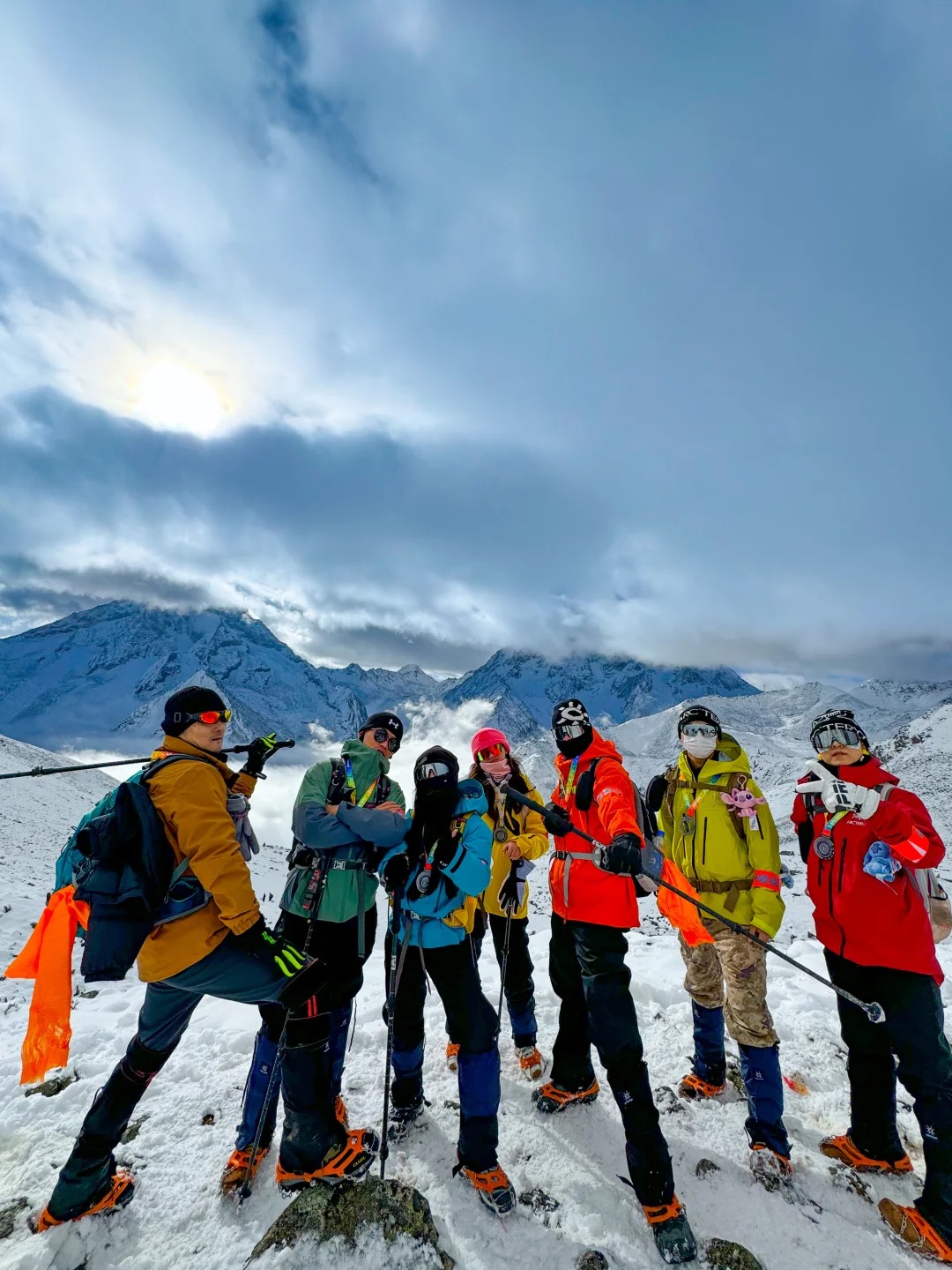 登顶的瞬间,5210米的高空之上,天地豁然开朗:脚下是连绵起伏的雪山群峰,每一座山峰都被白雪覆盖,棱角分明