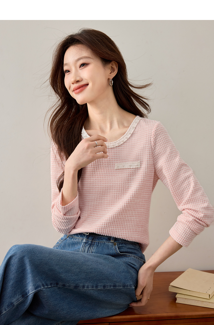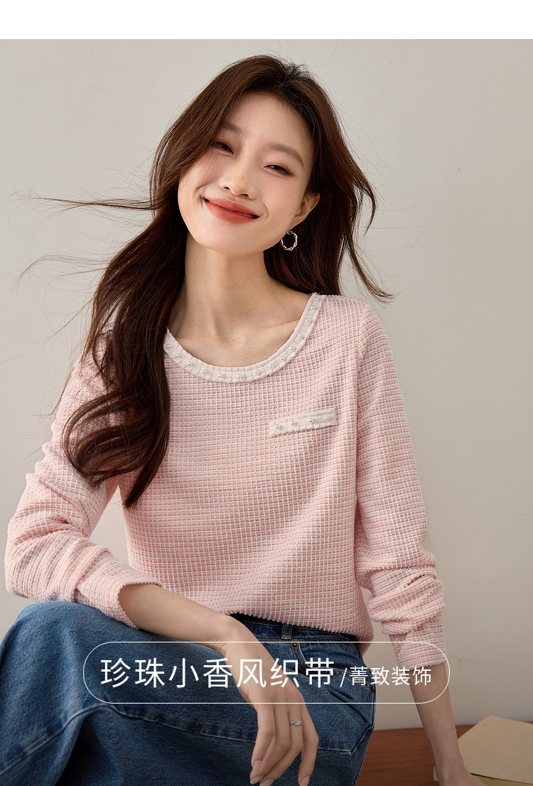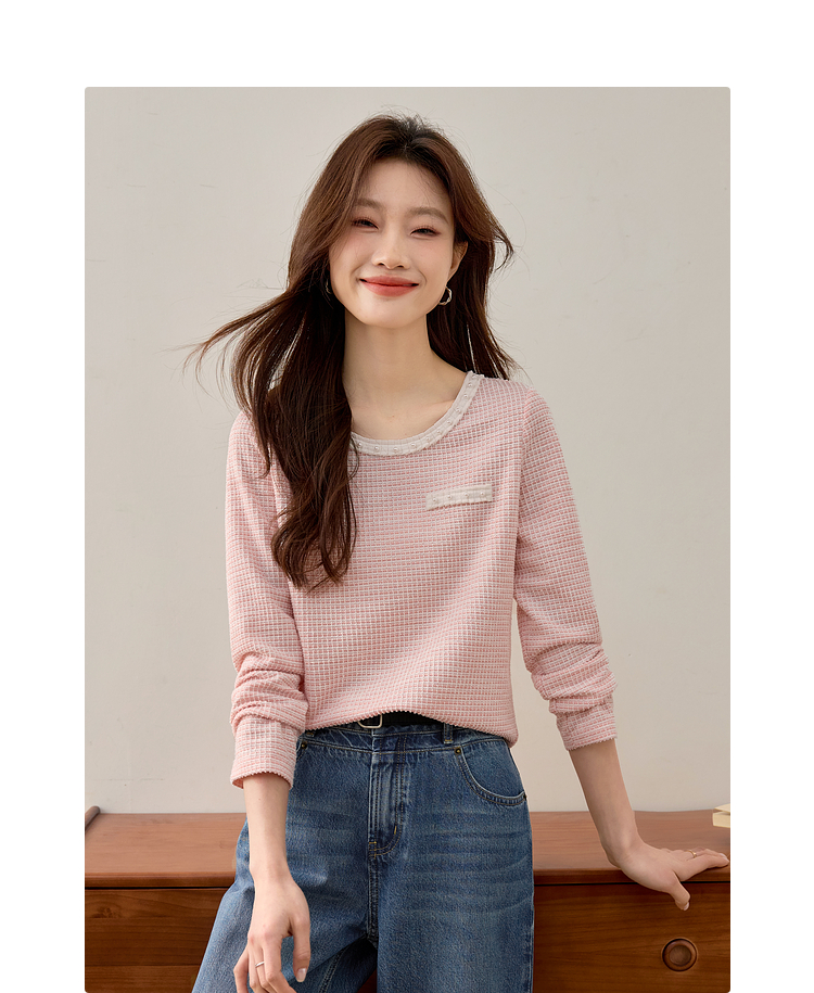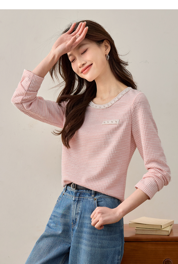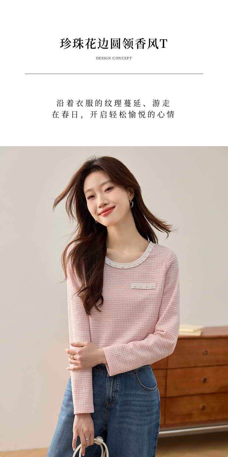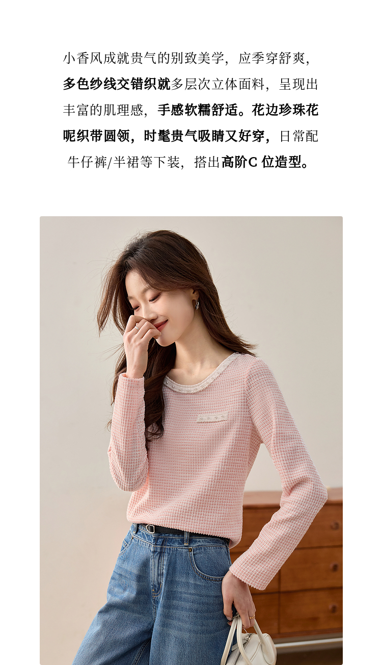 【年终特卖】熙世界2025春秋新款小香风圆领针织T恤女长袖休闲肌理感正肩上衣