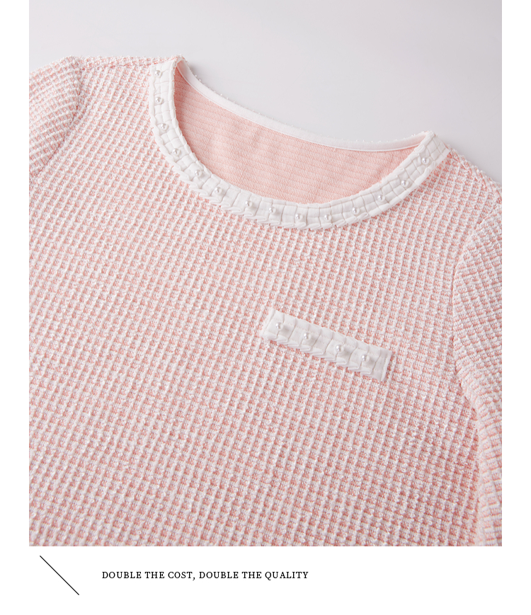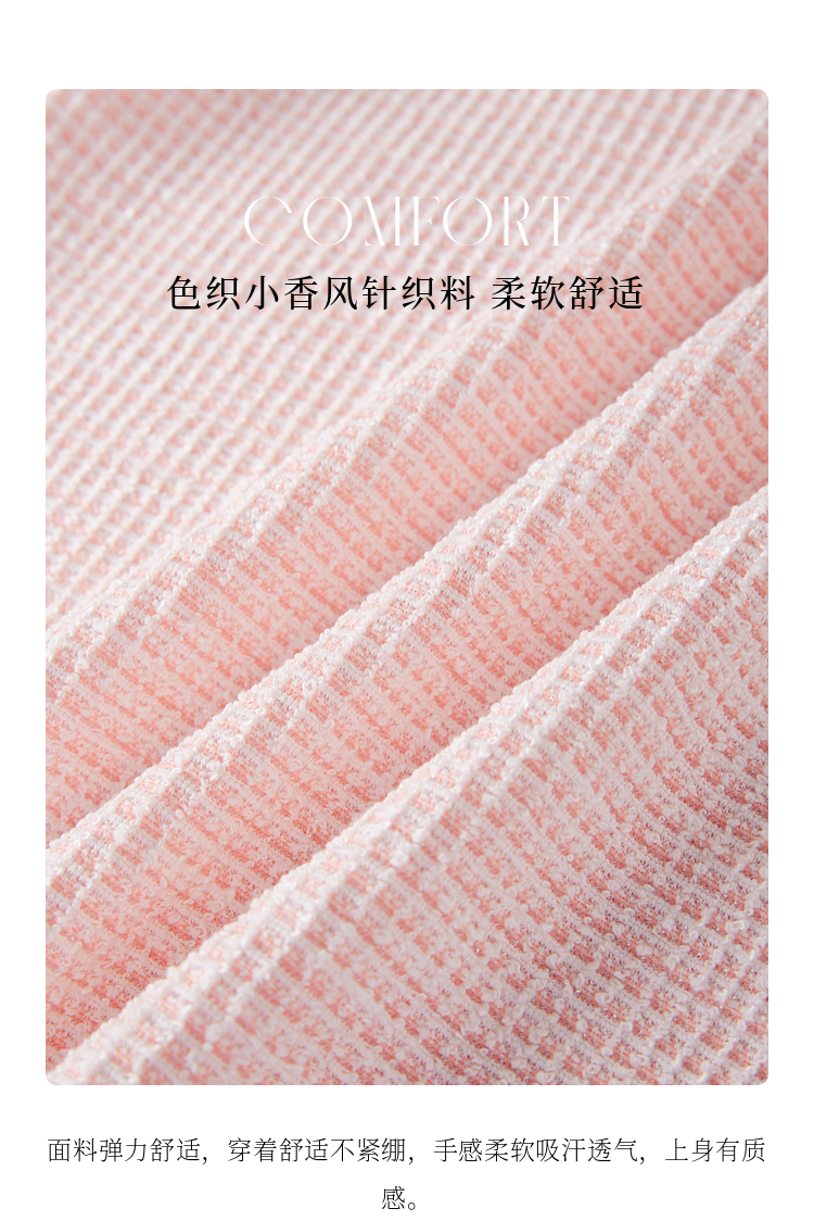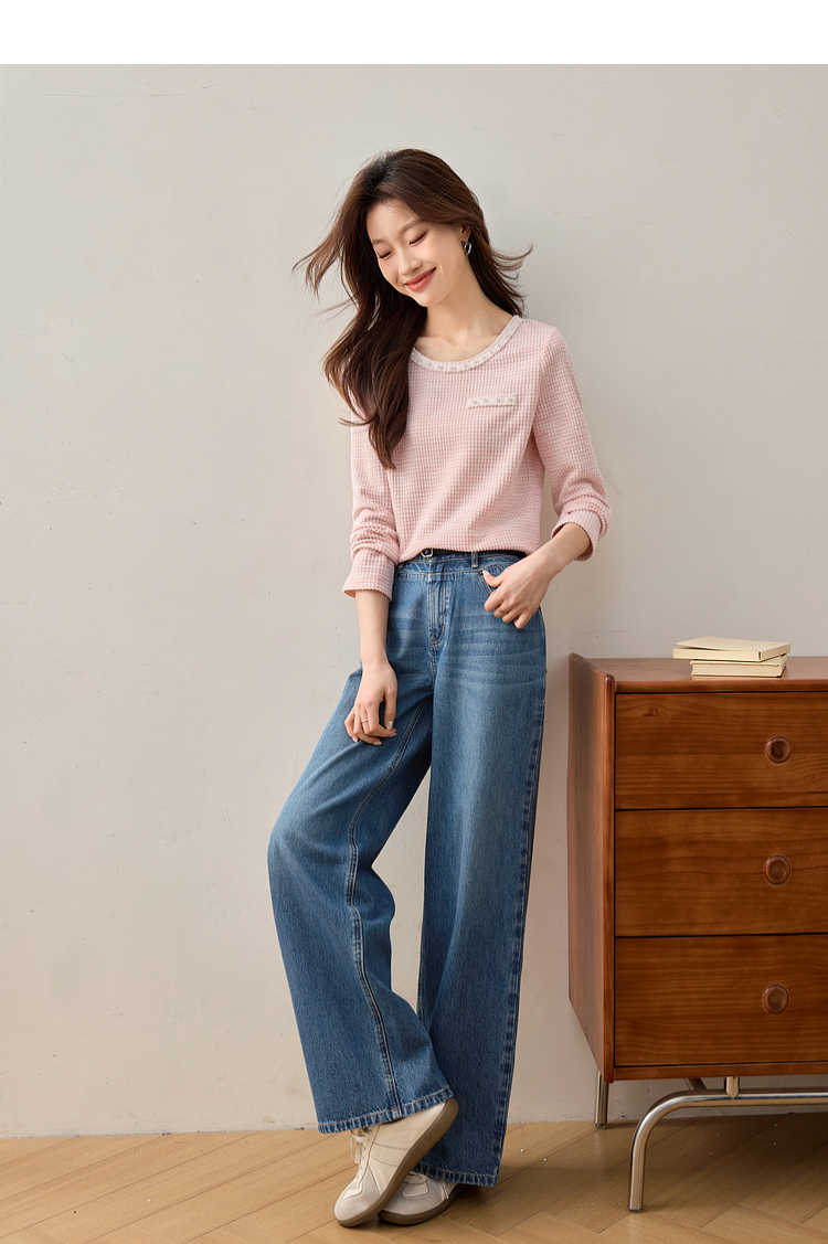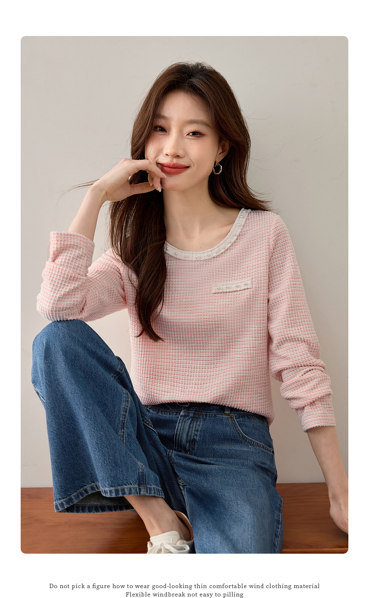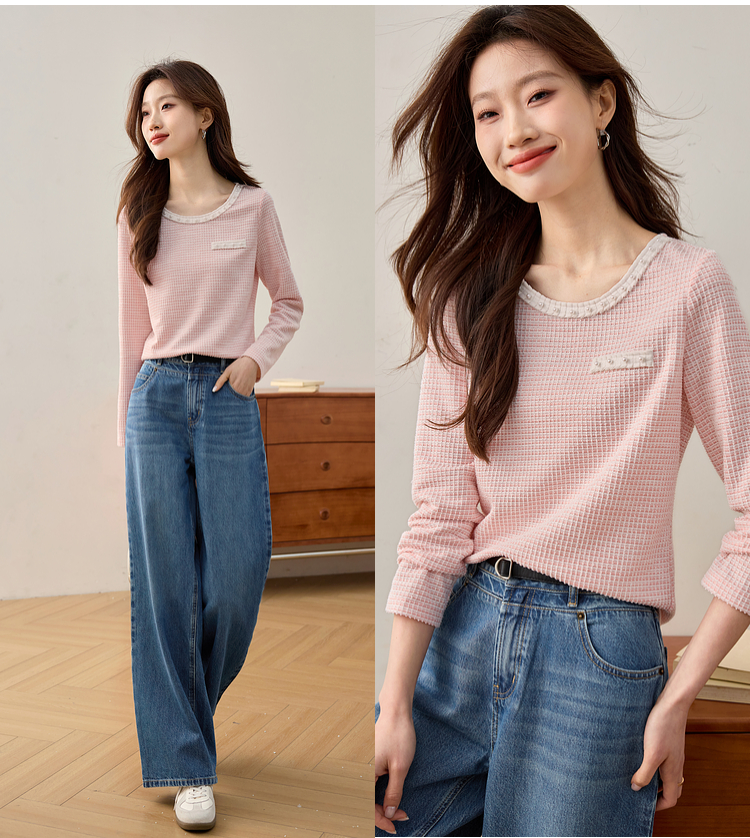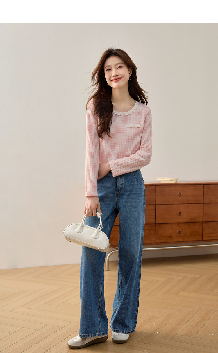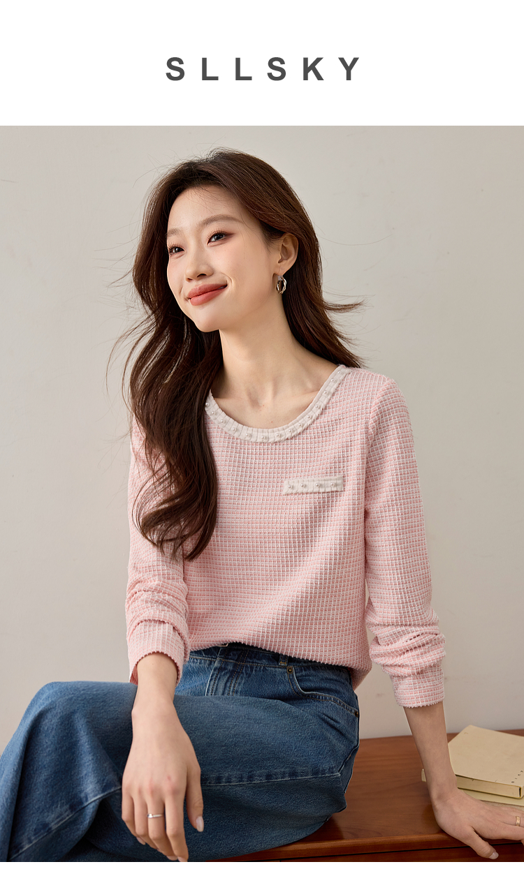 【年终特卖】熙世界2025春秋新款小香风圆领针织T恤女长袖休闲肌理感正肩上衣