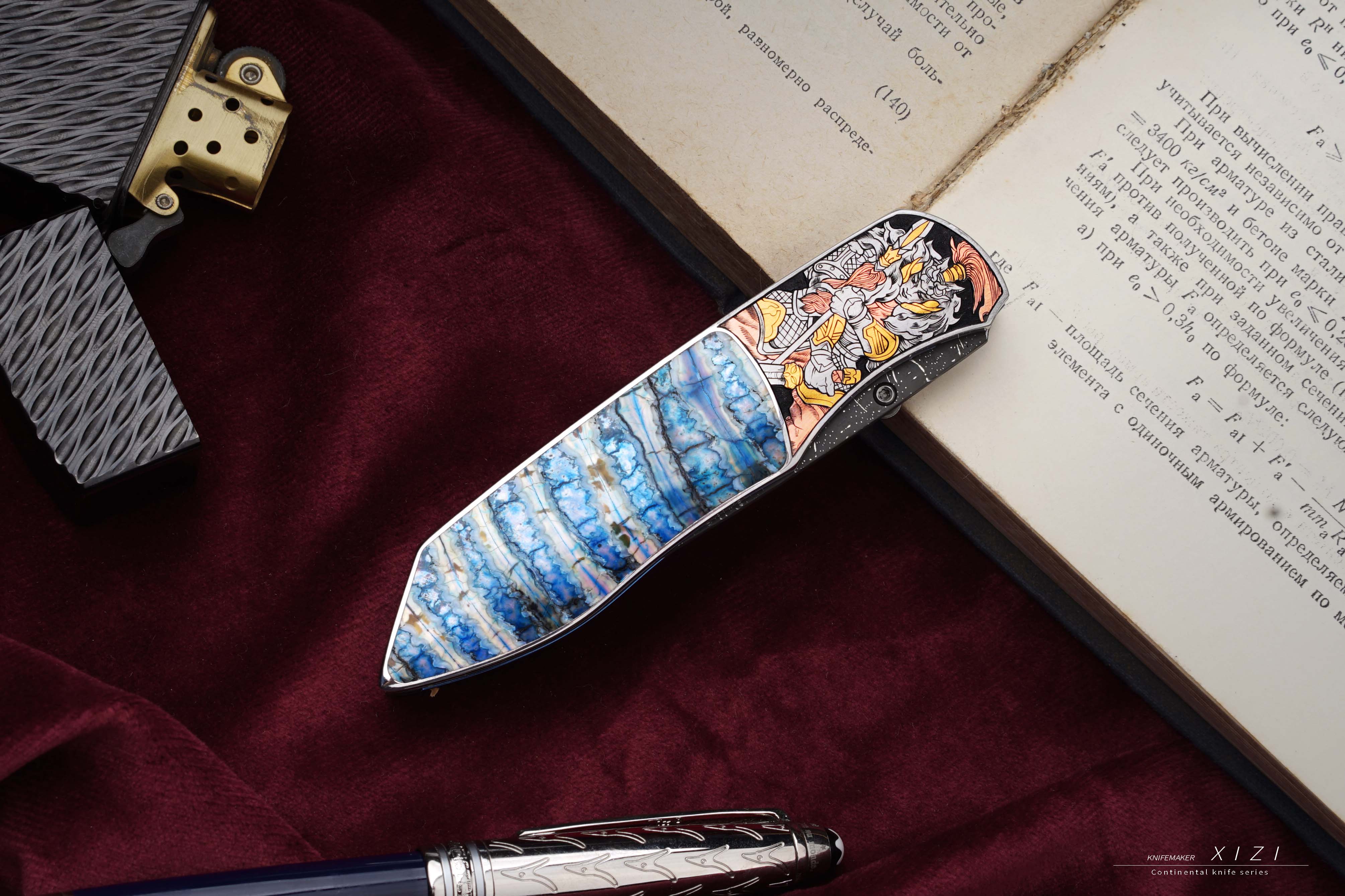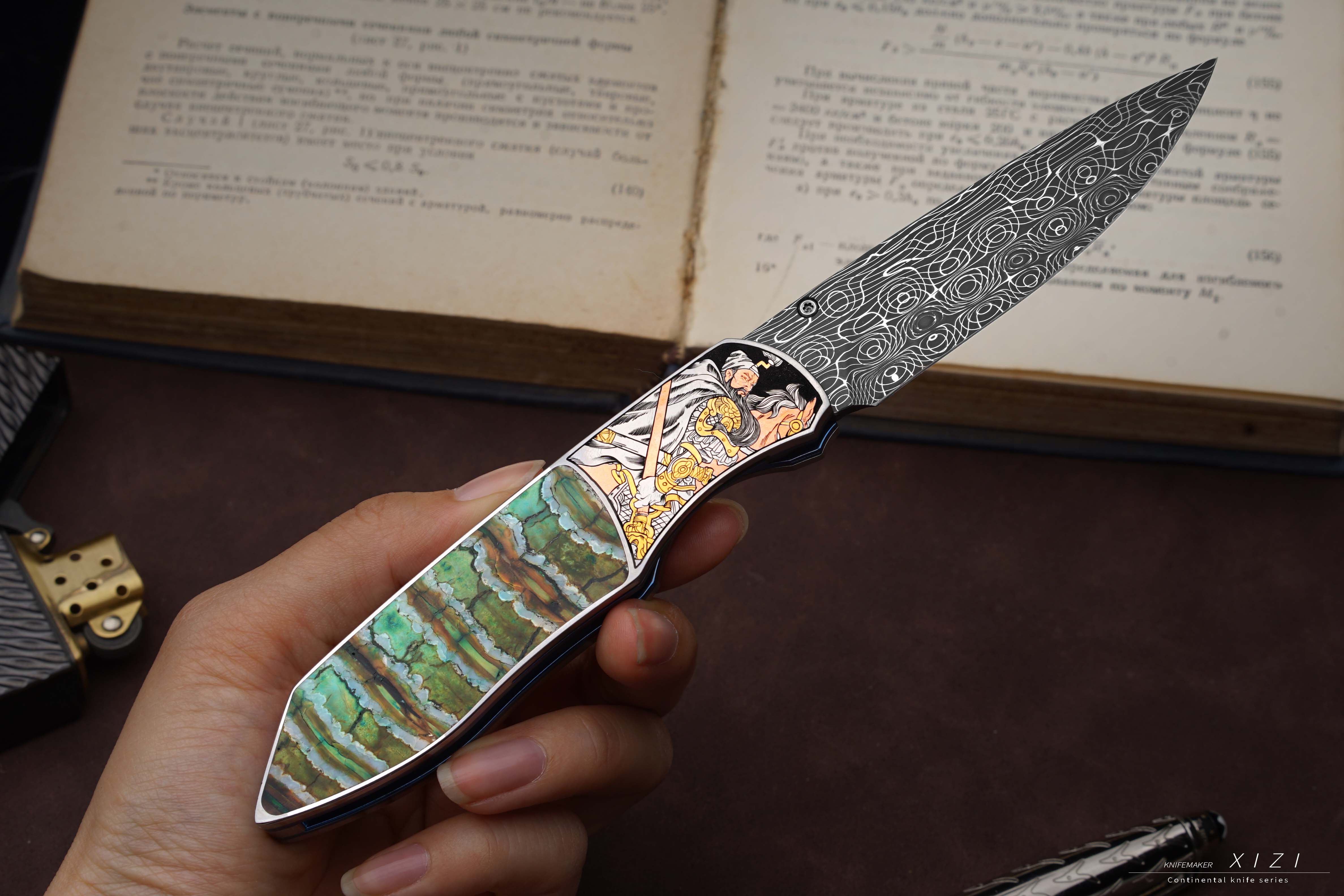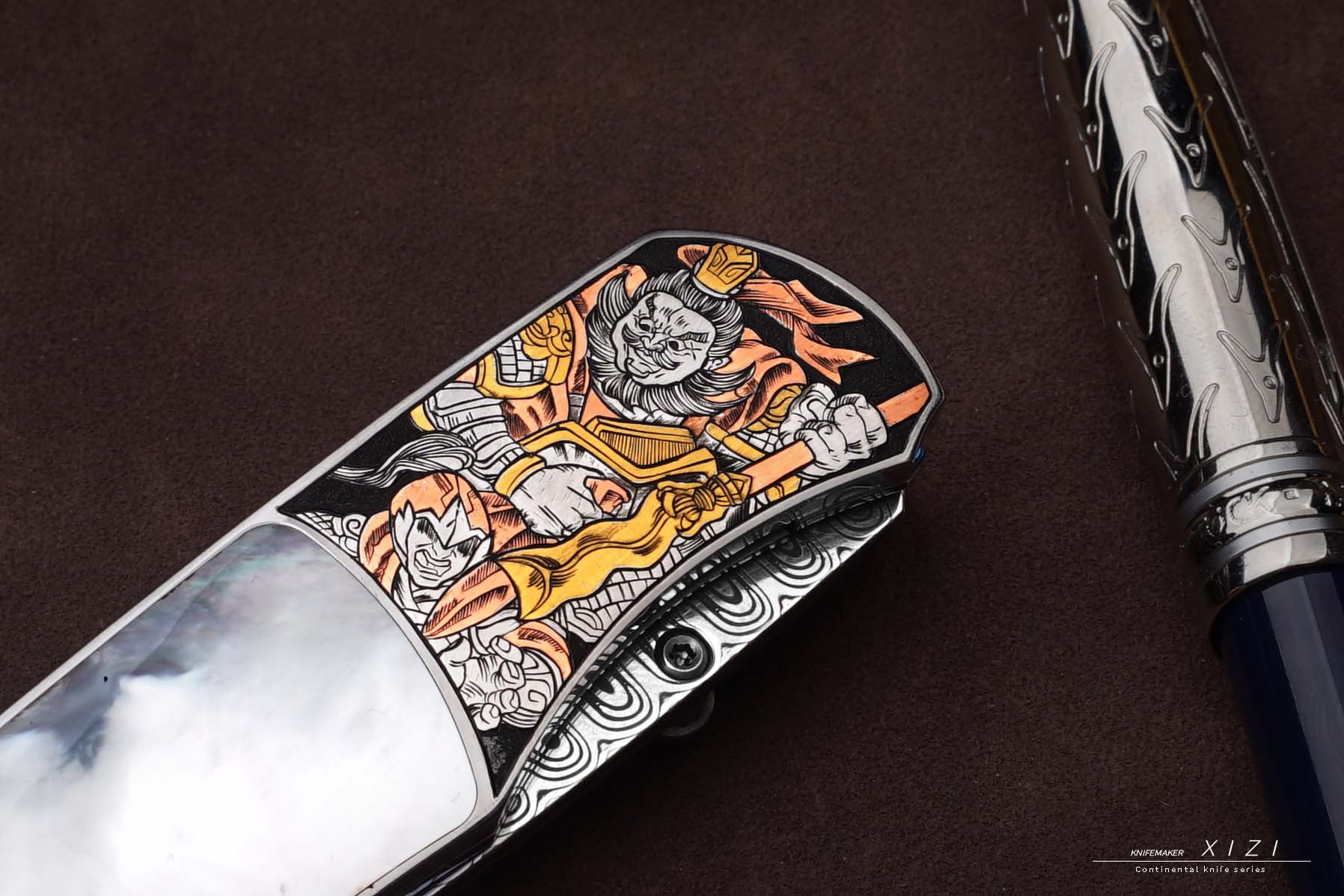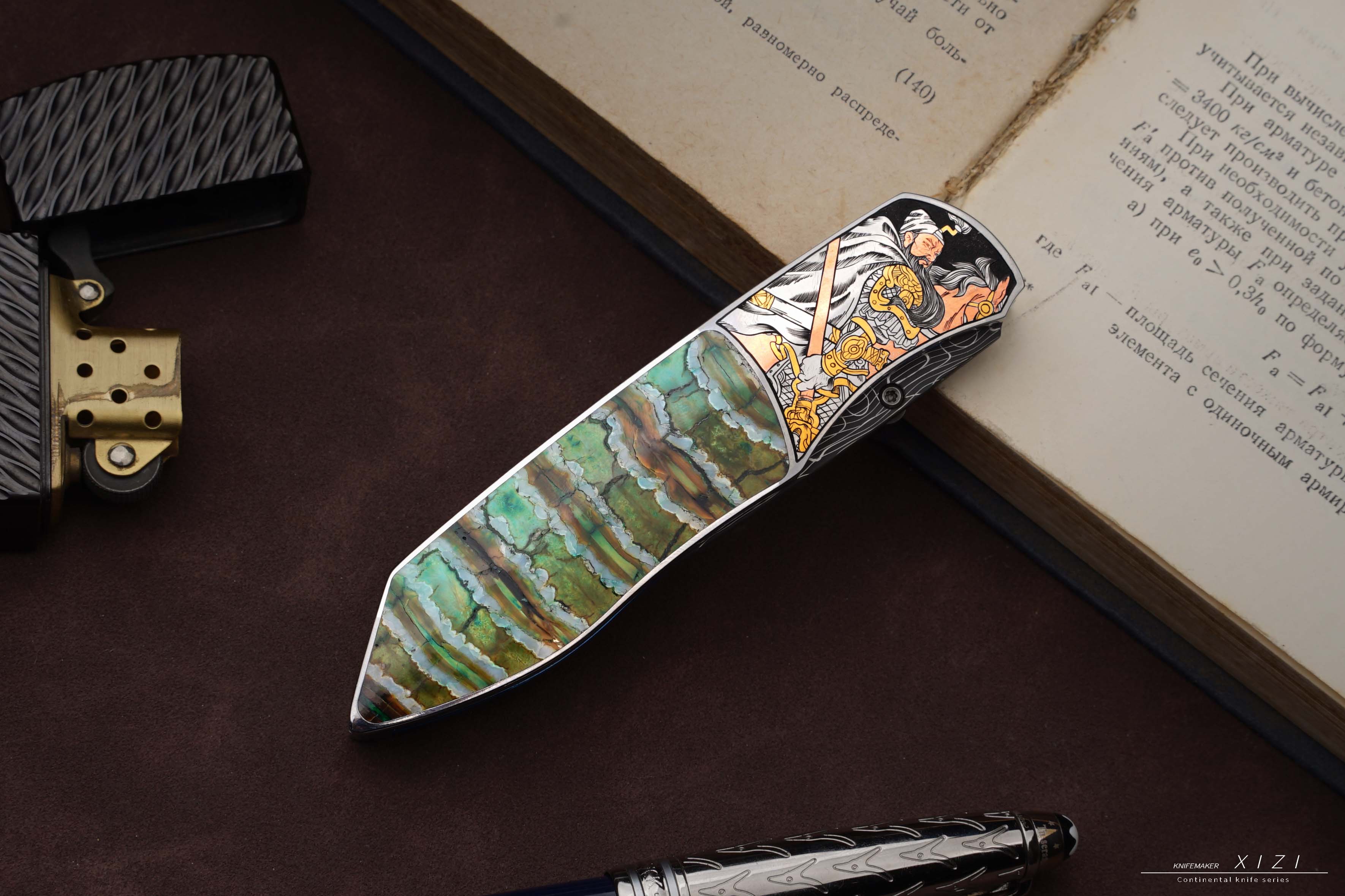 价格非常合适,经典的刀形,三国题材—五虎上将,赵云、关羽、张飞、马超、黄忠,全手工雕刻,镶嵌24k真金