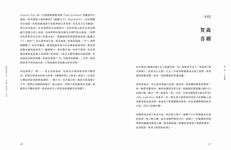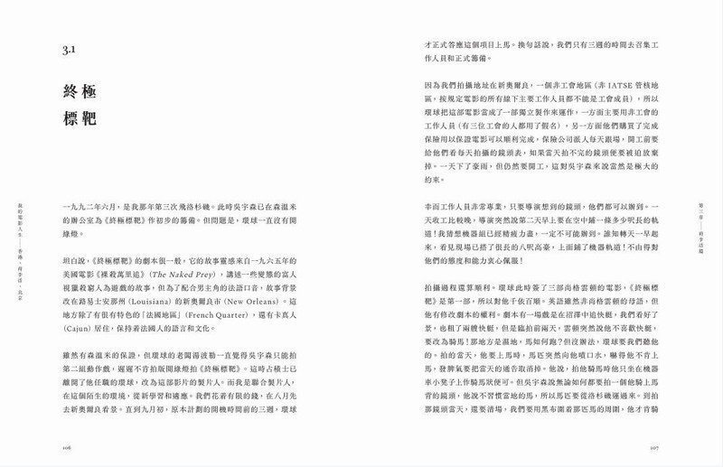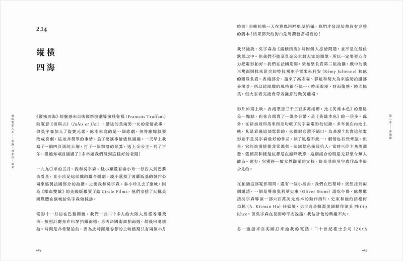 本書以他的電影人生為主軸,訴說他於三地製作電影的經歷,當中不乏經驗之談。