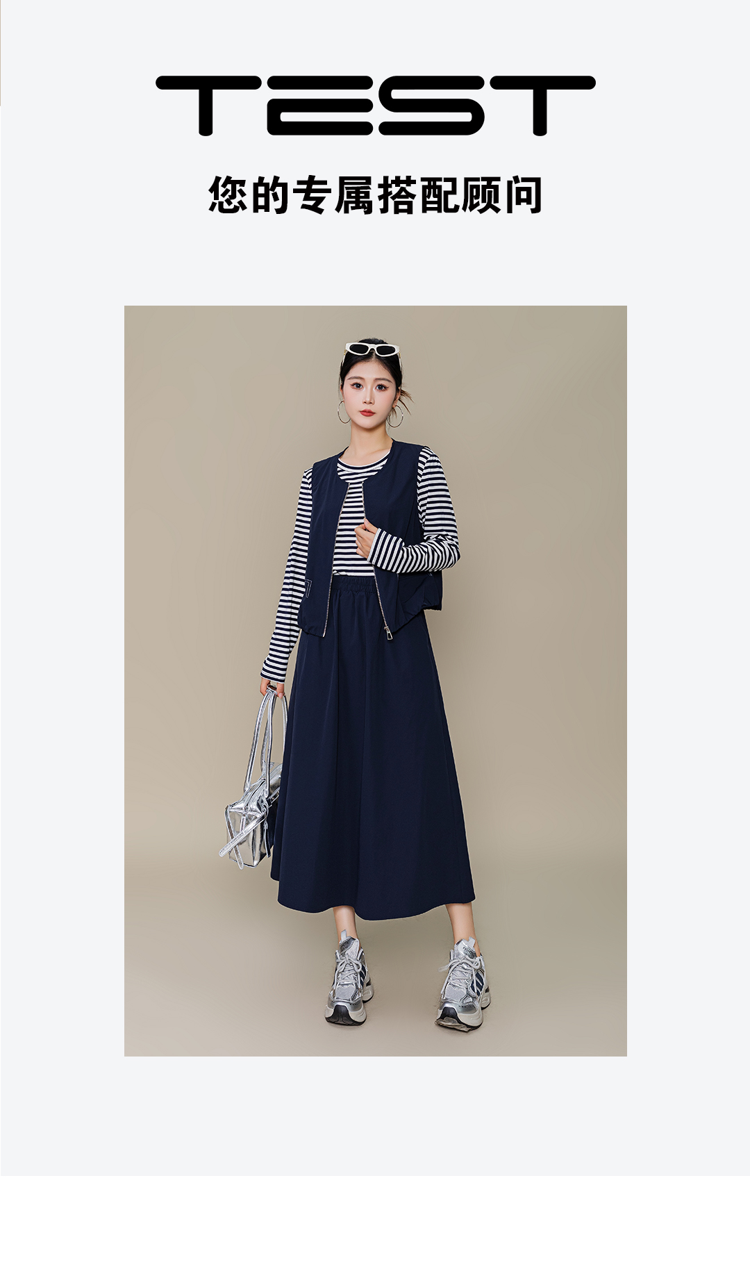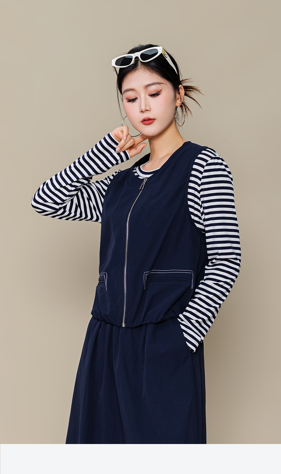 秋上新时尚条纹打底衫搭配藏青色拉链马甲套装裙4253030