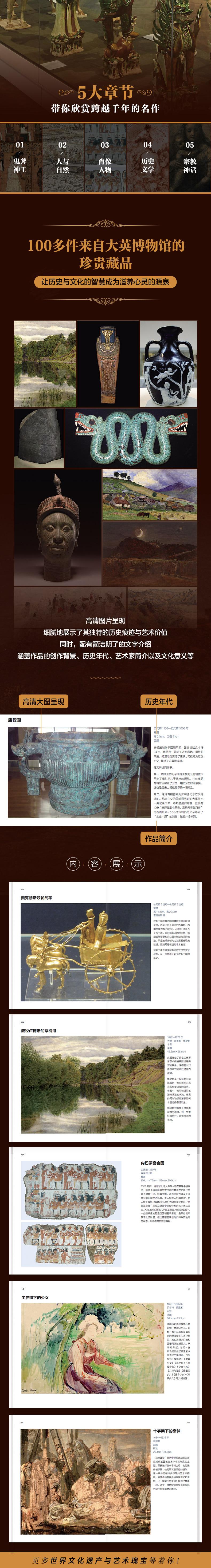本书是一本专为艺术爱好者及历史探索者打造的精美画册,特别适合那些渴望随时随地探索世界文化遗产与艺术瑰宝的人士。书中精选了超过100件来自大英博物馆的珍贵藏品,每一幅作品都通过高清图片呈现,细腻地展示了其独特的历史痕迹与艺术价值。同时,配有简洁明了的文字介绍,涵盖作品的创作背景、历史年代、艺术家简介以及文化意义等,使读者在轻松的阅读中,即可穿越时空,领略人类文明的辉煌与多样。