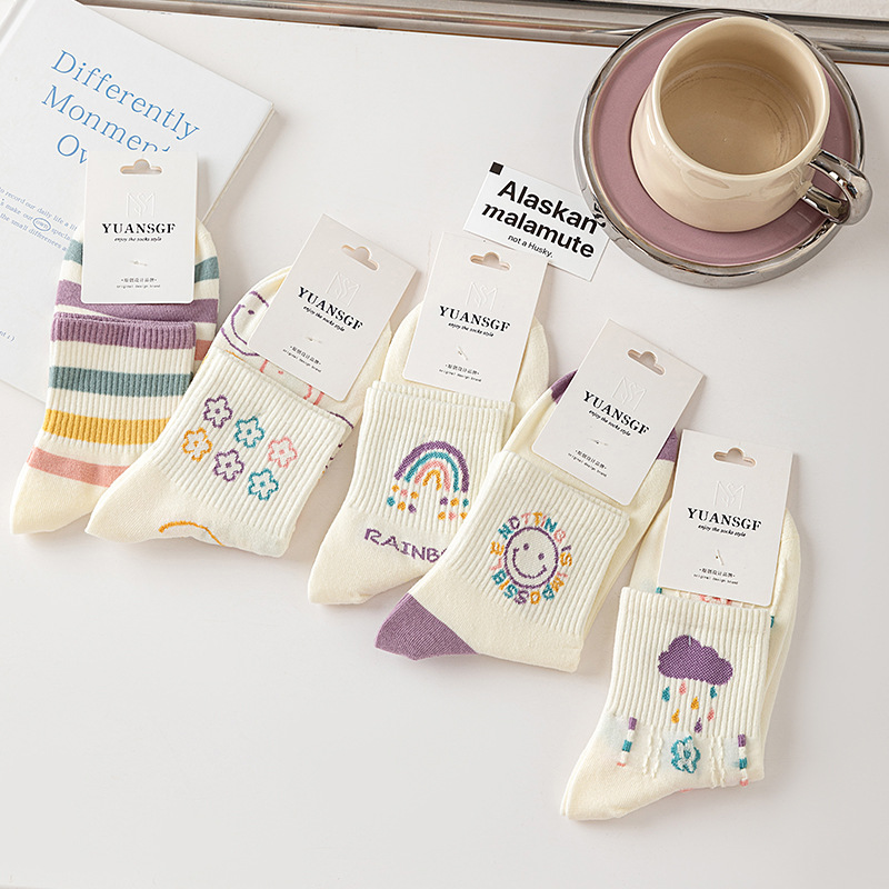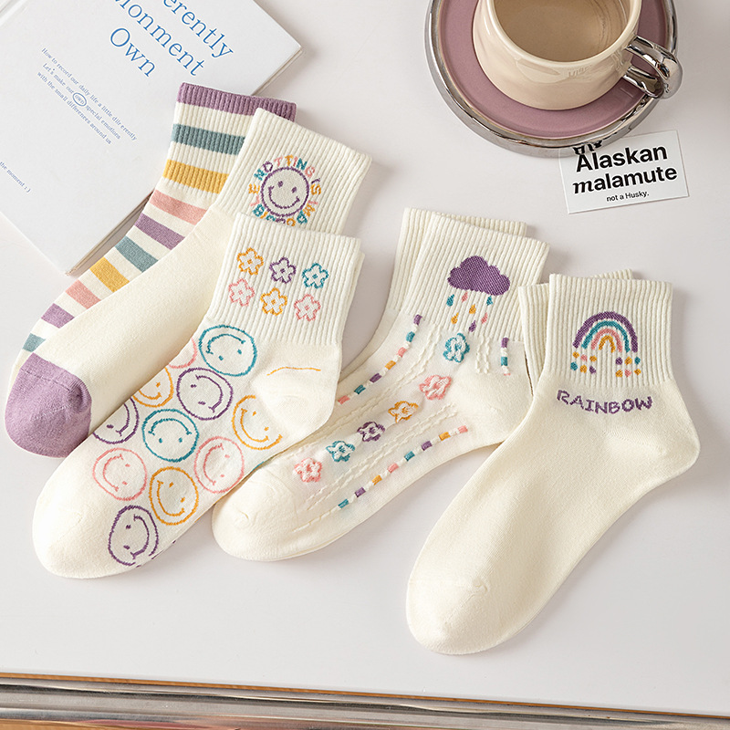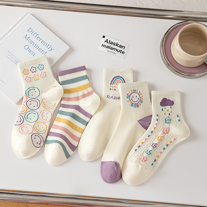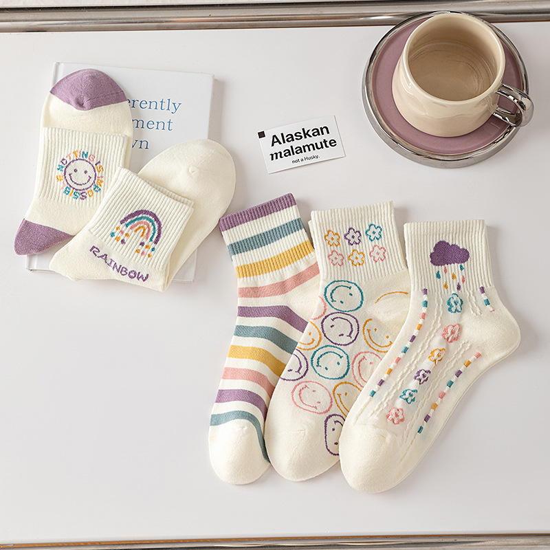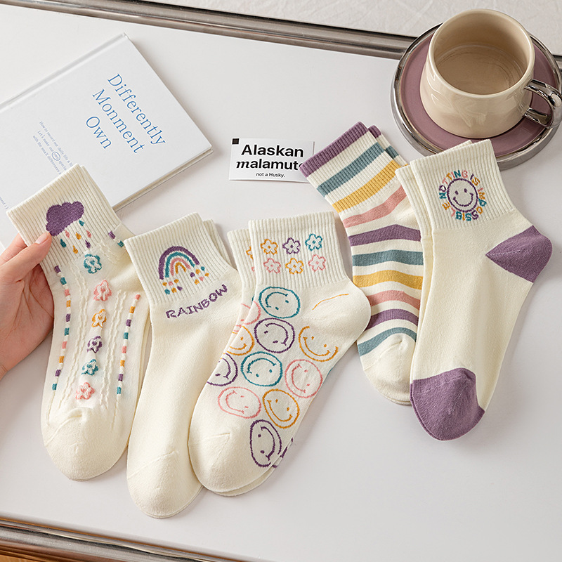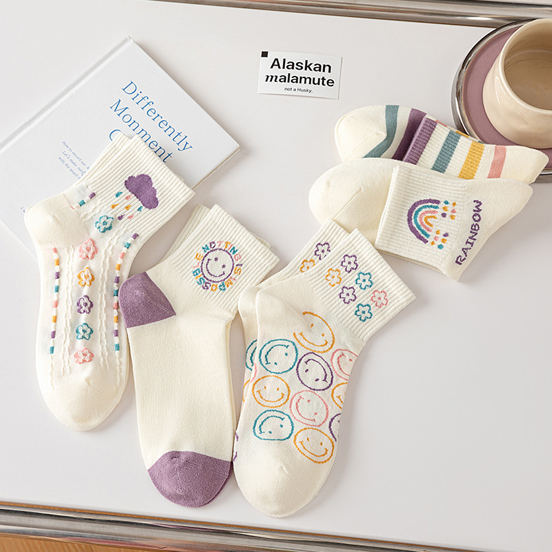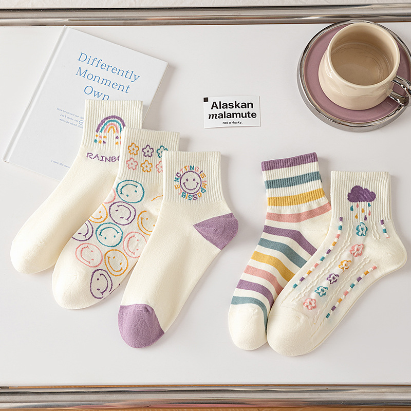 秋冬【精梳棉中筒袜】学院风女士学生运动袜子 日系卡通笑脸袜子