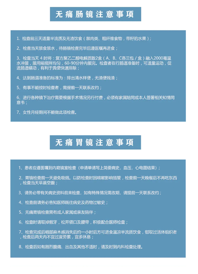 2、无痛肠镜、无痛胃肠镜检查前需要进行充分的肠道清洁,注意相关事项,当天来不可以做,需要来院两次。