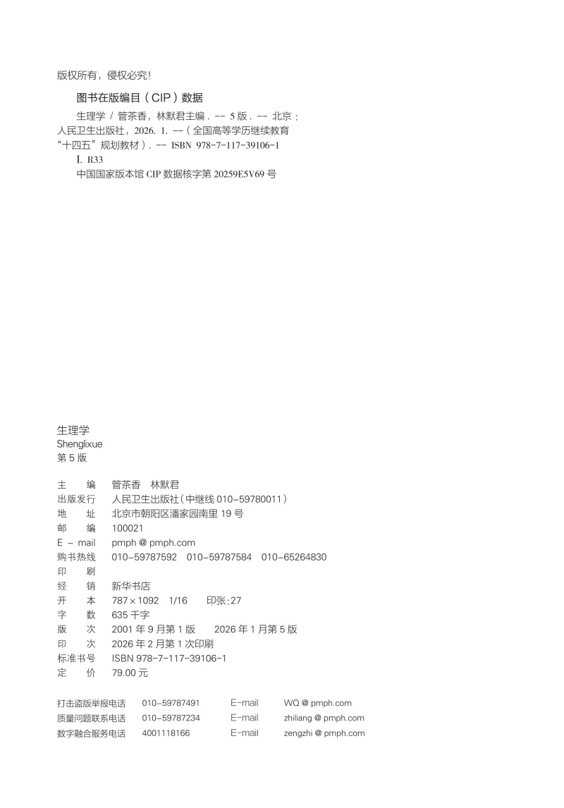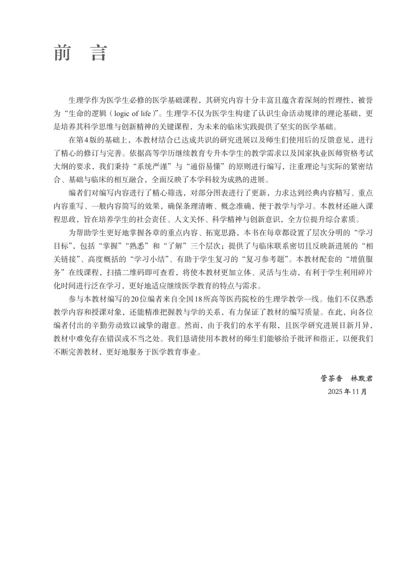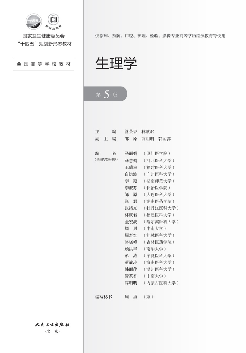 生理学 第5五版 十四五规划新形态教材全国高等学校教材 管茶香 林默君 供临床预防影像专业高等学历继续教育等使用人民卫生出版社