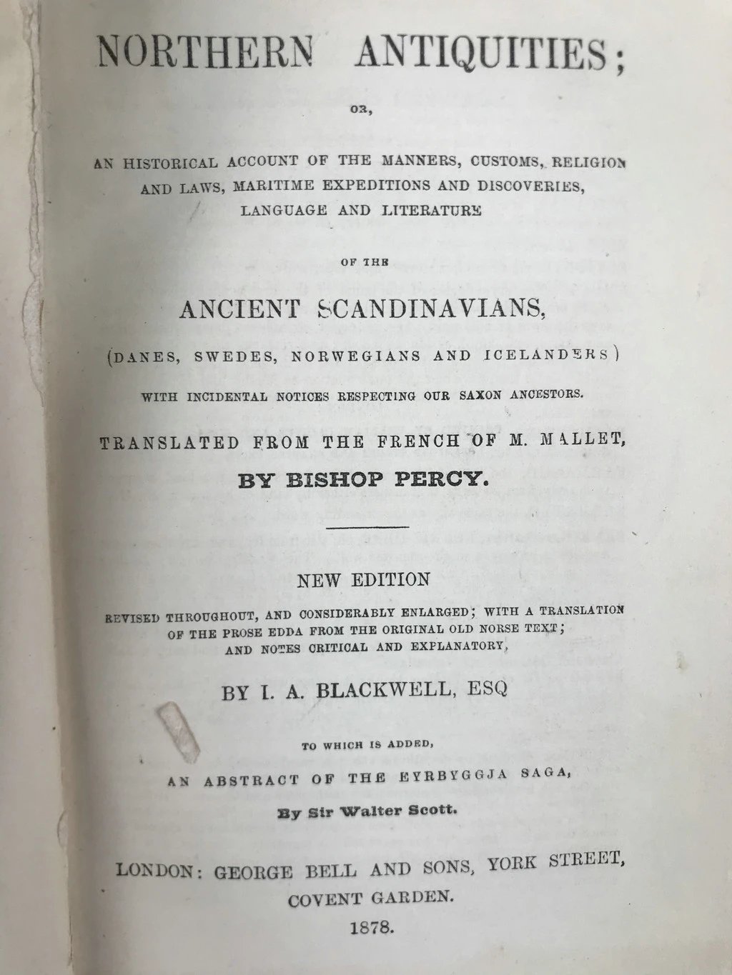 书籍全名《北方古物志:古代斯堪的纳维亚人(丹麦人、瑞典人、挪威人、冰岛人)的风俗、宗教、法律、海上探险、语言与文学史》,本书源自法国学者马利特的法语原作,经珀西主教英译后,又由布莱克韦尔补充了《散文埃达》的译本,司各特爵士还增补了《定居记》(Eyrbyggja Saga)的摘要,是19世纪研究北欧神话与维京文化的权威文本。本书系统整理了北欧的历史、神话与文学,首次将《散文埃达》等重要北欧文献引入英语世界,对后来托尔金等作家的创作产生了深远影响。