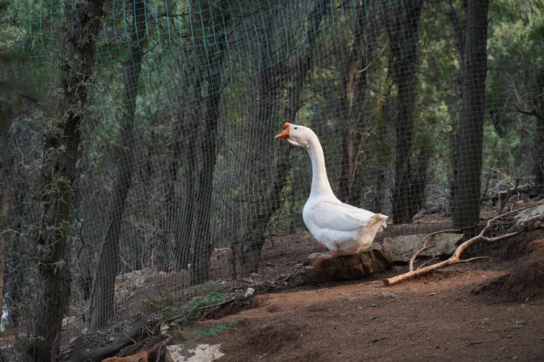 每个鸡舍都配有2只大鹅防止黄鼠狼、老鹰等野生动物的攻击