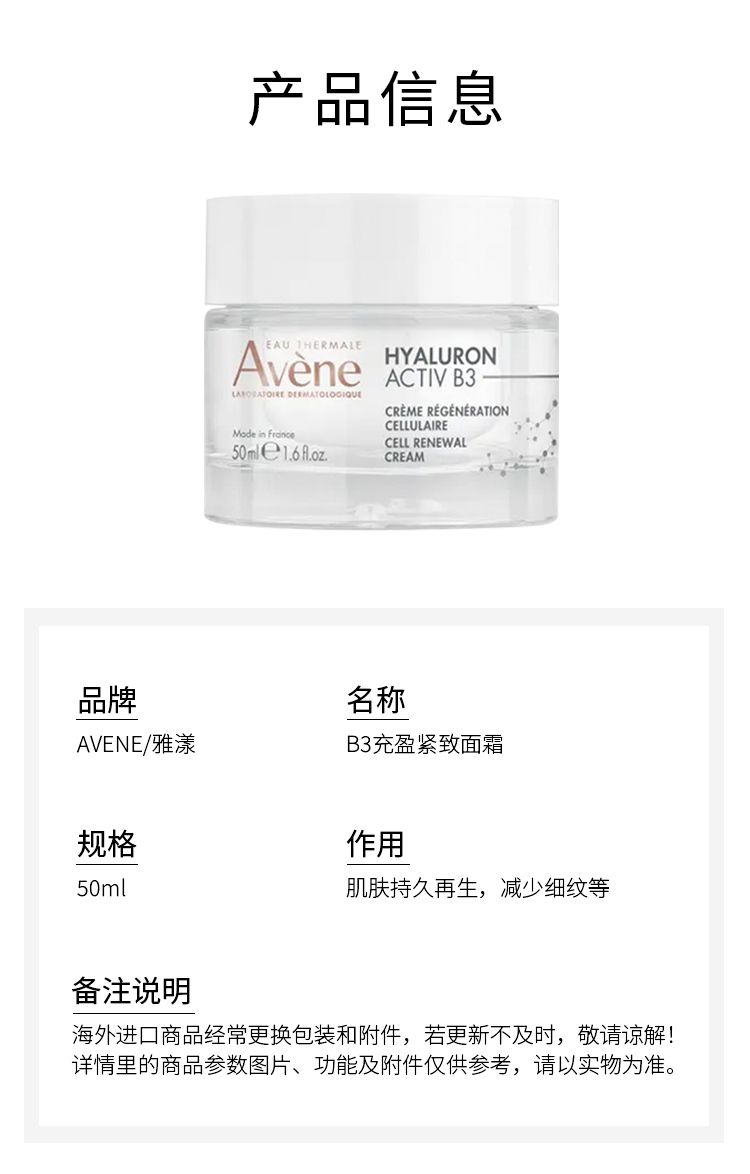 【预售 急单慎拍】Avene雅漾B3充盈紧致面霜 抚平细纹补水填充 50ml