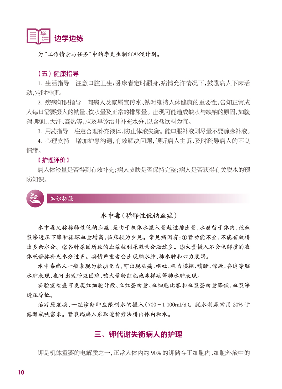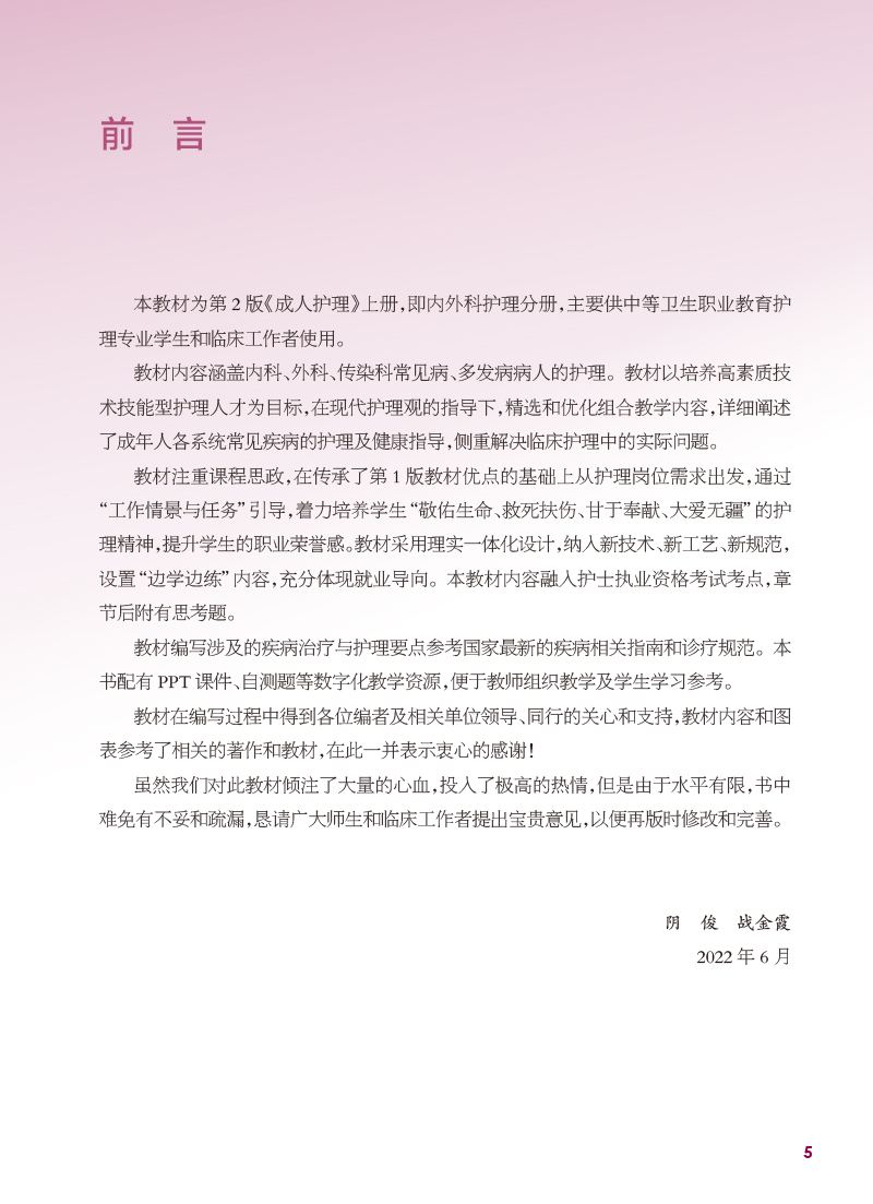 本轮教材修订编写按照《习近平新时代中国特色社会主义思想进课程教材指南》要求,坚持“三基、五性”的原则,依据专业教学标准,以人才培养目标为导向,以职业技能的培养为根本,满足岗位需要、学教需要、社会需要,体现中等卫生职业教育的类型特色,运用现代信息技术创新教材呈现形式。本教材注重不同层次之间、不同教材之间的衔接,与护士执业资格考试紧密接轨。教材内容涵盖所有执业护士考点,且通过章末护考模拟或配套教材的大量习题帮助学生掌握执业护士考试的考点,提高学习效率和效果。