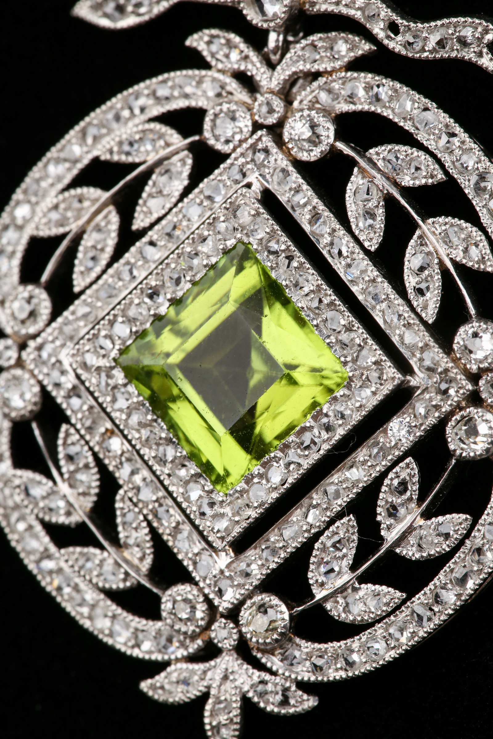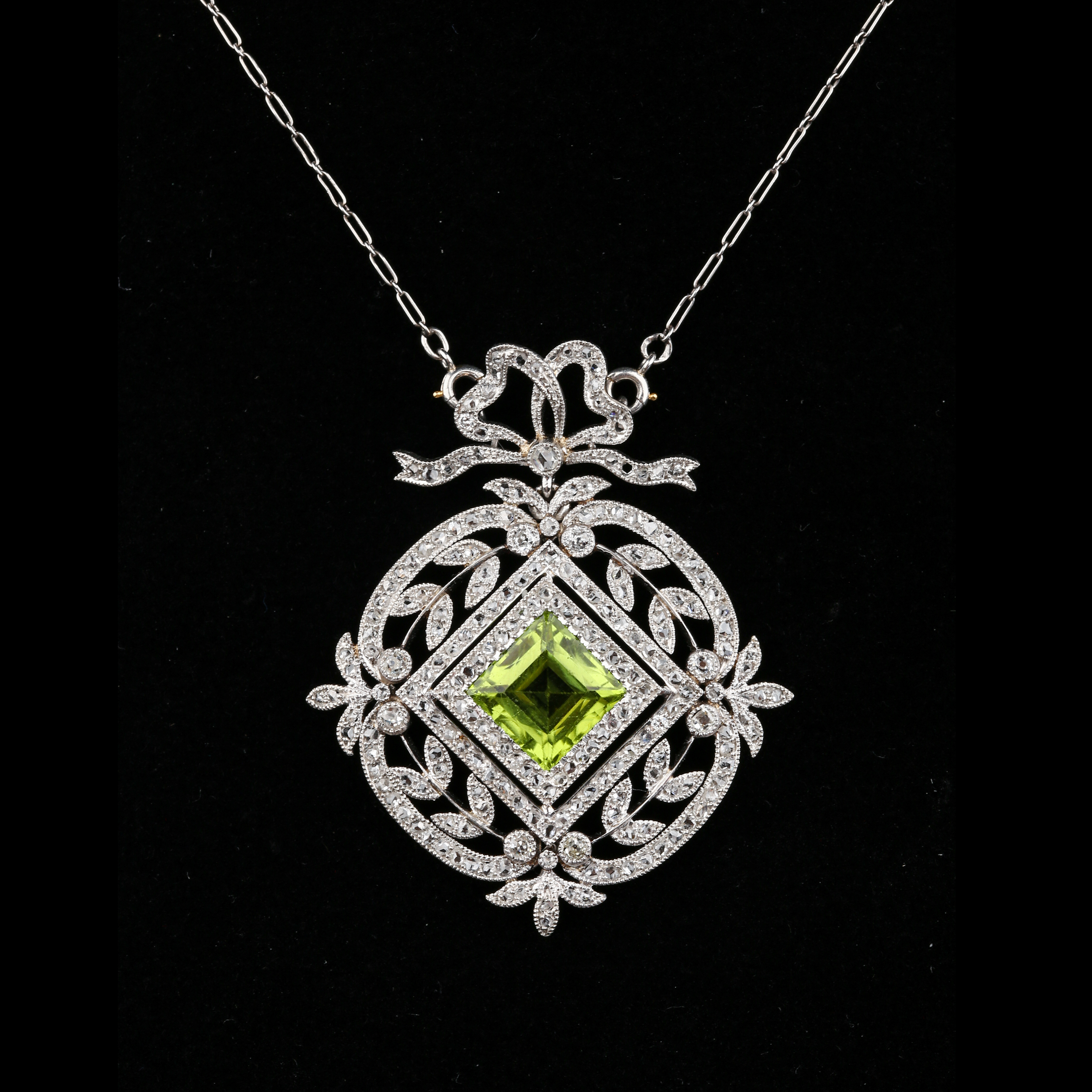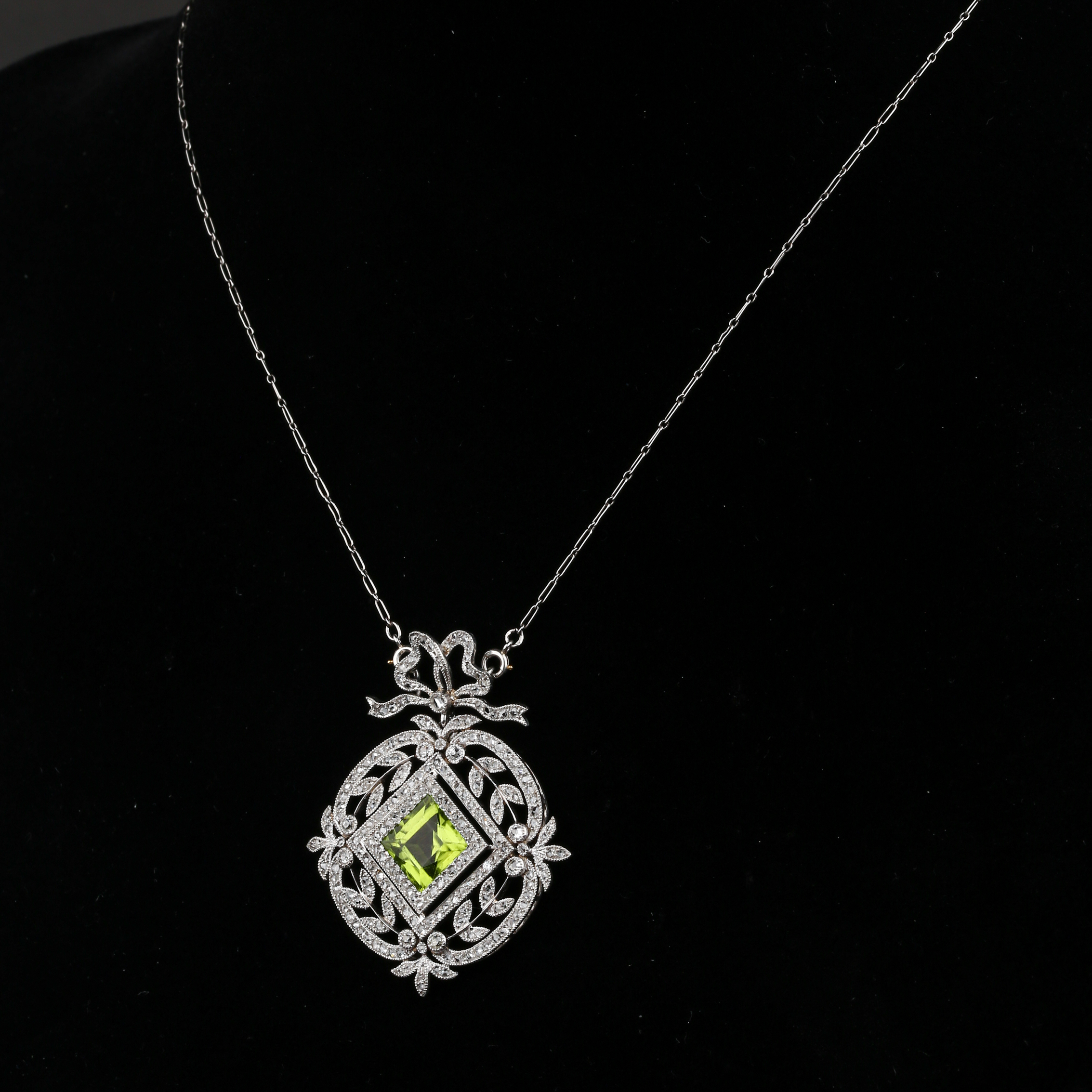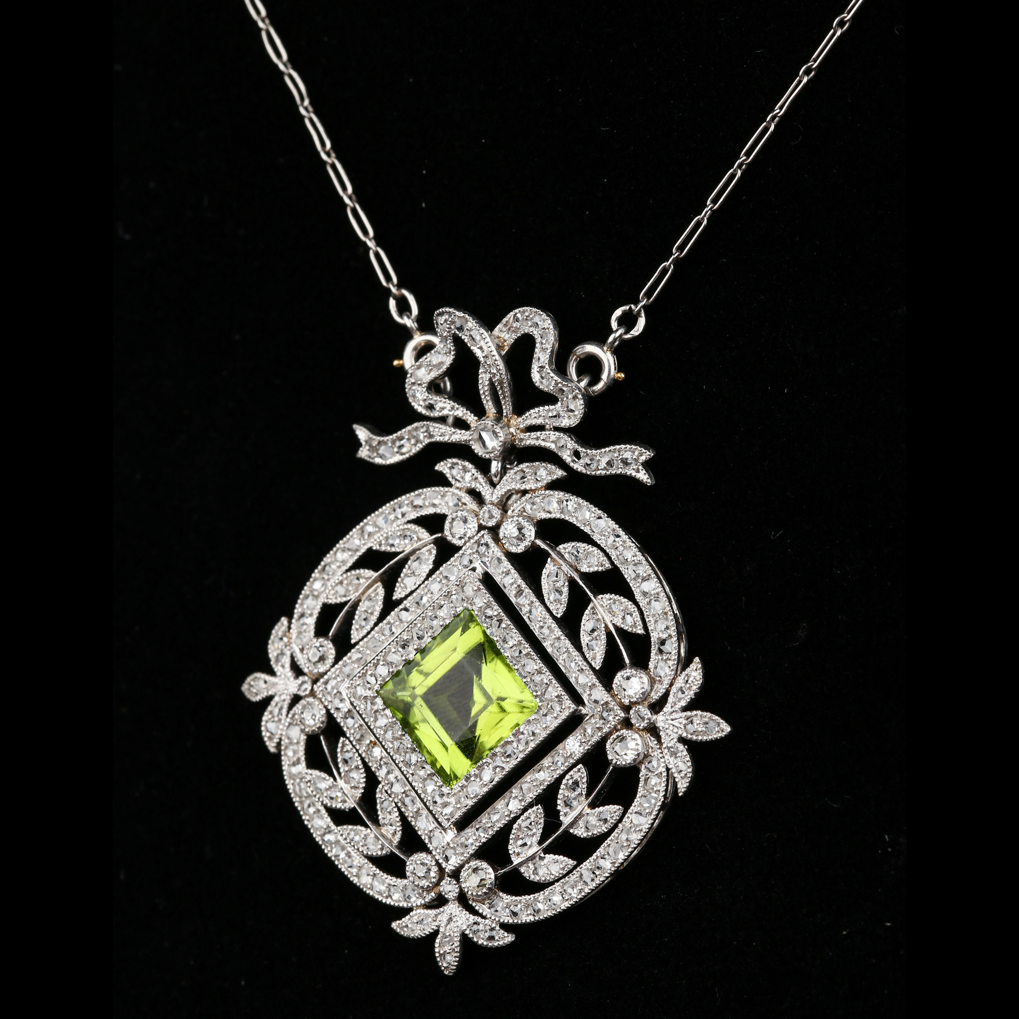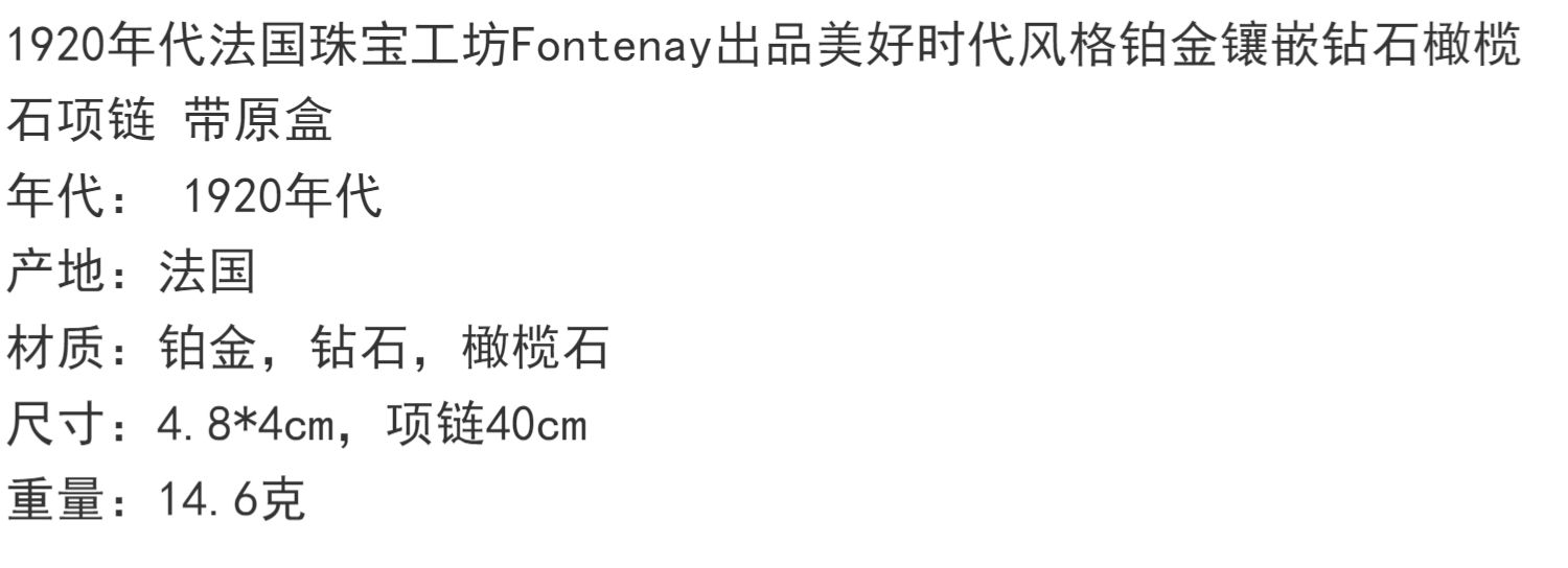 独角鹿西洋古董珠宝Fontenay美好时代风铂金镶钻石橄榄石吊坠项链