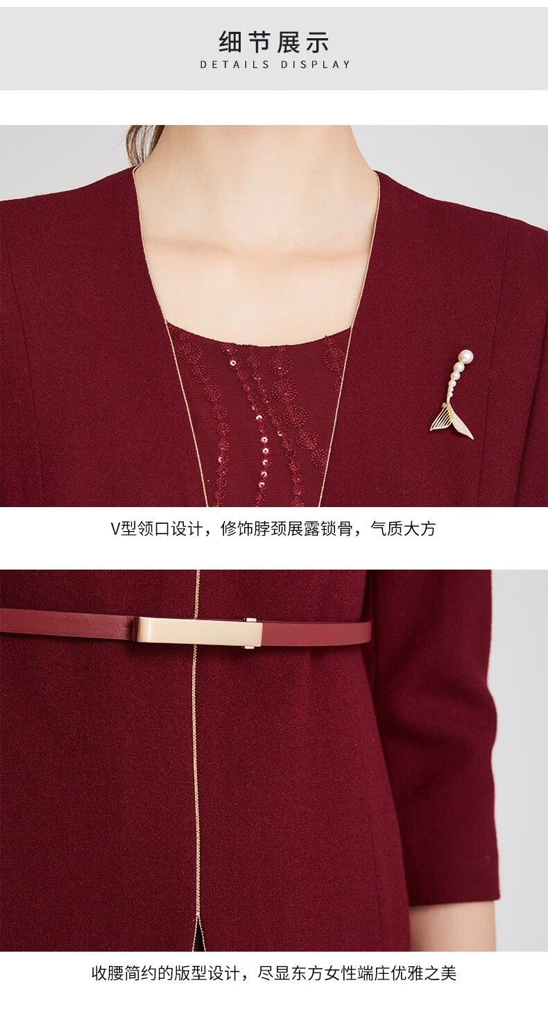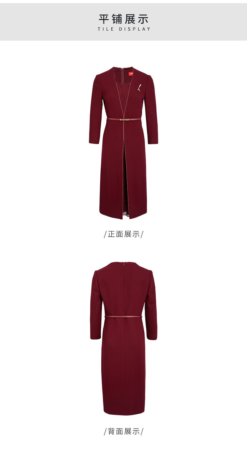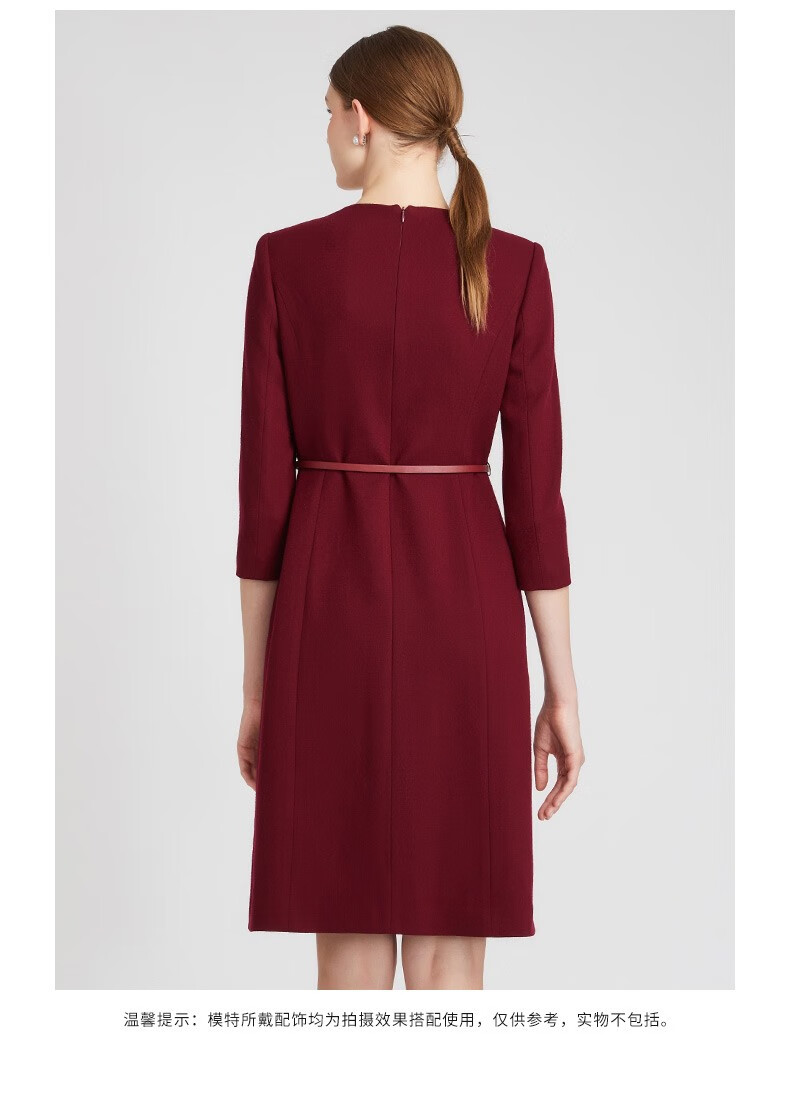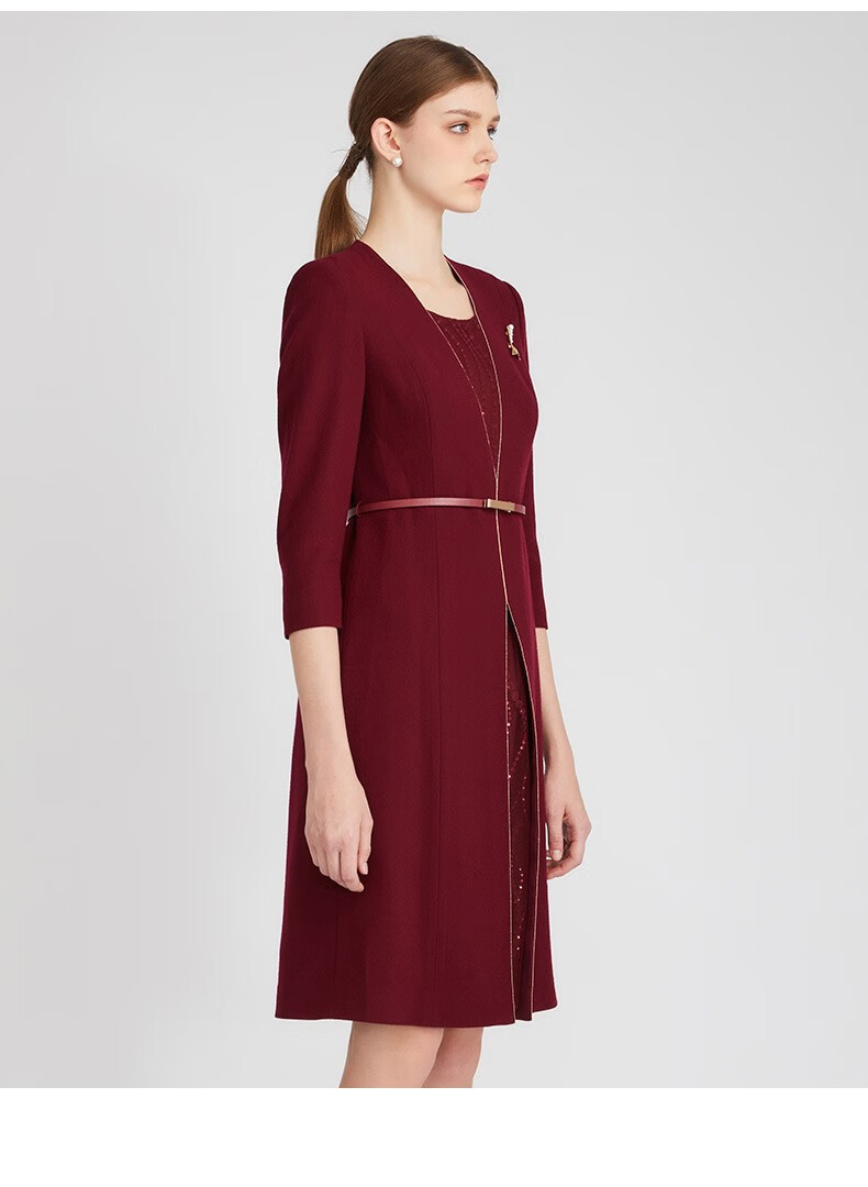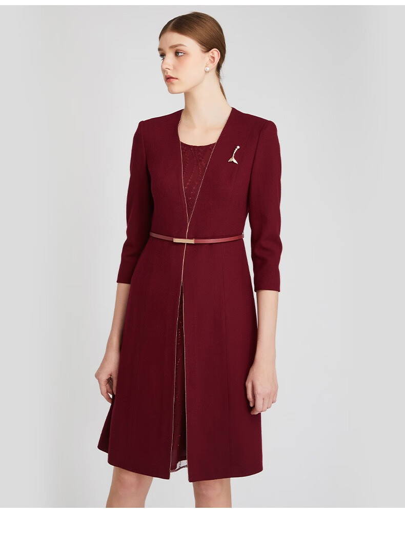 皮尔卡丹女装连衣裙红色收腰显瘦假两件商务羊毛裙P2318E2969T0