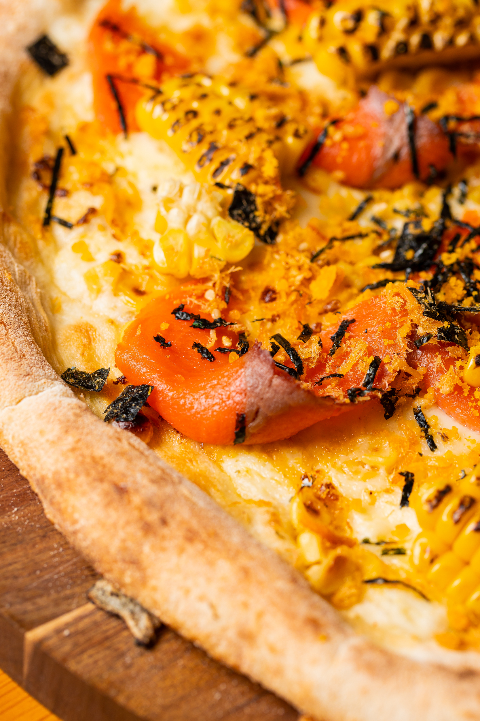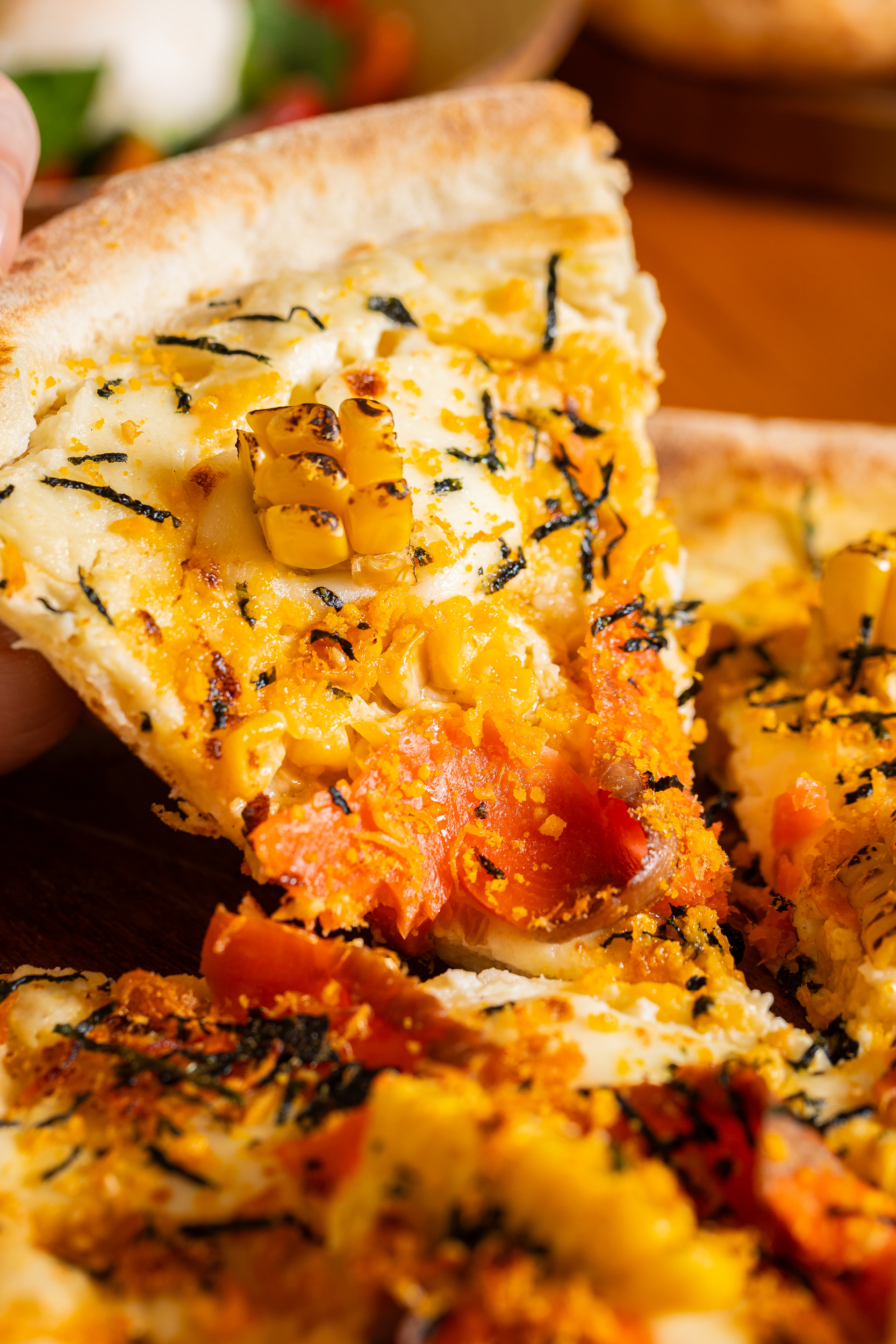 你也可以选择食材铺得满满当当的烟熏三文鱼咸蛋黄肉松披萨,浓郁的奶酪味儿包裹着烟熏三文鱼与咸蛋黄的丝丝咸香,每一口都是惊喜!