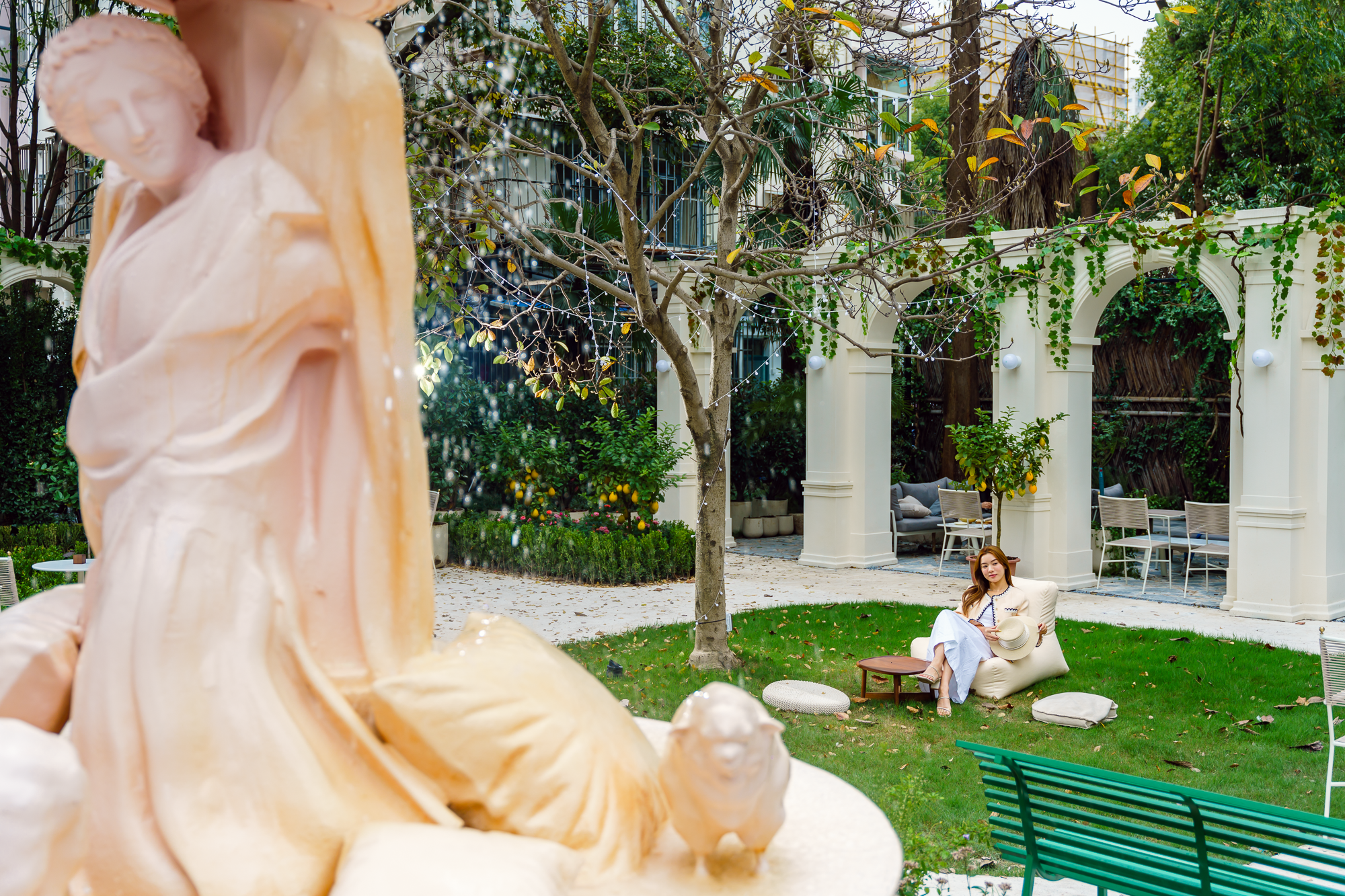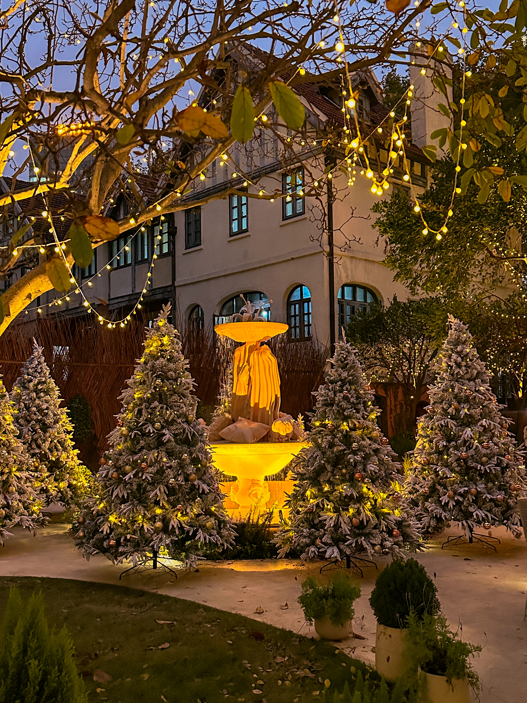 入夜之后,灯光摇曳的花园洋房又悄然而生另一番景象。伴随着音乐的渲染,树影婆娑与喷泉的灵动交织,情调氛围胜似童话里的浪漫舞会,每一个角落都很好拍。