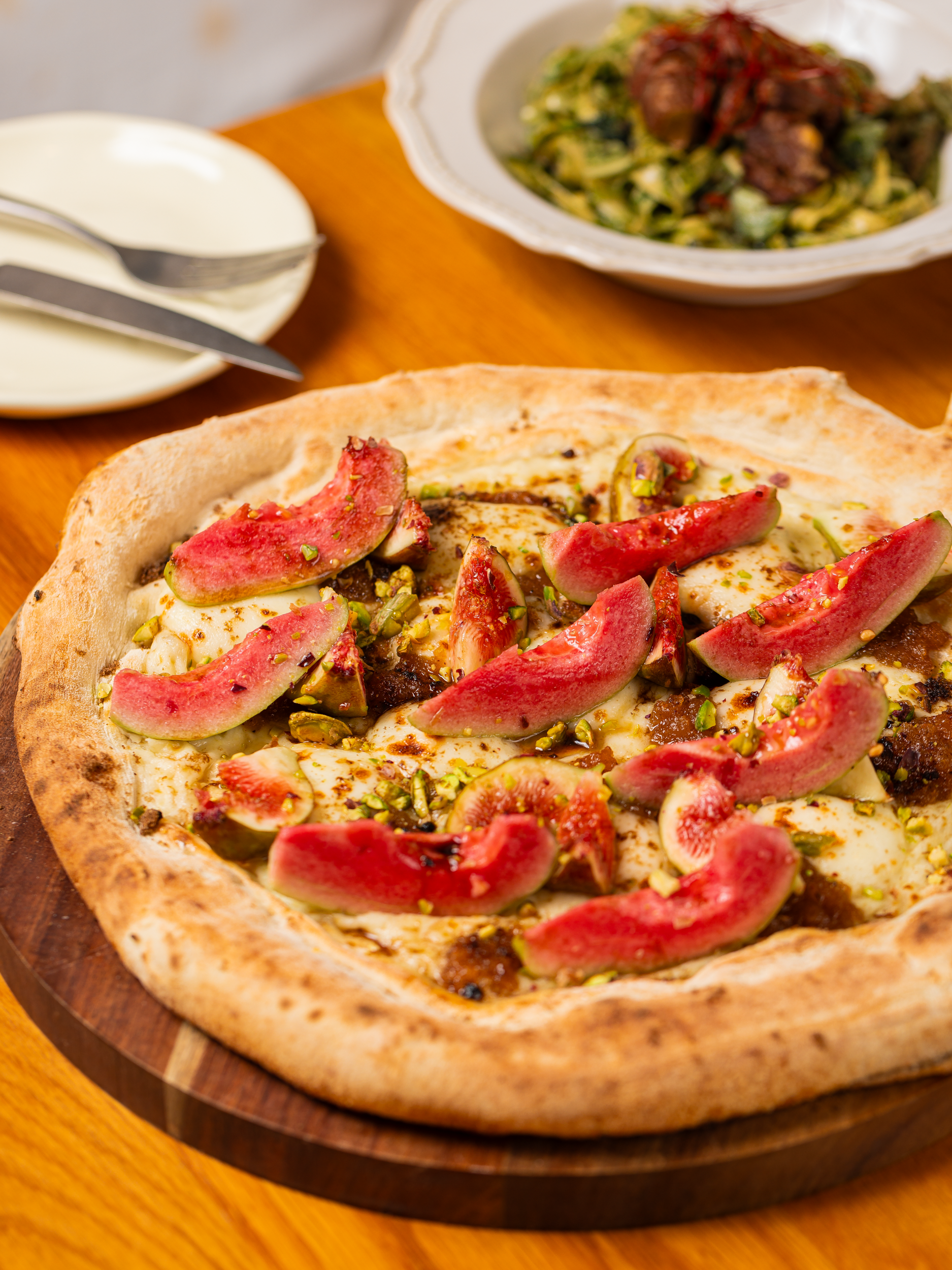 秋天是吃无花果的黄金季节。店里精选了来自新疆的无花果与开心果碎做披萨的Topping,面饼香软柔韧,边边气孔轻盈,是扎实又有质感的碳水快乐。