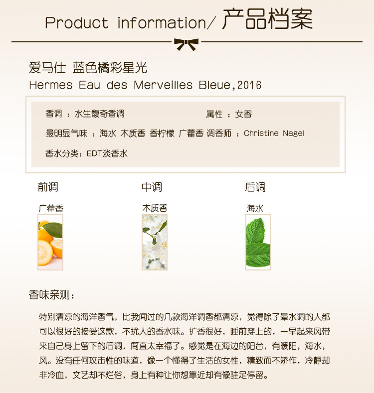Hermes爱马仕 蓝色橘彩星光50ml女士香水淡香持久 夏夜沙滩海风的味道