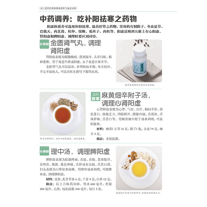 *章 养生先要调阴阳 你知道什么是阴阳吗 阴阳学说 阴阳学说在中医中的应用 中医养生不只在于防病,还在于调阴阳 如何判断体质偏阴或偏阳 阴性体质的特征 阳性体质的特征 吃对食物,轻松调理身体阴阳 根据个人体质选择食物 注意食物的性味归经 饮食应顺应四时的变化 寒热阴阳平衡:热者寒之,寒者热之 10 种属阳食物 10 种属阴食物 滋补药膳,滋阴又补阳 黄芪党参母鸡汤 党参灵芝大枣饮 人参大枣乌鸡汤 茯苓板栗大枣粥 经常刺激4 个穴位,滋阴又补阳 滋阴穴位 补阳穴位 滋阴补阳,要注意这几个生活细节 运动出汗过多,不仅伤阳,也会耗阴 经常熬夜,伤阴又伤阳 起居有常,阴阳平衡有保障 注意劳逸适度,有效调节阴阳 第二章 调好体质不生病 阳虚体质:倦怠乏力,四肢冰冷 测一测,你是阳虚体质吗 为什么会阳虚 饮食调养:吃补肾温阳之品 核桃板栗饮 板栗炖鸡块 蒜薹炒羊*丝 韭菜炒鸡蛋 经络调养:全身暖洋洋 中药调养:吃补阳祛寒之药物 金匮肾气丸,调理肾阳虚 麻黄细辛附子汤,调理心肾阳虚 理中汤,调理脾阳虚 运动调养:户外运动时要防寒保暖 四季调养:严冬避寒,春夏多晒太阳 阴虚体质:阴虚不足,烦躁易怒 测一测,你是阴虚体质吗 为什么会阴虚 饮食调养:吃滋阴生津之品 银耳猕猴桃羹 桑葚大枣粥 菠萝梨汁 海参粥 经络调养:不干燥不上火 中药调养:吃养阴润燥之药物 肾阴亏虚者,可吃六味地黄丸 女贞子大枣茶,滋肝阴,补肾阴 菊杞茶,缓解眼干眼涩 运动调养:宜静养,不宜剧烈运动 四季调养:春夏防燥,秋冬养阴 气虚体质:元气不足,气短懒言 测一测,你是气虚体质吗 为什么会气虚 饮食调养:吃健脾益气的食物 八宝粳米粥 牛*粥 鸡蓉豆腐 山药桂圆荔枝粥 经络调养:气血充足有精神 中药调养:应益气补虚 人参当归茶,补气又补血 心气虚,就喝七福饮 脾气虚,就喝汤 肺气虚,就喝补肺汤 肾气虚,大补元煎补肾气 运动调养:轻量运动,培补元气 四季调养:夏避暑,冬平补 痰湿体质:怠惰懒动,大腹便便 测一测,你是痰湿体质吗 为什么会有痰湿 饮食调养:吃化痰祛湿的食物 薏米赤小豆粥 桃仁鲫鱼汤 赤小豆冬瓜粥 山药扁豆糊 经络调养:关键在于健脾除湿 中药调养:应化痰祛湿 咳嗽痰多,用二陈汤来调理 胸闷恶心,就喝半夏白术天麻汤 运动调养:多动少懒,通身出汗 四季调养:春夏多吃姜,秋冬少进补 湿热体质:身体困重,多痘多疮 测一测,你是湿热体质吗 为什么会有湿热 饮食调养:吃清热利湿的食物 海米紫菜蛋汤 橙香莲藕 陈皮海带粥 冬瓜皮汤 经络调养:除湿清热是关键 中药调养:湿重热重,辨证论治 湿重就选六一散 热重就用连朴饮 运动调养:长跑、游泳,清热利湿 四季调养:长夏暑湿巧应对 血瘀体质:血行不畅,瘀滞成斑 测一测,你是血瘀体质吗 为什么会血瘀 饮食调养:以活血化瘀为主 洋葱炒羊* 桃仁山楂荷叶粥 橘核玫瑰粥 赤小豆红糖泥 经络调养:活血化瘀是关键 中药调养:应活血养血 胸闷疼痛,血府逐瘀汤可化解 补气活血,可选当归补血汤 运动调养:全身运动,助气运行 四季起居调养:春季多动,秋冬御寒 气郁体质:郁闷不舒,气机不畅 测一测,你是气郁体质吗 为什么会气郁 饮食调养:理气解郁,健脾安神 兔*山药汤 香椿炒鸡蛋 海带萝卜排骨汤 玫瑰金桔饮 经络调养:按摩刮痧,疏肝理气 中药调养:疏肝,行气解郁 逍遥散,疏肝健脾 半夏厚朴汤,化痰理气 甘麦大枣汤,安神补脾胃 运动调养:调神行气 四季调养:春夏早睡早起,秋冬劳逸适中 精神调养:少生闷气多放松 特禀体质:经常过敏 测一测,你是特禀体质吗 为什么经常过敏 饮食调养:清淡饮食,合理搭配 绿豆杨梅茶 薯粉羹 黑米大枣粥 奶 经络调养:益气固表,增强抵抗力 中药调养:玉屏风散,益气固表 运动调养:减少户外活动,避免过敏 四季调养:春季升阳,谨防过敏 情志调养:戒除烦躁,心态平和 平和体质:用心维持 测一测,你是平和体质吗 平和体质如何保养