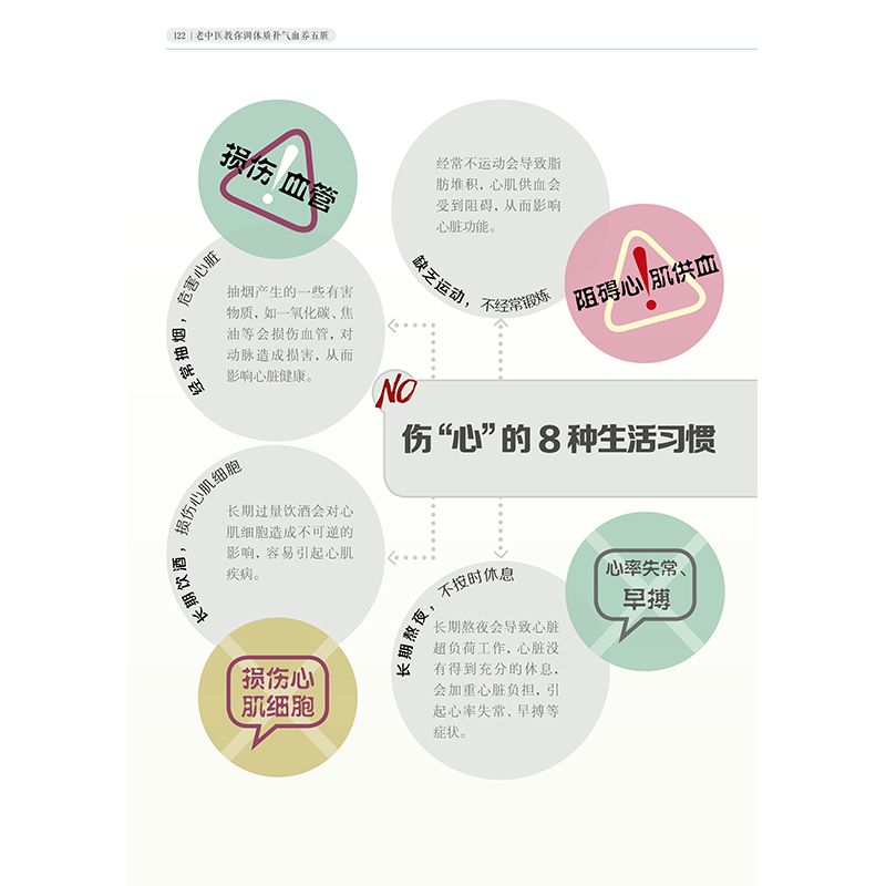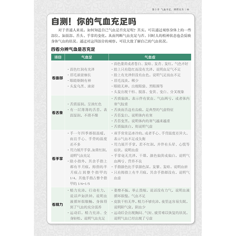 第三章气血不足,调理有方 你知道什么是气血吗 中医所说的气 中医所说的血 气与血的关系 气血是人体的后天之本 自测!你的气血充足吗 当心生活中的坏习惯,让你的气血越来越差 寒凉食物影响好气色 经常熬夜,损耗气血脸色差 “美丽冻人”,当心寒从体入 长期久坐不动,容易气血不畅 不注意脚部保暖,难免病从脚入 吃对食物,养出好气色 10 种补气养血食材 精选12 种补气血食谱 黑米银耳大枣粥 当归大枣牛尾汤 黑芝麻粥 银耳樱桃粥 桂圆枸杞子鸡汤 黄芪山药粥 莲藕大枣汤 胡萝卜羊*粥 枸杞子牛*汤 黄芪乌鸡汤 驴*清汤 陈皮枸杞子猪肝汤 滋补药膳,吃出好气血 阿胶核桃大枣汤 人参当归猪心汤 党参黄芪瘦*汤 何首乌海参汤 疏通经络,气血畅通 经络:气血的必经之路 一天之中12 条经脉气血运行时间 经常刺激8 个穴位,补气又活血 气海穴,补益元气的要穴 关元穴,补益元气,强身健体 阳池穴,振奋阳气调三焦 内关穴,补益气血安心神 血海穴,天然的补血要穴 足三里穴,益气血,补元气 三阴交穴,健脾和胃生气血 涌泉穴,强肾安神促睡眠 简单瑜伽天天练,气血充足面色红润 肩桥式瑜伽,安神助眠 眼镜蛇式瑜伽,缓解腰酸背痛 猫式瑜伽,促进盆腔气血循环 前弯休息式瑜伽,缓解压力助睡眠 第四章 养好五脏保健康 五脏是如何工作的 心是身体的“主管” 肝是“将军之官” 脾是管“仓廪”的官 肺掌管呼吸 肾是一个人的“根本” 五脏协调工作,健康才有保障 肾能滋养心肝脾,与肺配合完成“呼吸”工作 脾能化生、运行气血,以滋养其他脏器 心负责血液调度,为其他脏器提供营养支持 肺能为其他脏器提供养料 肝藏血,主疏泄,可决定其他脏器安危 养心就是养精神 心脏的8 个求救信号,你能读懂几个 伤“心”的8 种生活习惯 午时小憩,能够让心脏不那么劳累 经常快步走能增强心肺功能 大喜也会“伤心”,谨防乐极生悲 红色、苦味食物可让心脏变强劲 花生赤小豆汤 大枣炖猪心 苦瓜煎蛋 桂圆莲子粥 疏通经络,心气足,心血通畅 中药调理,养心安神 酸枣仁粥养心安神,适合失眠多汗的人 当归柏子仁粥,活血安神润肠道 灵芝泡水喝,补心血,益心气 喝丹参茶,预防心脏疾病 养肝就是调气血,气血畅,人不老 8 个信号提示肝脏有问题 8 种生活习惯容易伤肝 经常慢跑可提升肝脏功能 经常拉筋,筋舒则气顺 药枕有一定的清肝宁神的功效 青色食物让肝轻松舒畅 芹菜拌花生米 绿豆薏米粥 菠菜猪肝汤 香橼佛手粥 中药调理,养肝护肝 枸杞子泡水喝,可养肝明目 决明子煮粥喝,明目又降压 用郁金来疏肝理气,活血化瘀 香附是调经止痛的良药 常刺激肝经,养肝护肝 脾不虚,病不找 脾虚的8 个危险信号 易伤脾的6 种生活习惯 长夏时节要注意防湿健脾 饭后散散步,健脾胃,助消化 经常吃*食物,脾更有活力 茯苓赤小豆小米粥 南瓜大枣粥 胡萝卜玉米鲫鱼汤 玉米山药汤 中药调理,轻松赶走脾胃病 消化不良,用陈皮来调理 食谱中加白术,腹泻好得快 小儿积食,用神曲来消食 麦芽,消化不良就用它 疏通经络,让脾胃保持强壮 养好肺,气色好更年轻 肺脏虚衰的8 个典型特征 易伤肺的8 种生活习惯 秋天保持神志安宁 , 以收藏气血 每天1~2 次深呼吸,能锻炼肺脏 经常游泳,增加肺活量,强健肺 白色食物可养肺润肺 银耳莲子羹 萝卜百合汤 雪梨猪肺汤 荸荠雪梨汁 第五章 顺应四季谈养生 春季:养肝护肝,补阳气 春季饮食调养 春季生活起居调养 春季精神调养 春季运动调养 春季预防传染病 夏季:健脾除湿,养心为先 夏季饮食调养 夏季生活起居调养 夏季精神调养 夏季运动调养 夏季防病抗病 秋季:补水多酸,润肺燥 秋季饮食调养 秋季生活起居调养 秋季精神调养 秋季运动调养 秋季防病抗病 冬季:养护肾脏,暖为宜 冬季饮食调养 冬季生活起居调养 冬季精神调养 冬季运动调养 冬季防病抗病 第六章 不同人群养生,重点各不同 老年人:饮食清淡,多运动 生活起居要规律 饮食清淡少油腻 心态乐观多交流 积极运动保健康 儿童:营养助成长 营养均衡,搭配合理 少玩网络游戏,多运动 保护眼睛和牙齿 女性:一生重在滋阴养血 女性常吃桂圆、大枣,补气血防衰老 艾灸三阴交穴、足三里穴等,气血充足不生病 少生气,心态好,远离妇科疾病 男性:补充阳气,精力旺 多吃山药、羊*等补肾壮阳 少喝酒,少抽烟,呵护肝脏养好肺 少熬夜,多运动,身体健康精神好 艾灸命门穴、涌泉穴,益肾壮阳精力旺 |