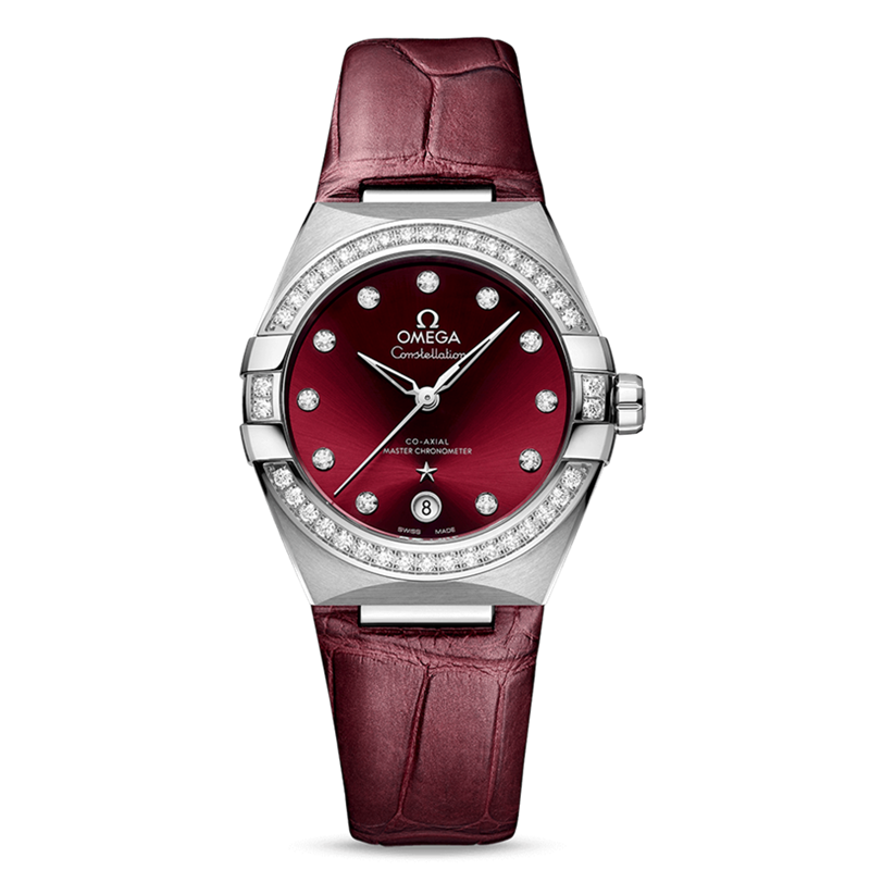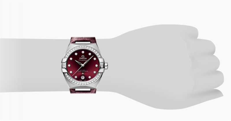 镜面材质 | 蓝宝石水晶玻璃 | 表盘 | 精钢表壳 抛光表圈镶嵌38颗钻石,勃艮第红色表盘经过PVD涂层处理,呈现出太阳射线的打磨效果,6点位设有日历窗。 指针、欧米茄品牌标识、星徽标志以及小时刻度均以白色18K金打造。 背透 |