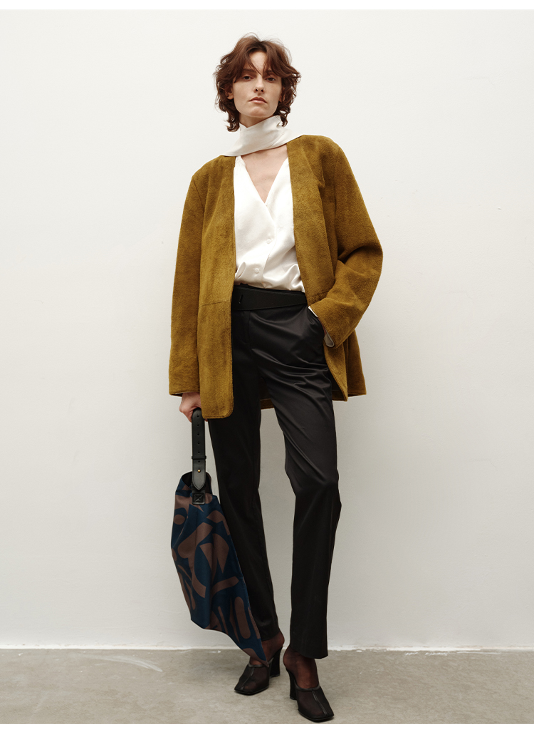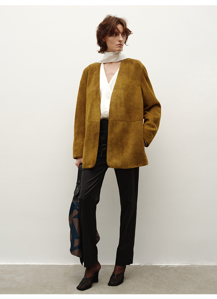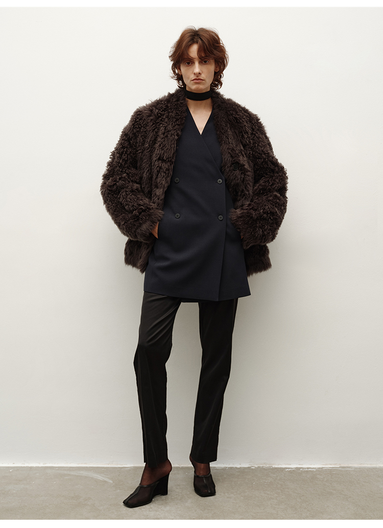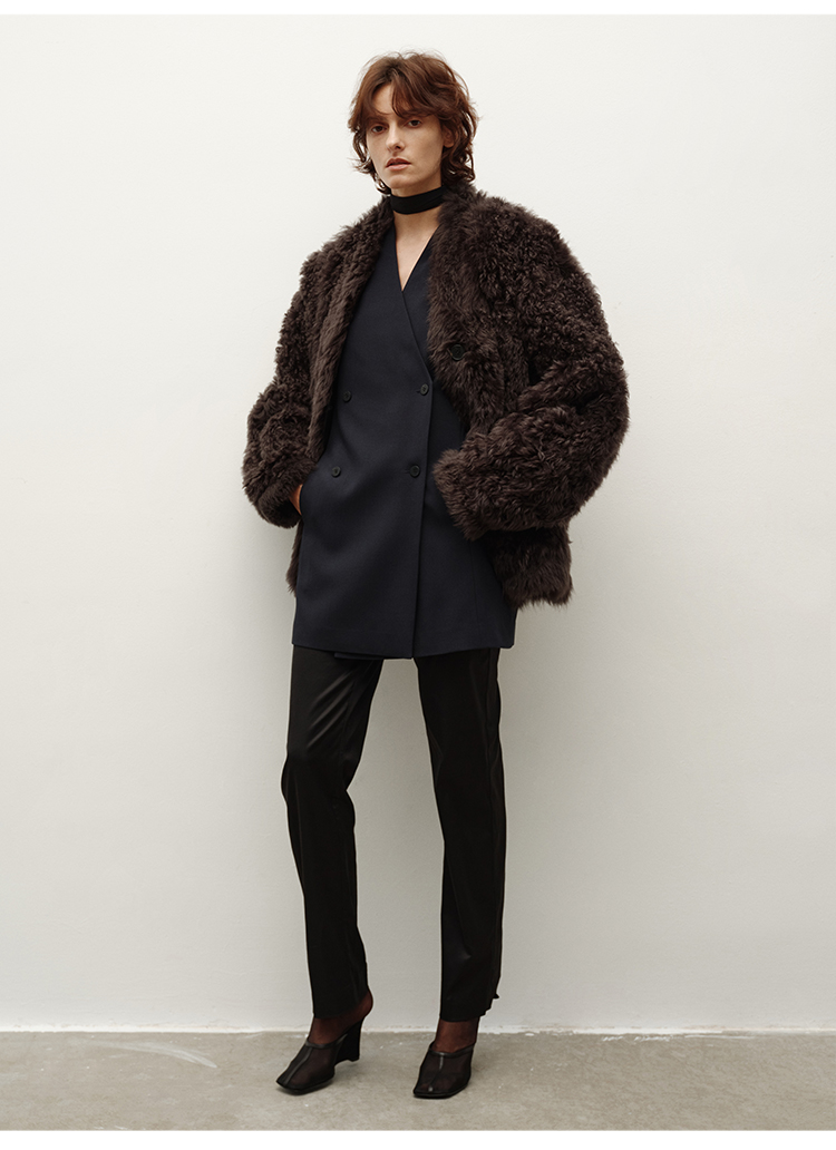 HIDEMI皮毛一体简约圆领短款皮草大衣皮衣