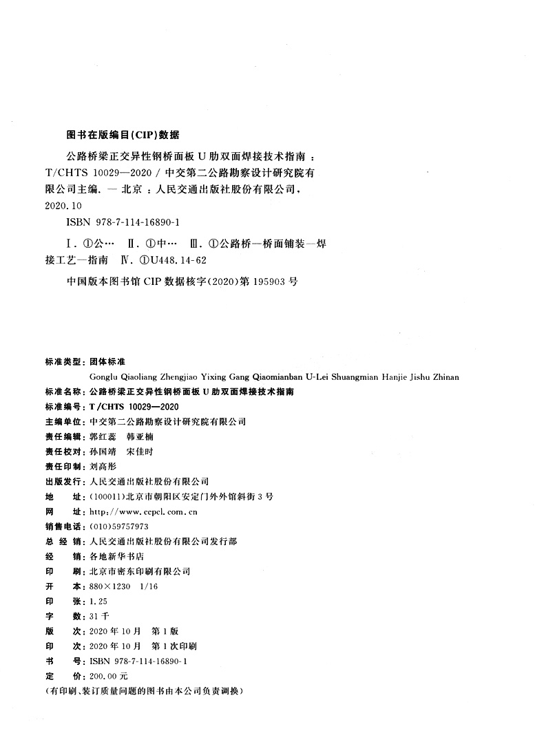 书名:公路桥梁正交异性钢桥面板U肋双面焊接技术指南(T/CHTS10029—2020)