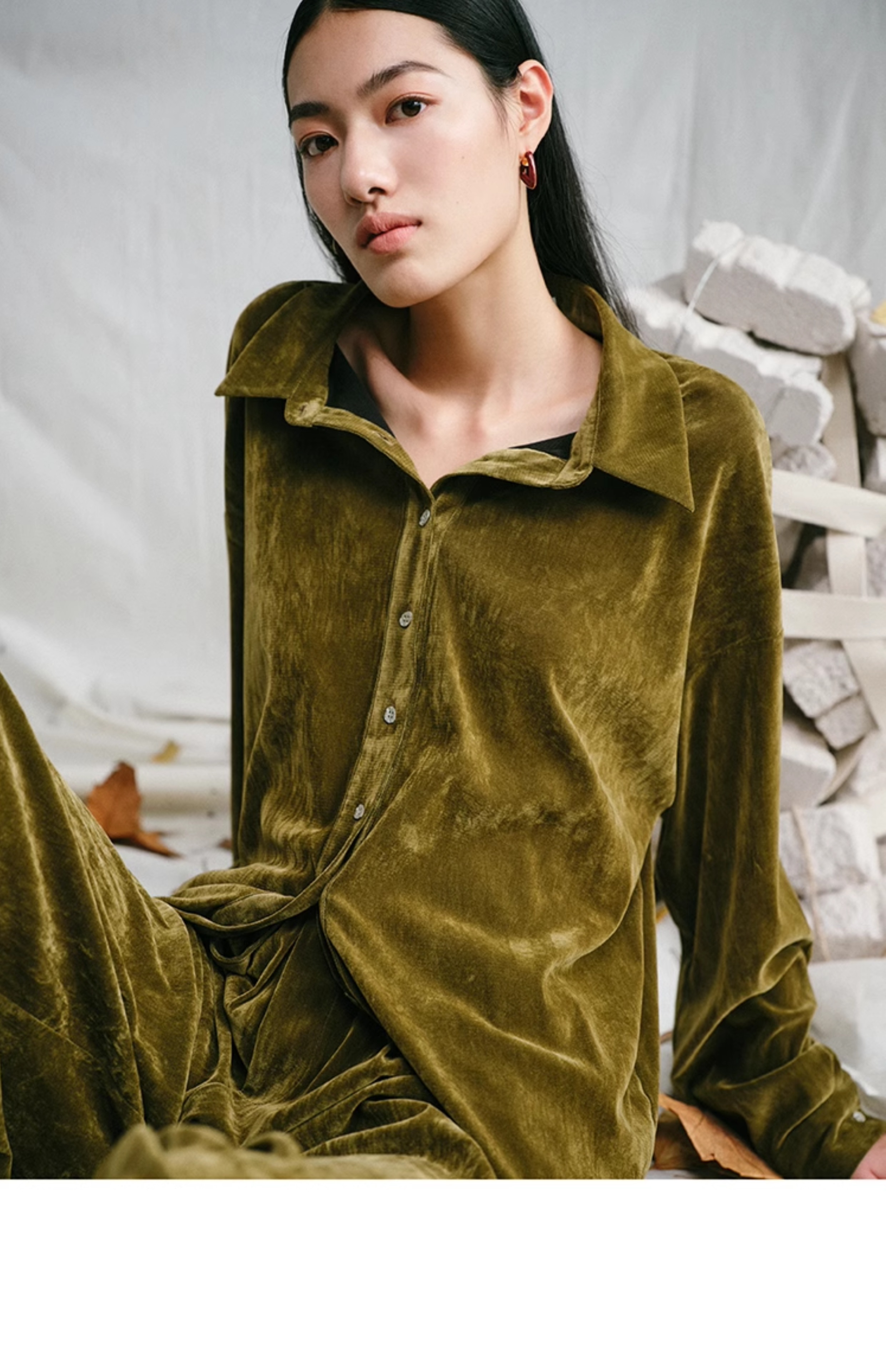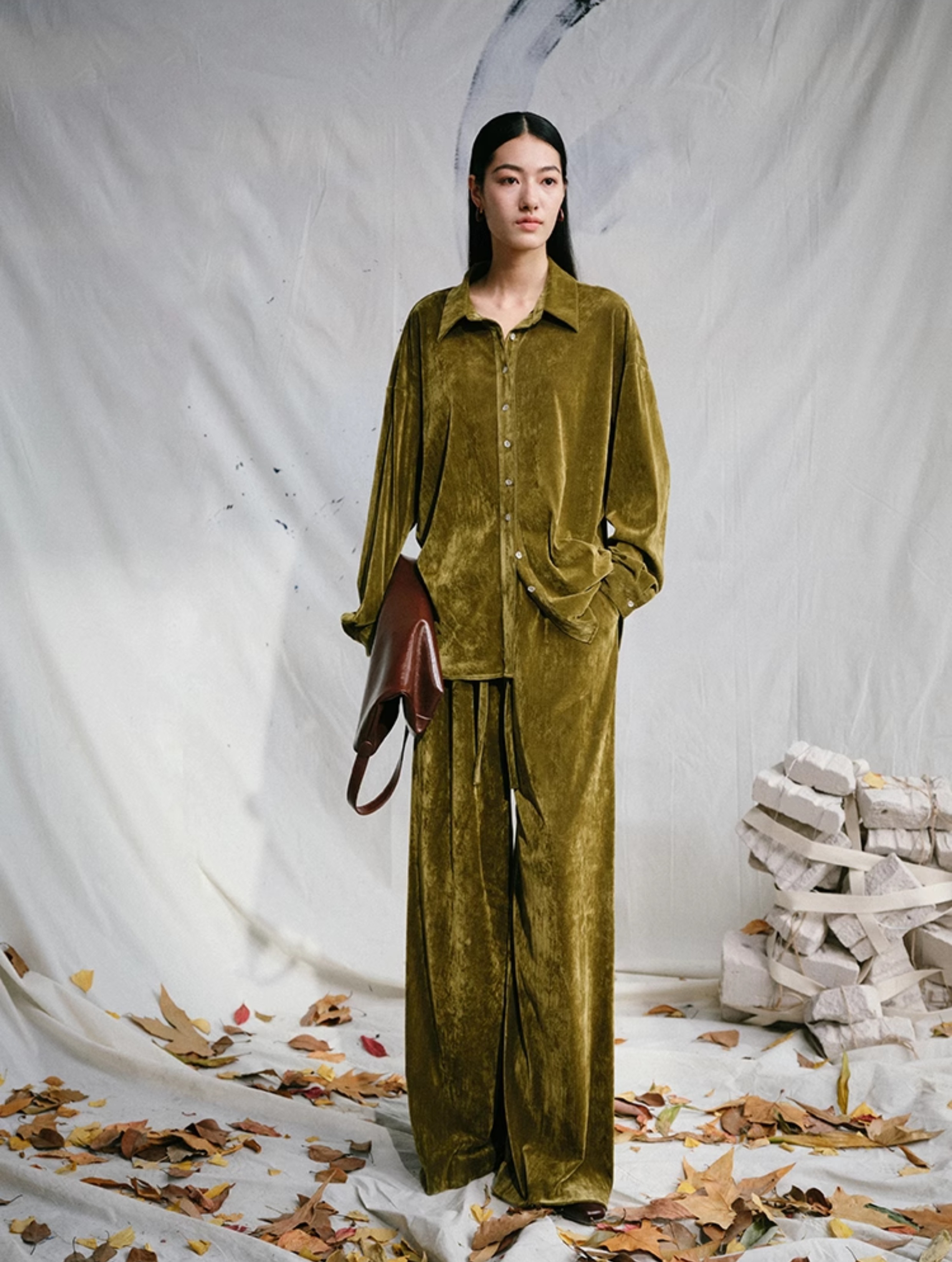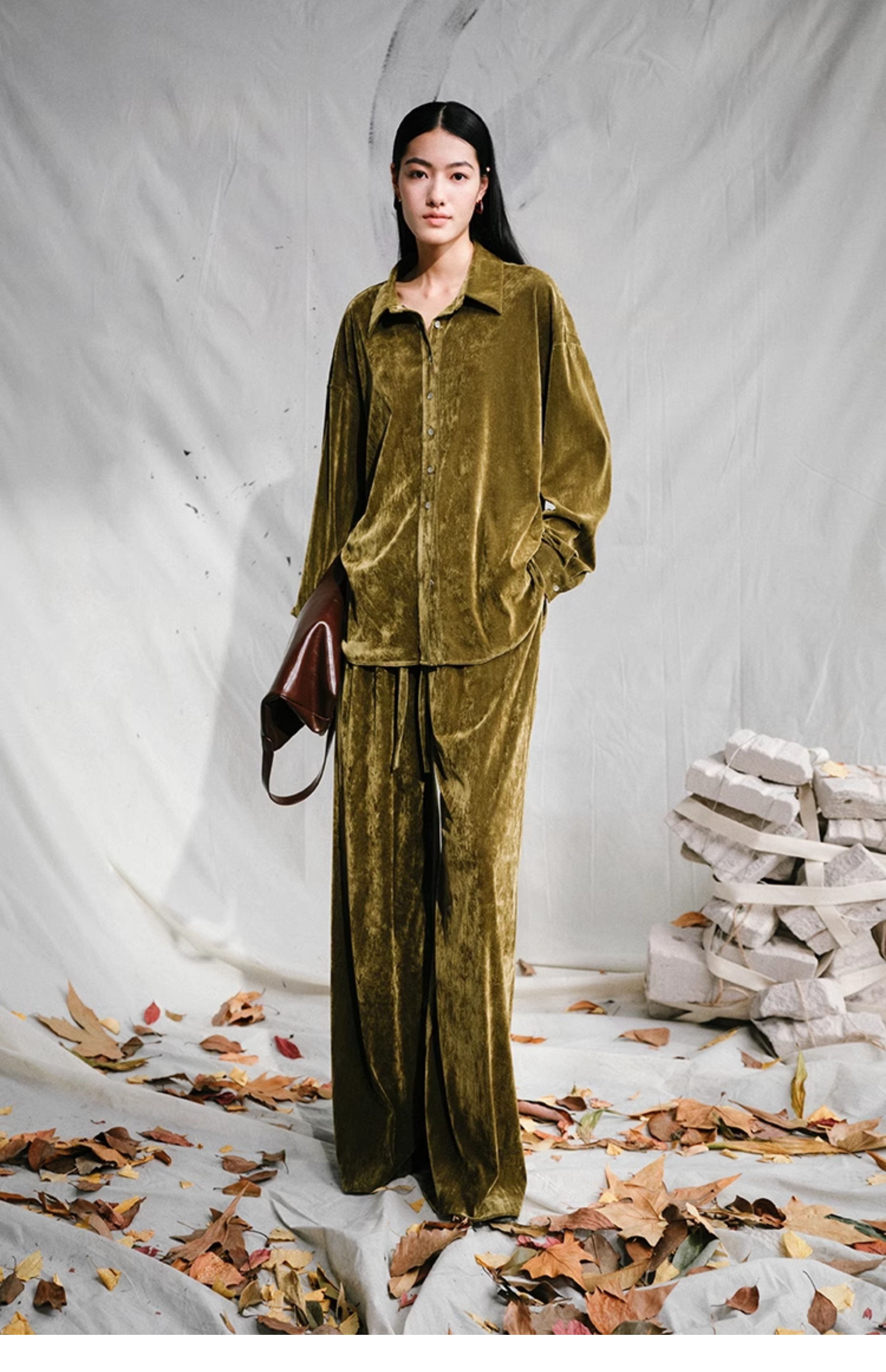 LIYIHAN 24夏季新品光泽丝绒宽松衬衫女士套装法式复古