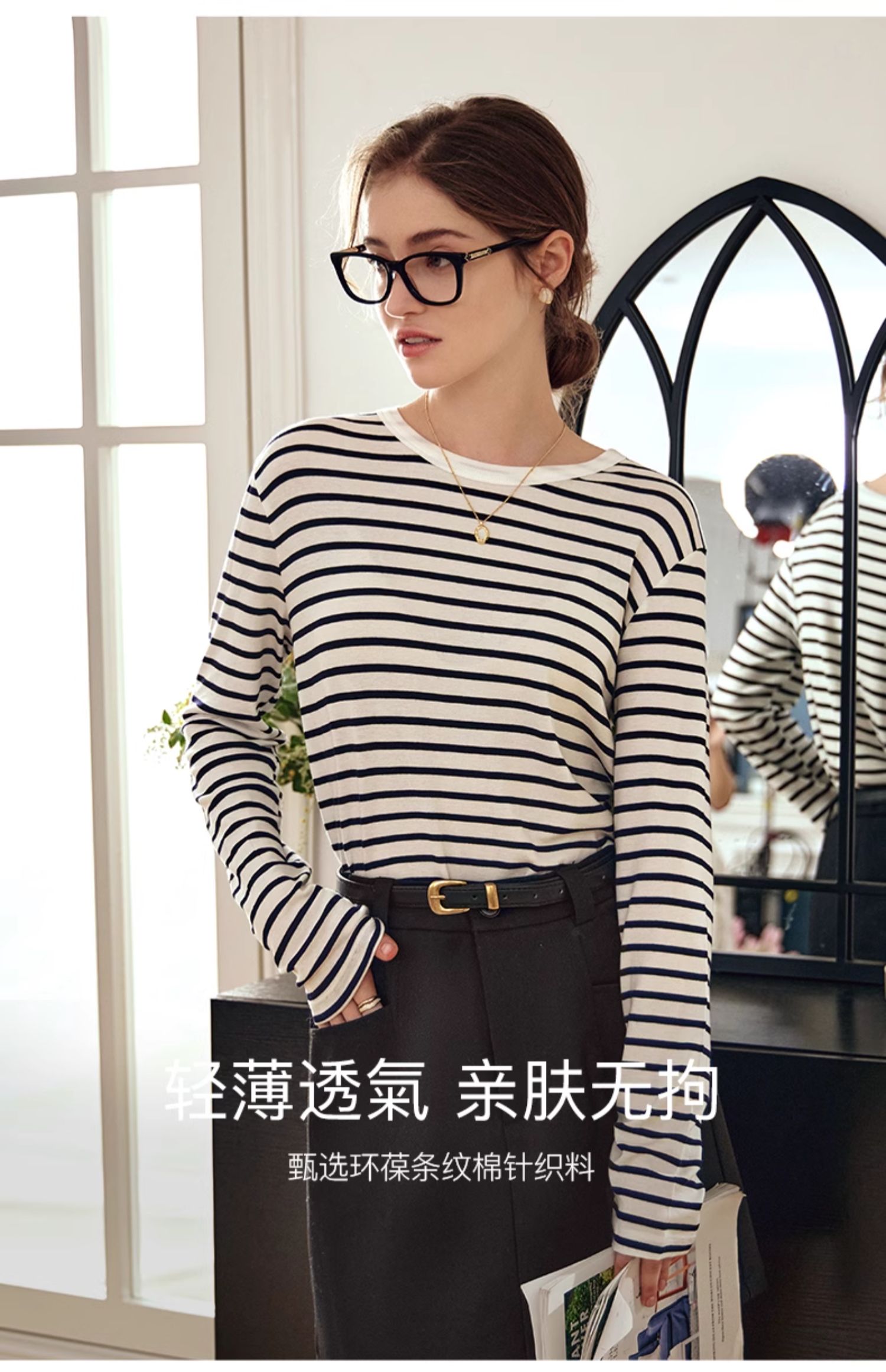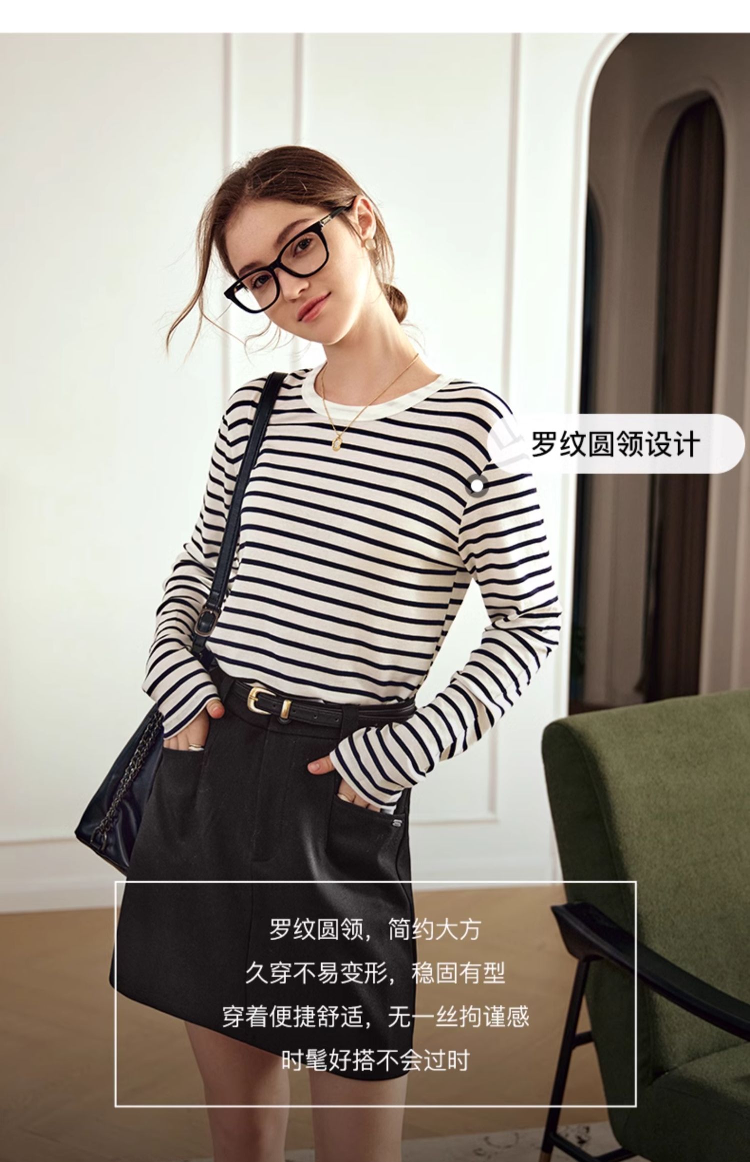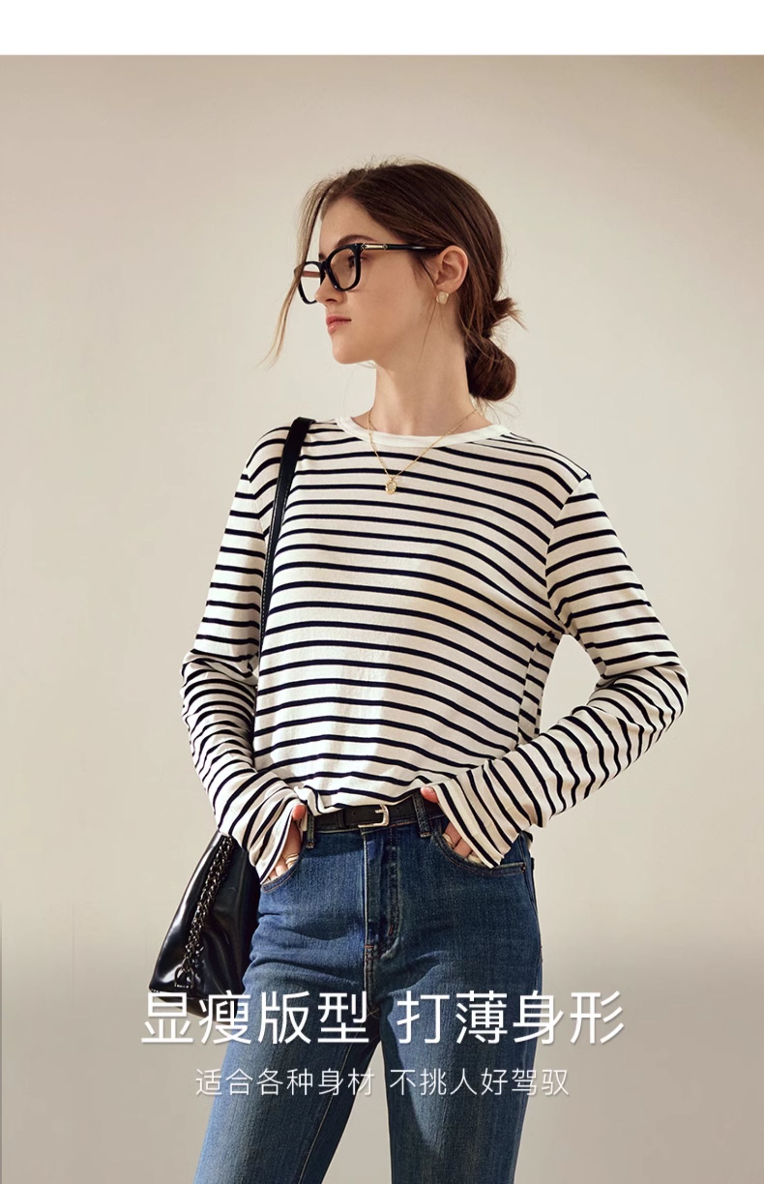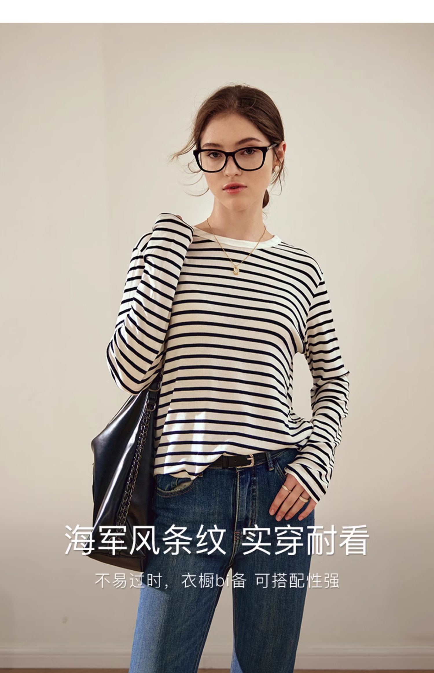 OLrain欧芮儿条纹T恤女秋冬2023年新款海军风宽松显瘦长袖打底衫