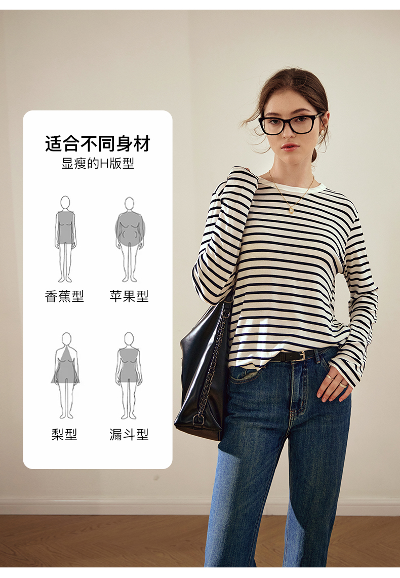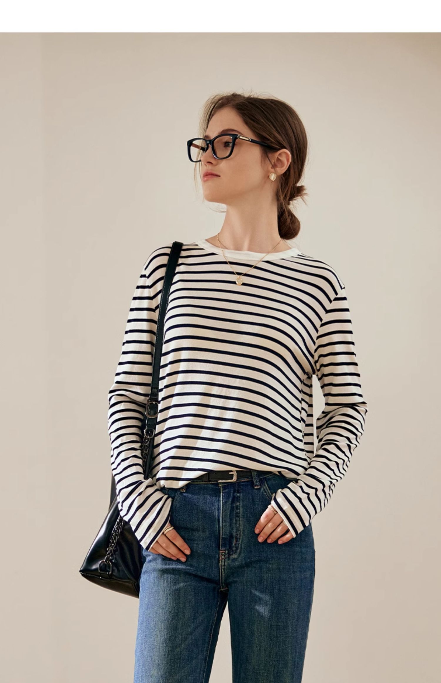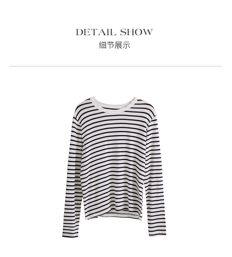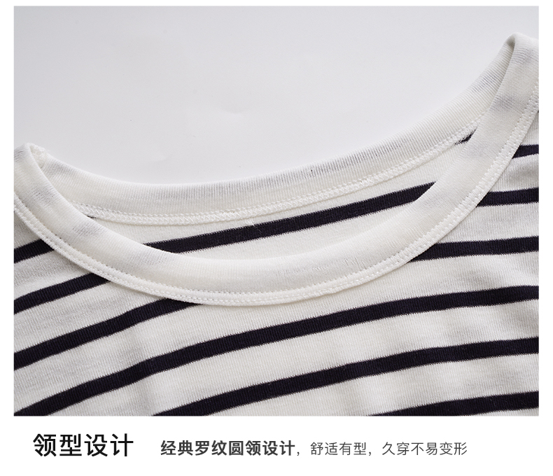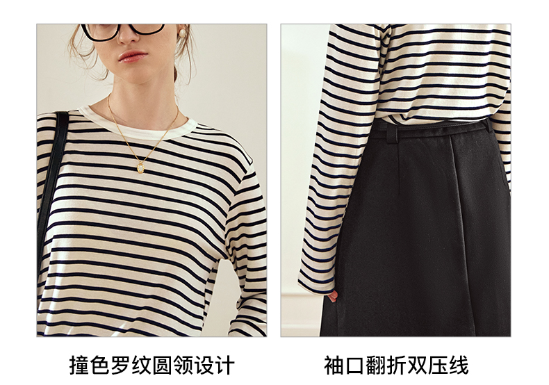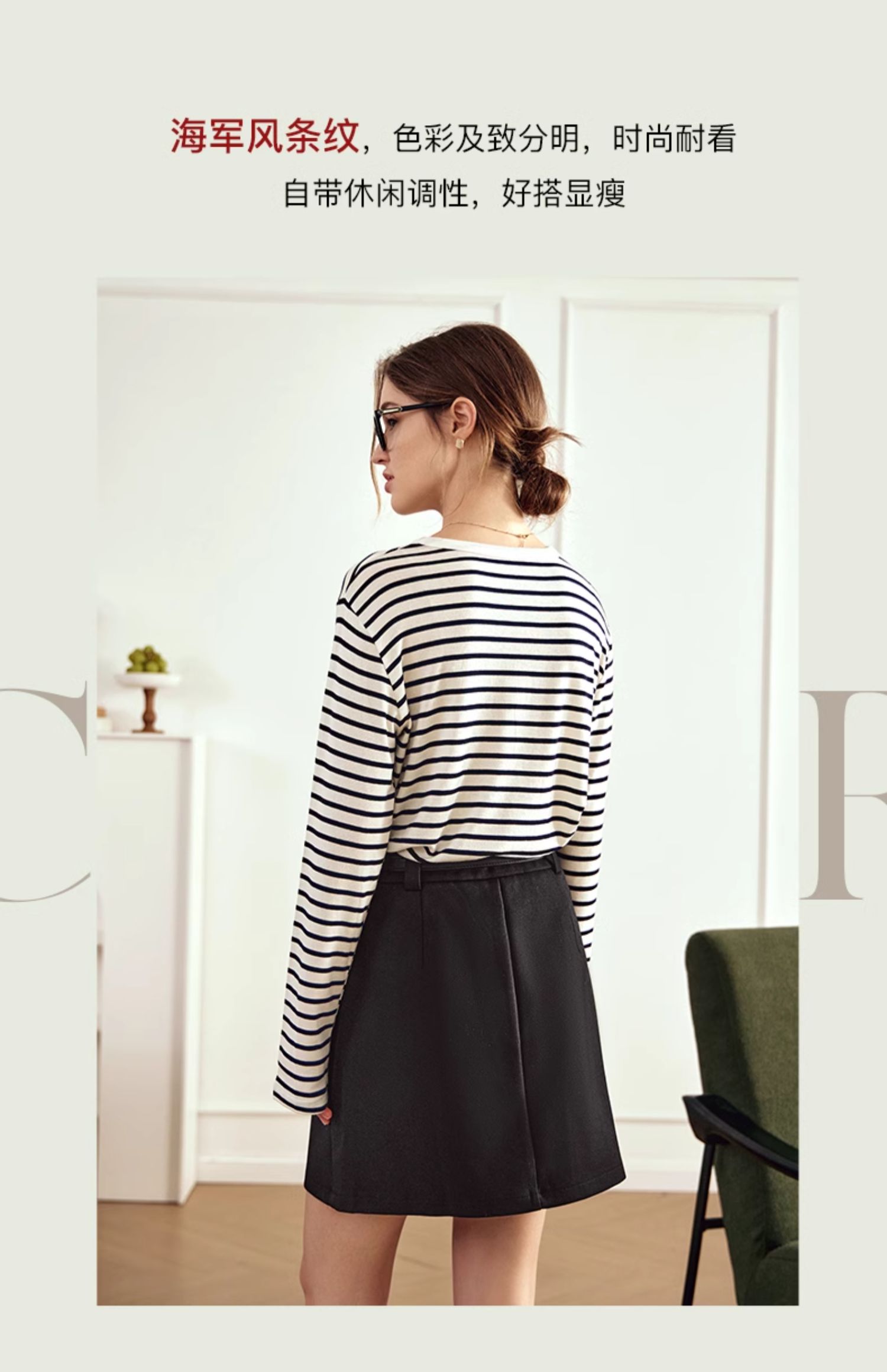 OLrain欧芮儿条纹T恤女秋冬2023年新款海军风宽松显瘦长袖打底衫