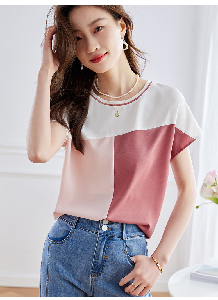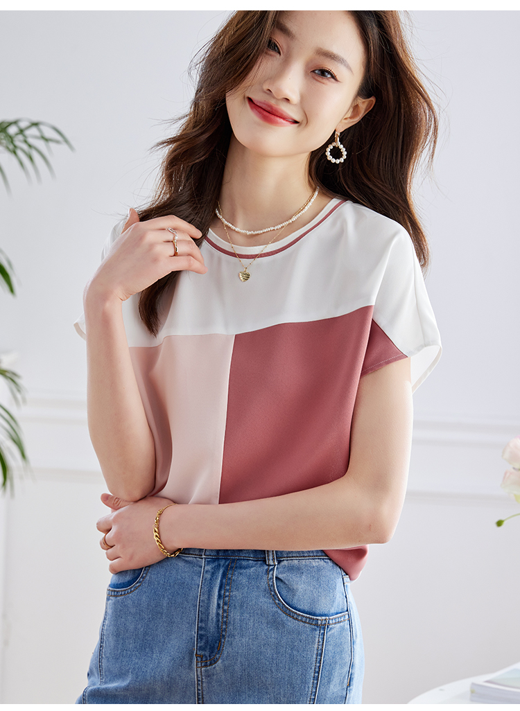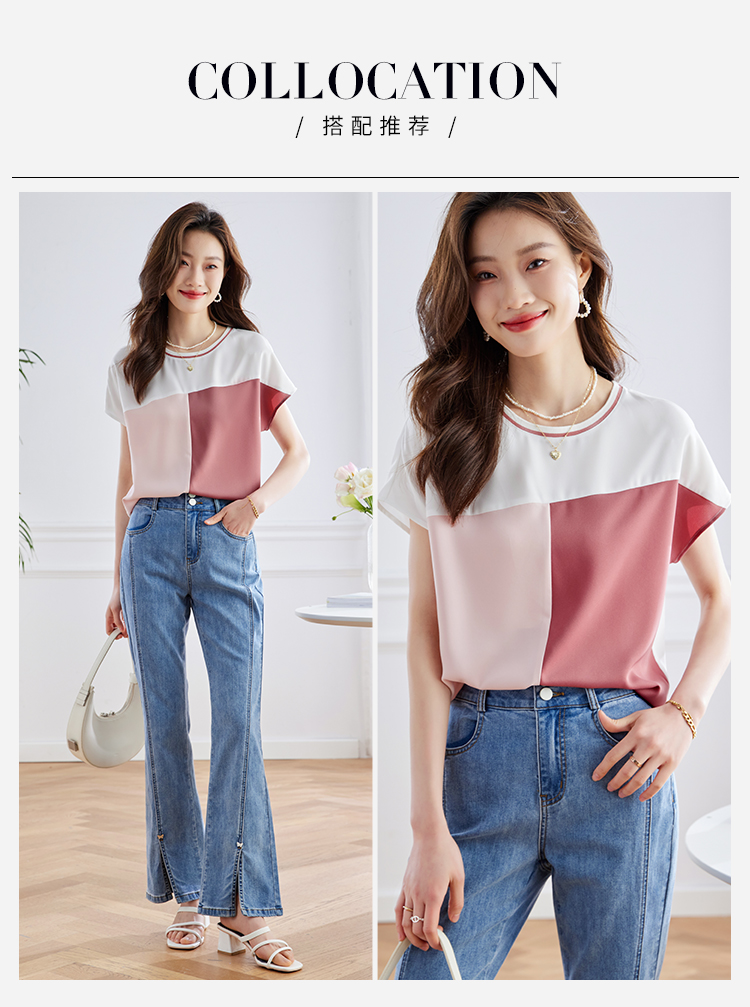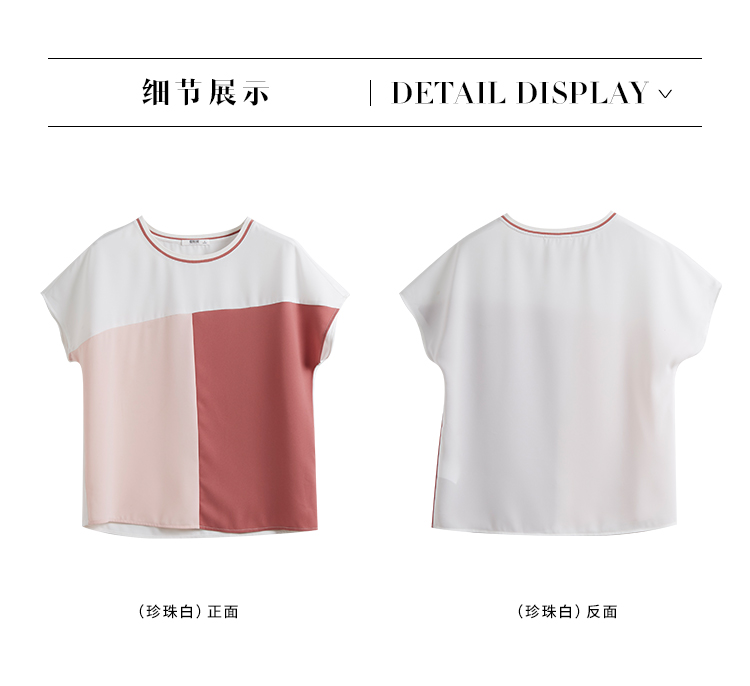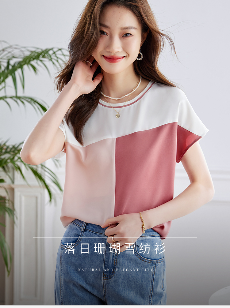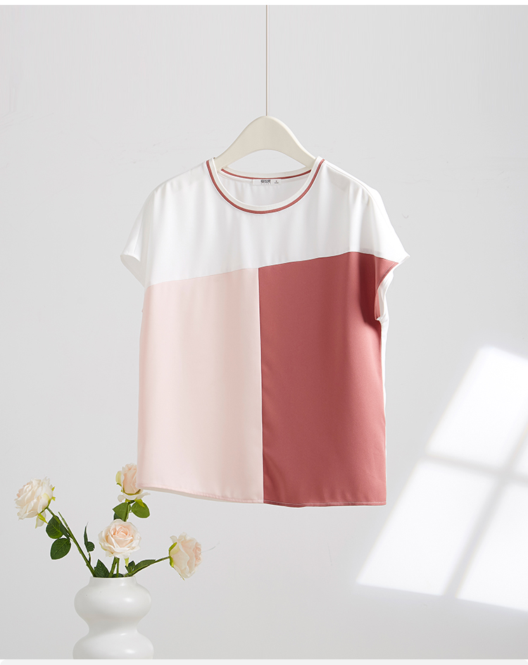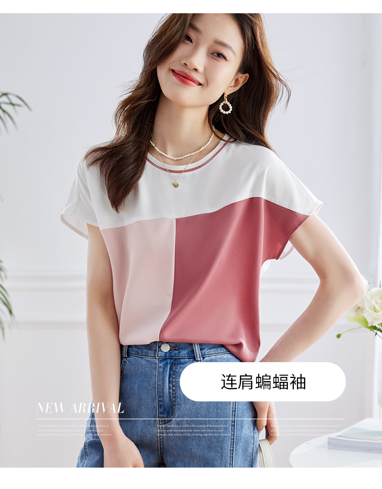 【五折购】熙世界蝙蝠袖拼色圆领雪纺衫女2025夏日新款高端时尚洋气小衫上衣
