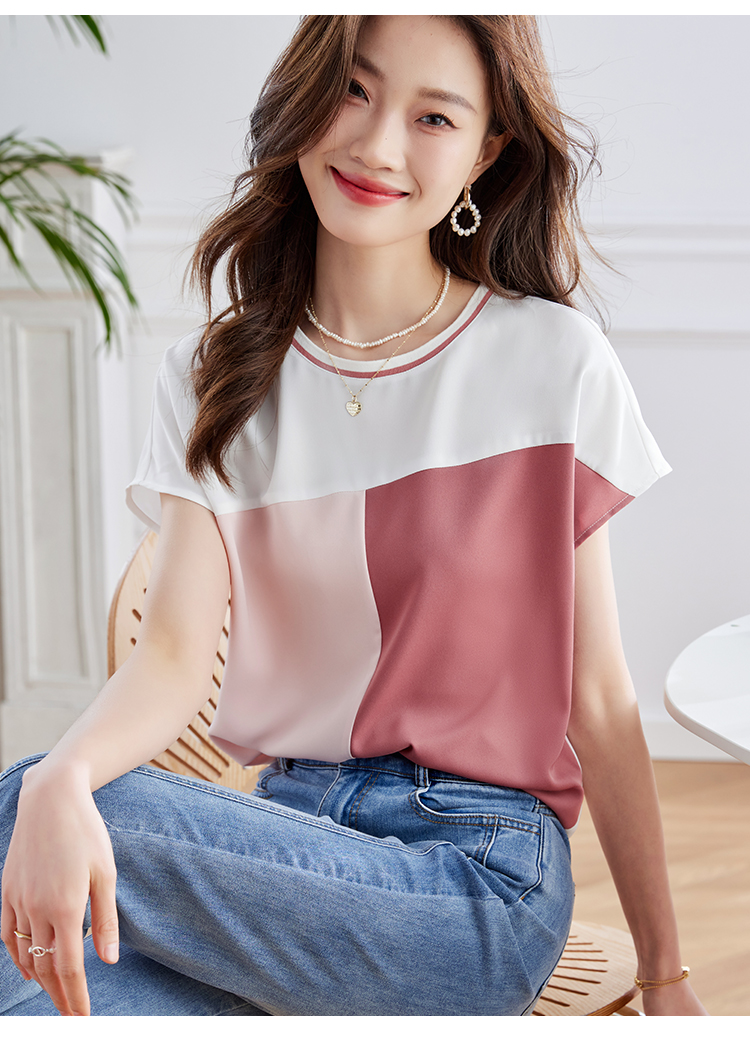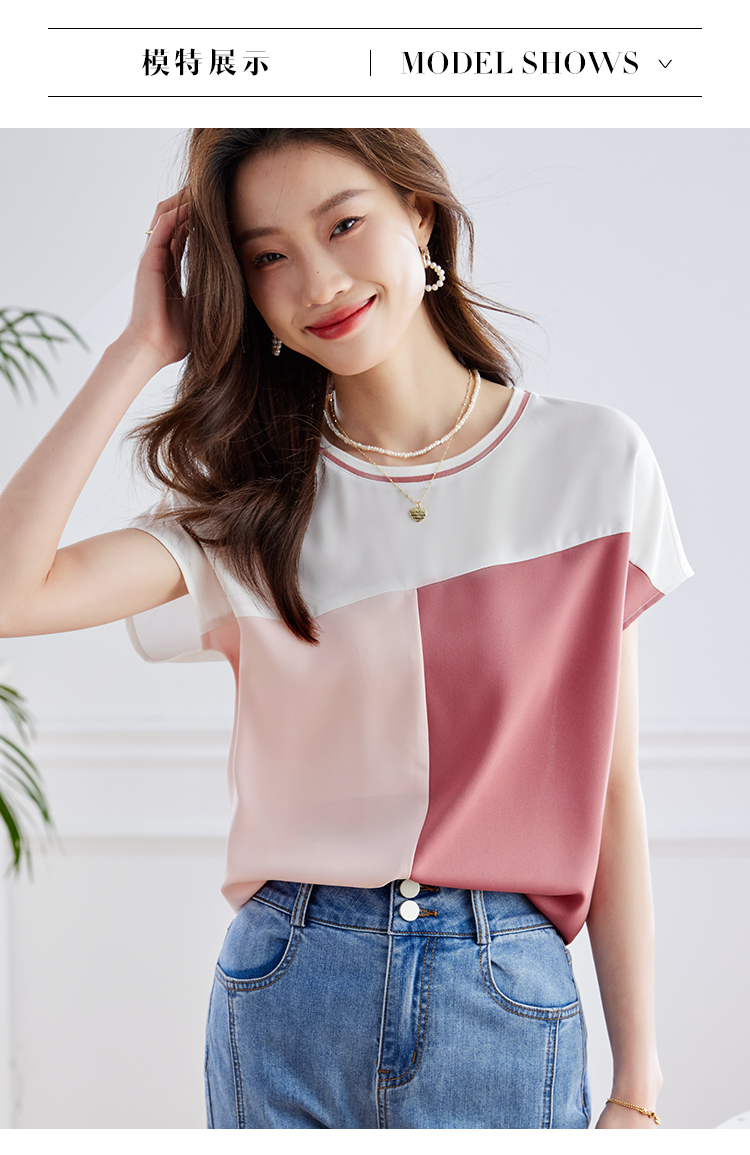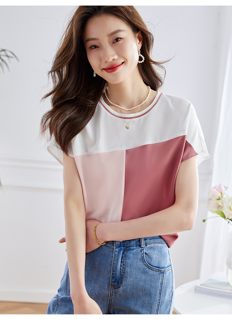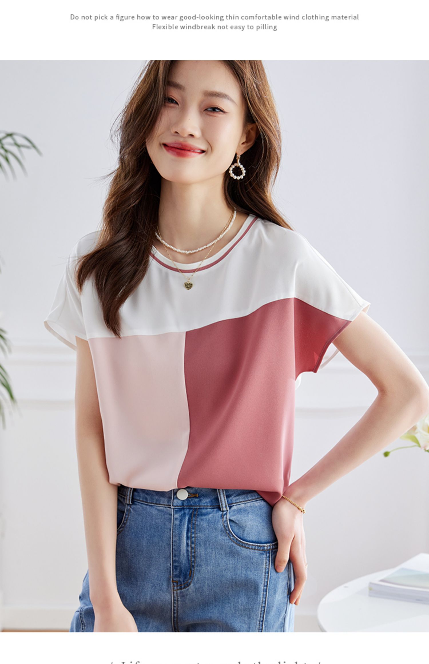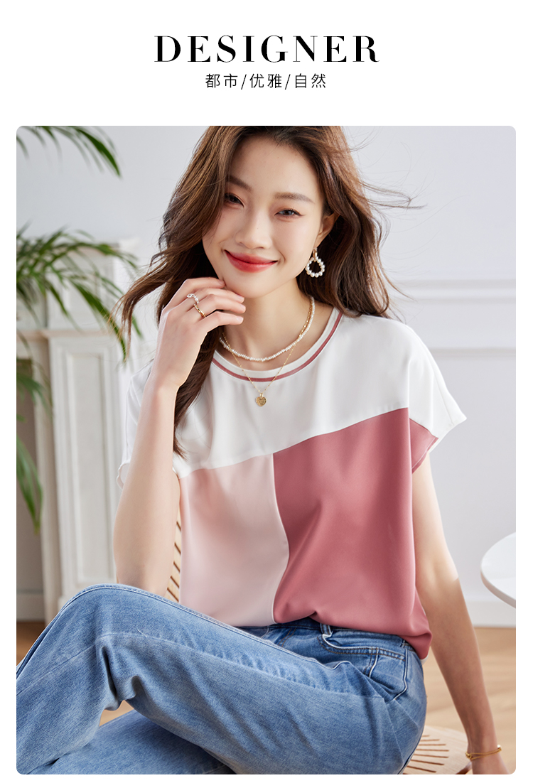 【五折购】熙世界蝙蝠袖拼色圆领雪纺衫女2025夏日新款高端时尚洋气小衫上衣