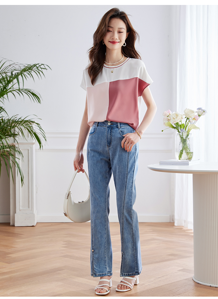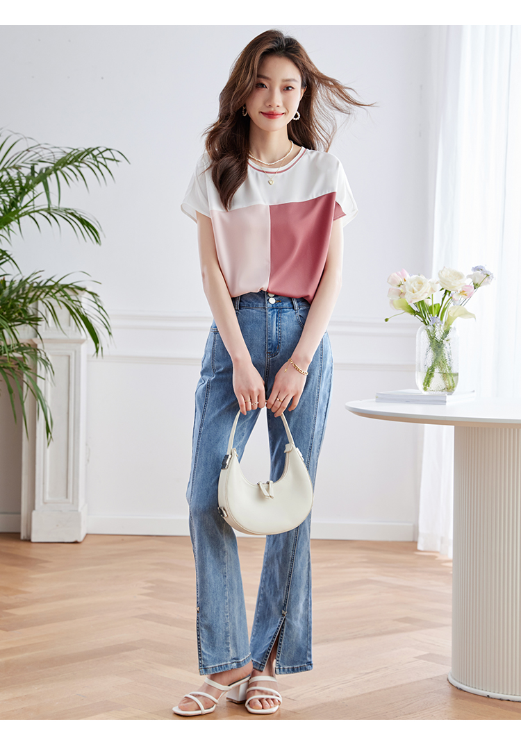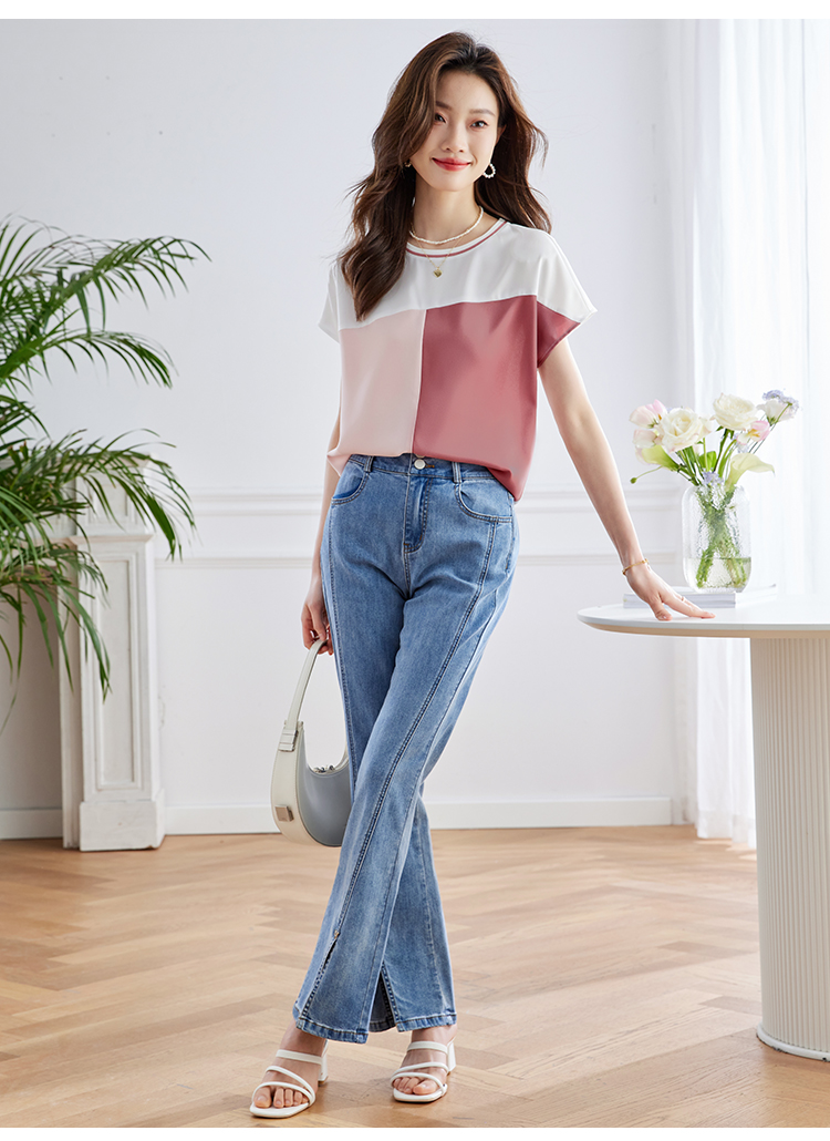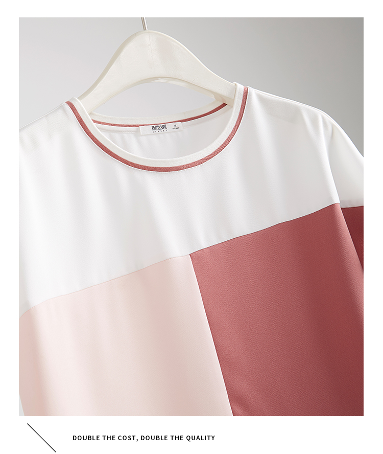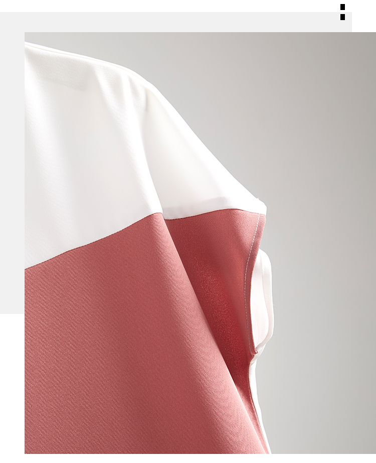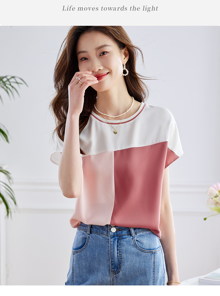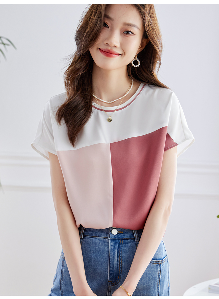 【五折购】熙世界蝙蝠袖拼色圆领雪纺衫女2025夏日新款高端时尚洋气小衫上衣