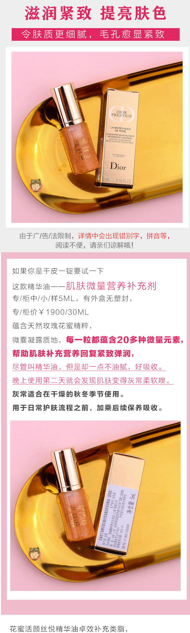 轻如露润如珠~迪奥花蜜活颜丝悦玫瑰润养轻质精油5ml 微凝精华液JPY带授权招加盟代理