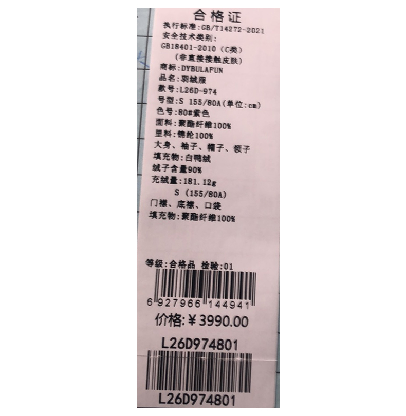 戴布拉芬羽绒服L26D974