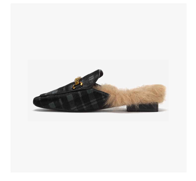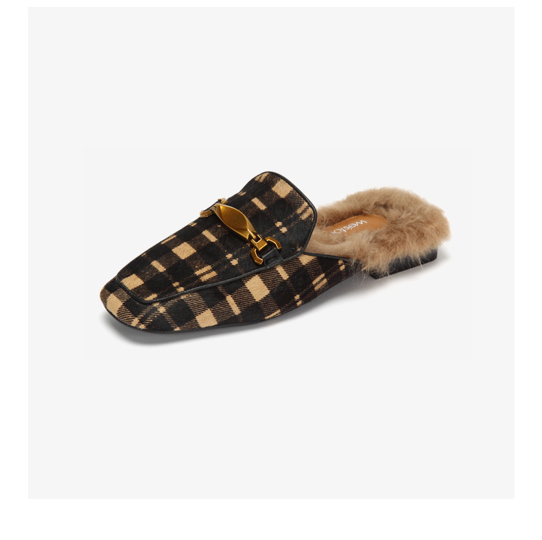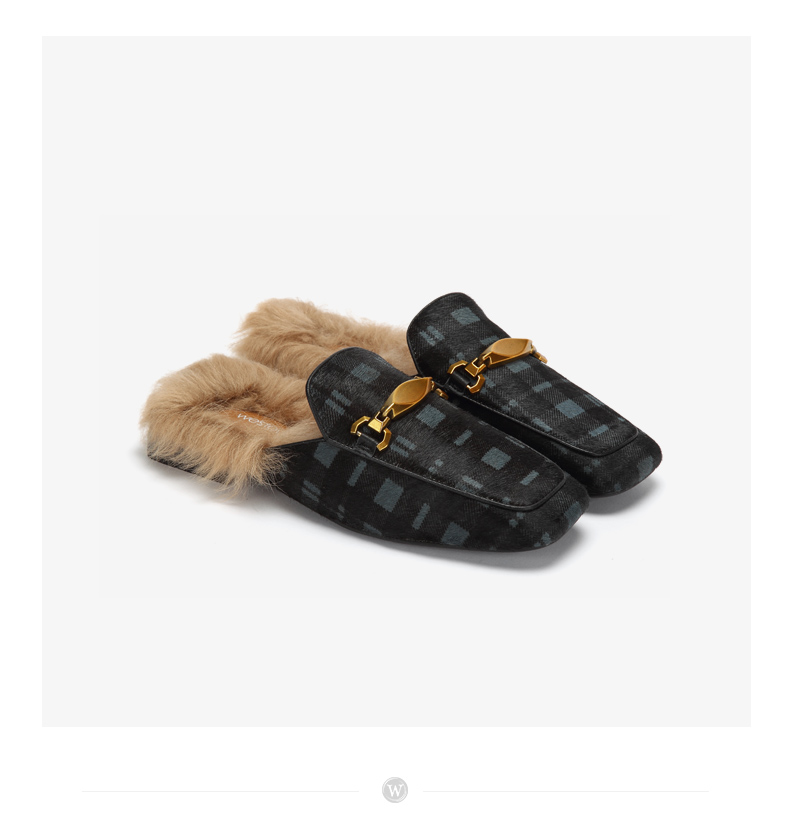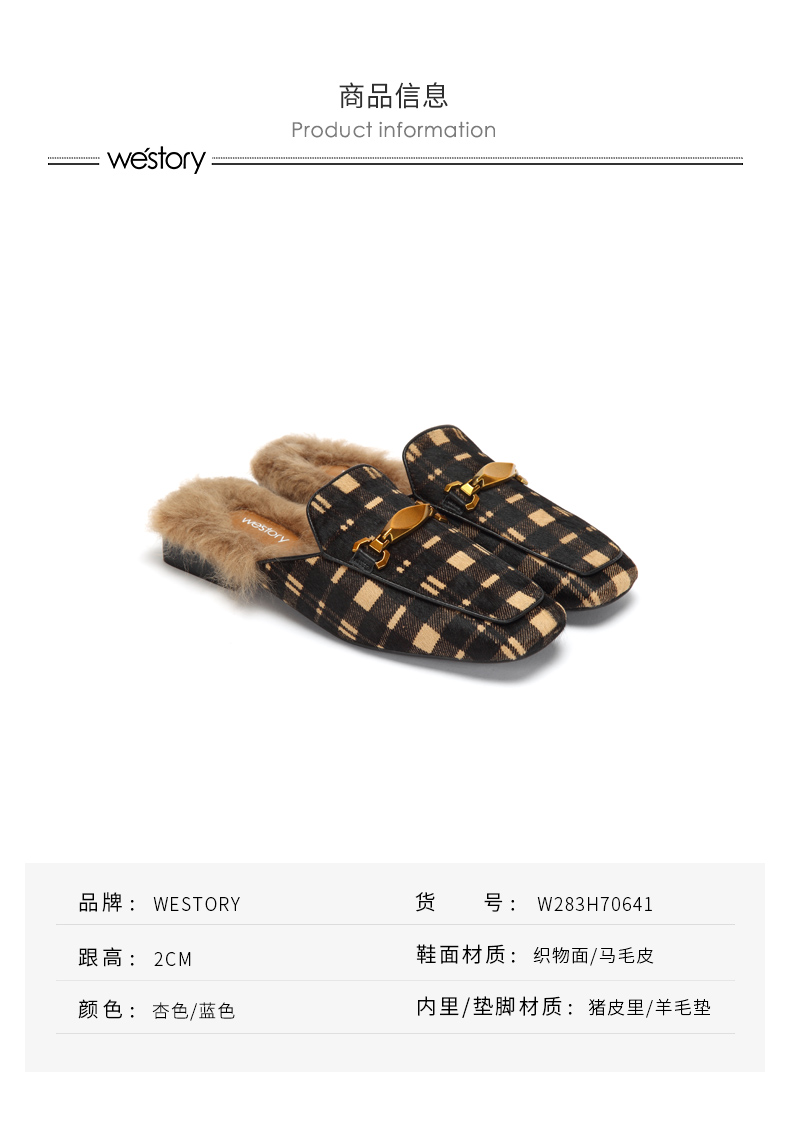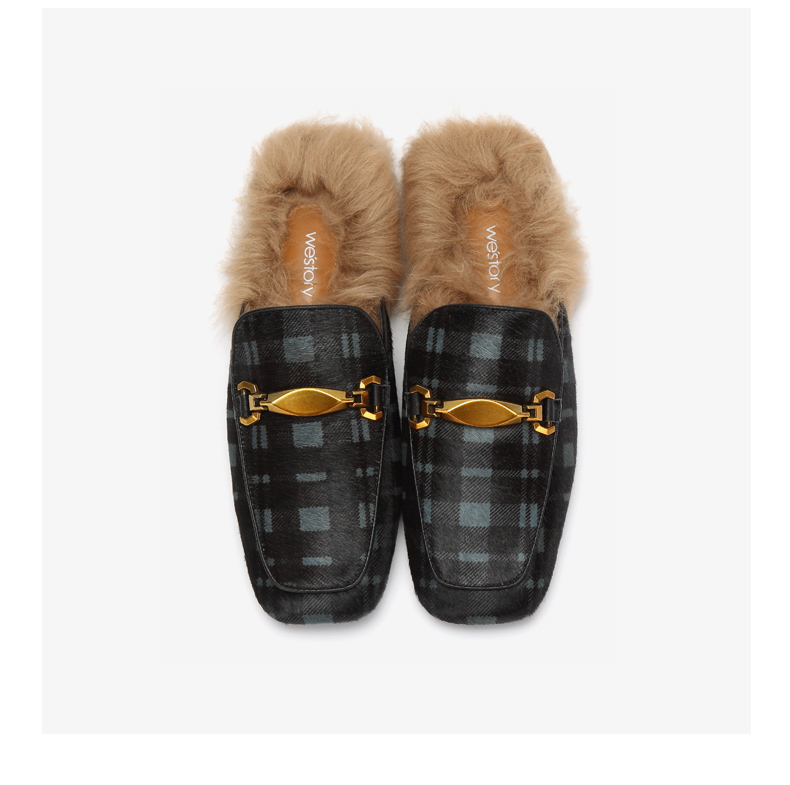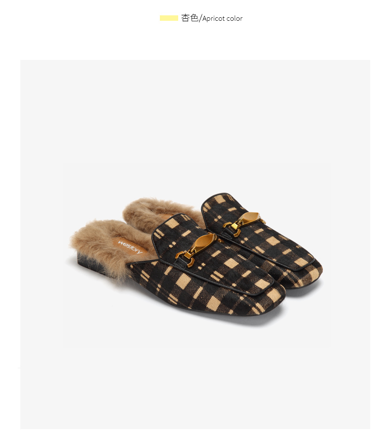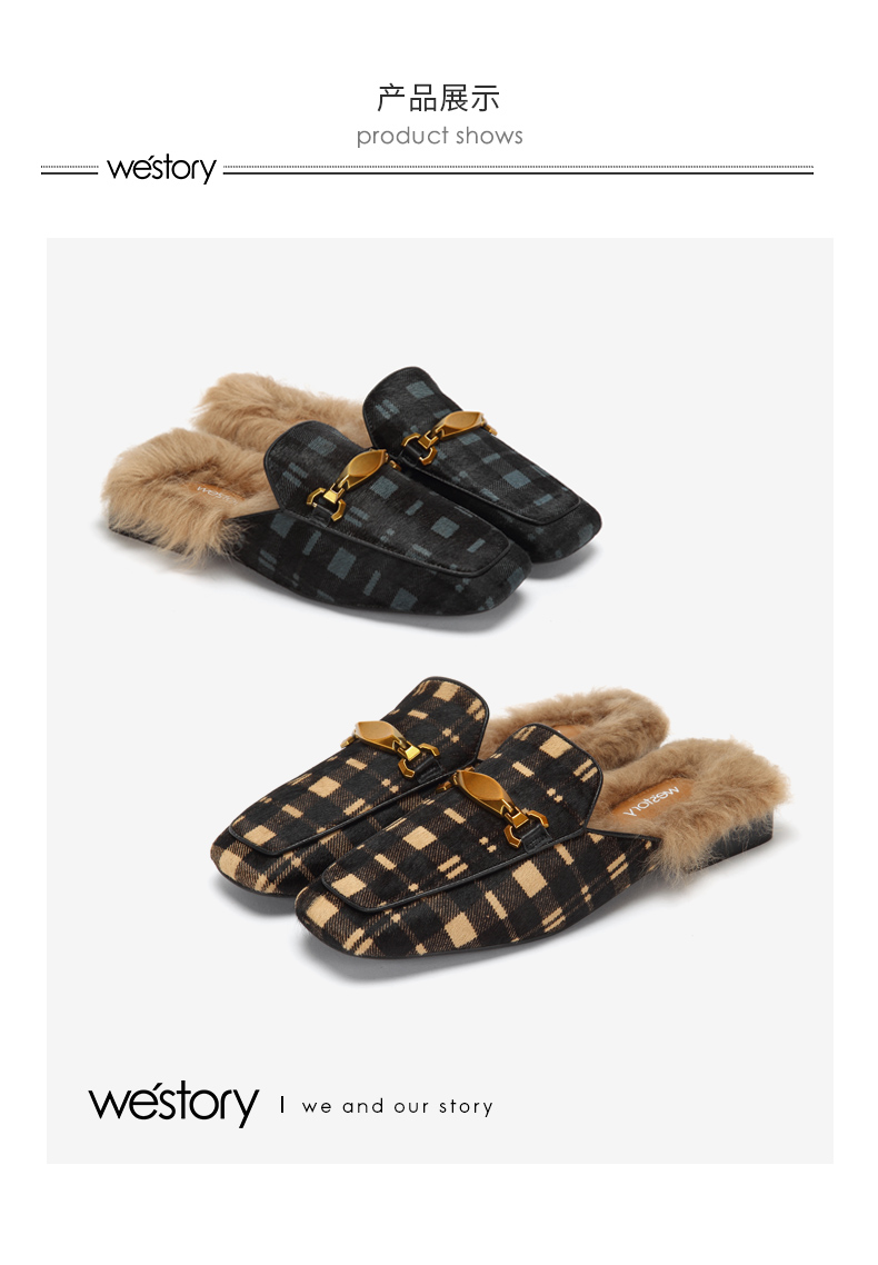 westory商场同款秋季毛毛拖鞋方头低跟格子鞋女W283H70641
