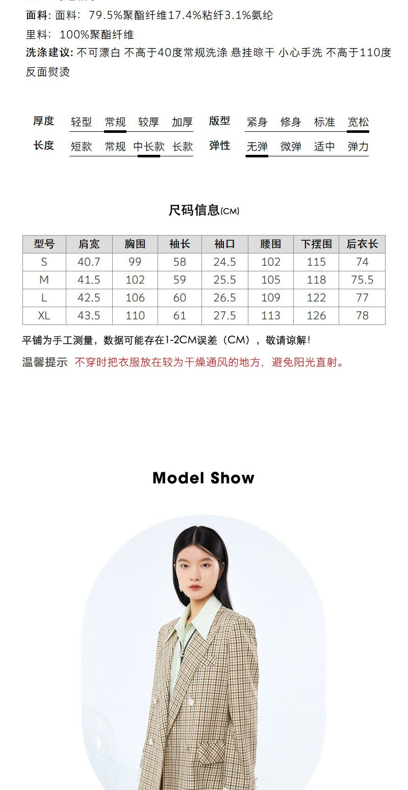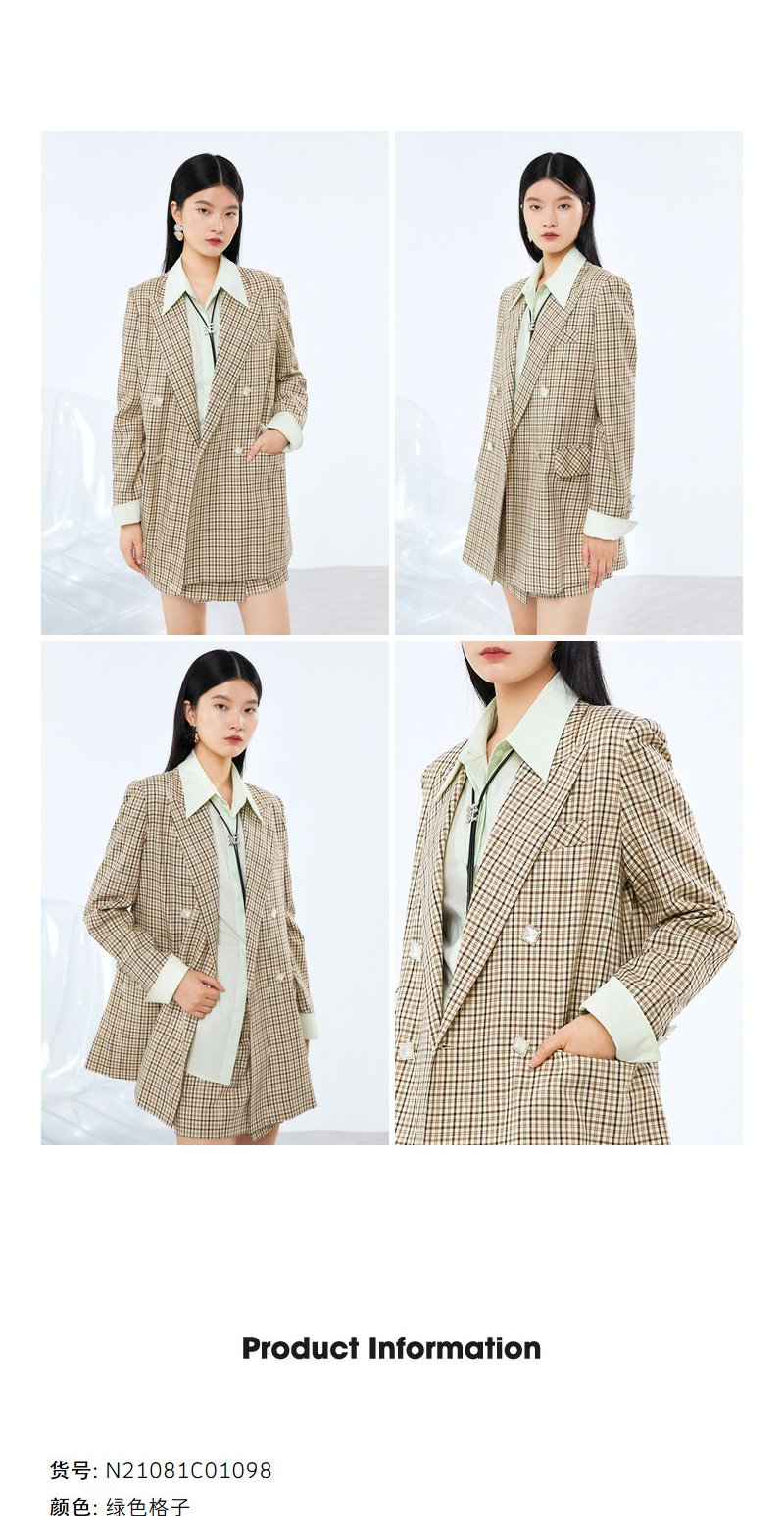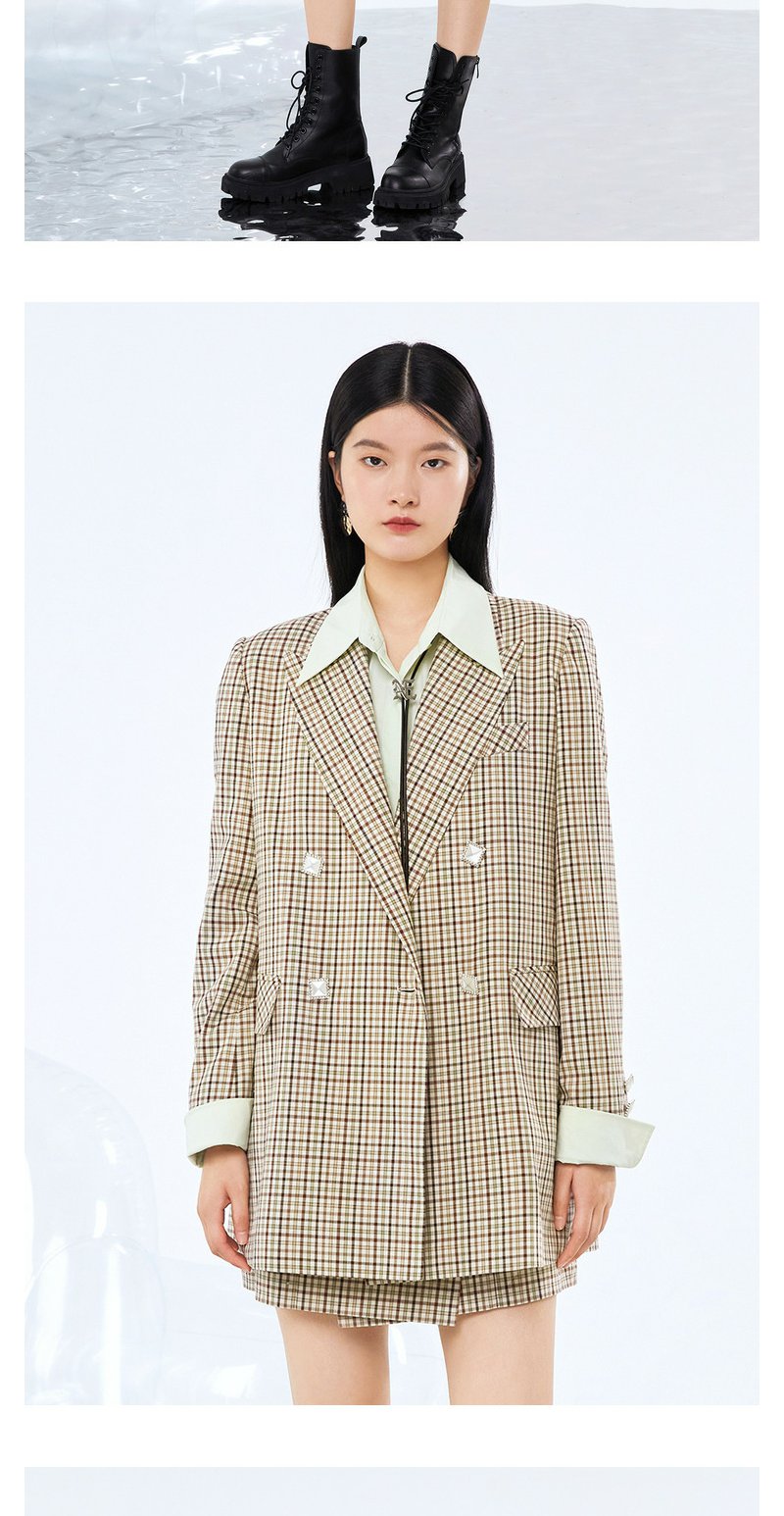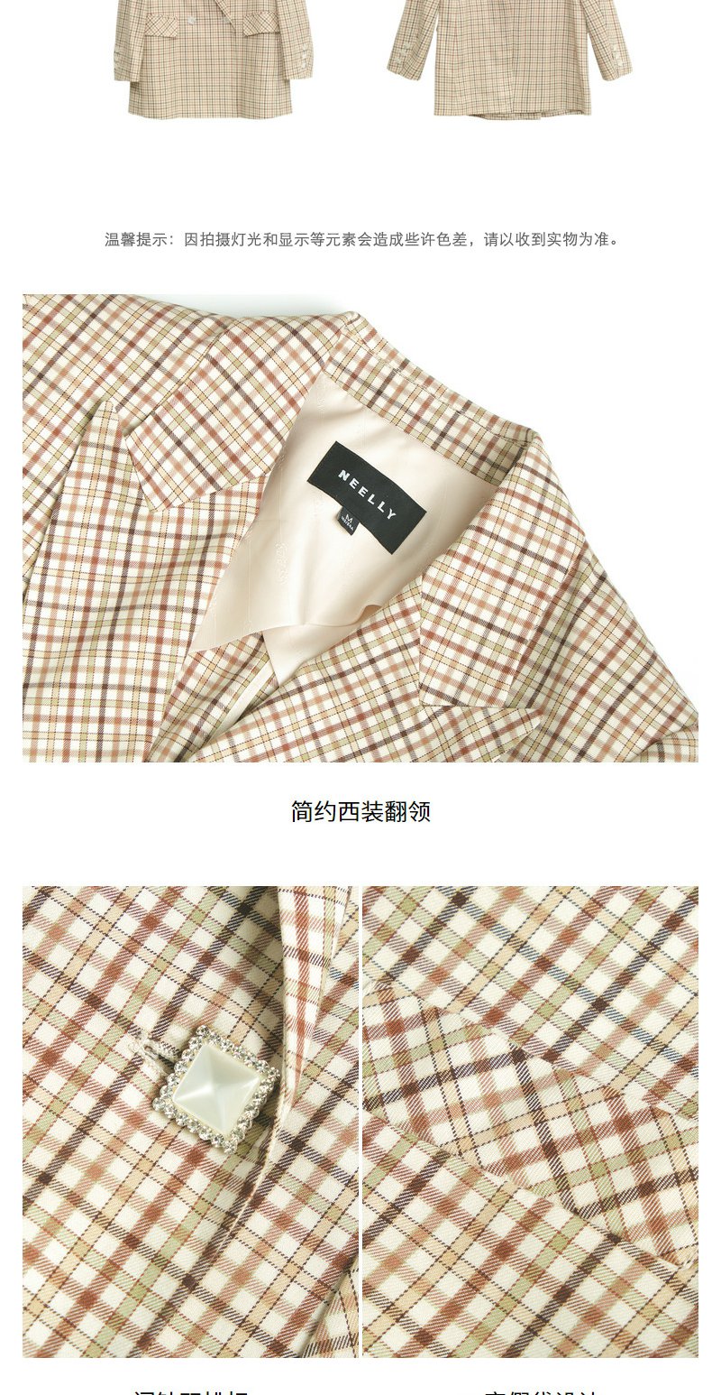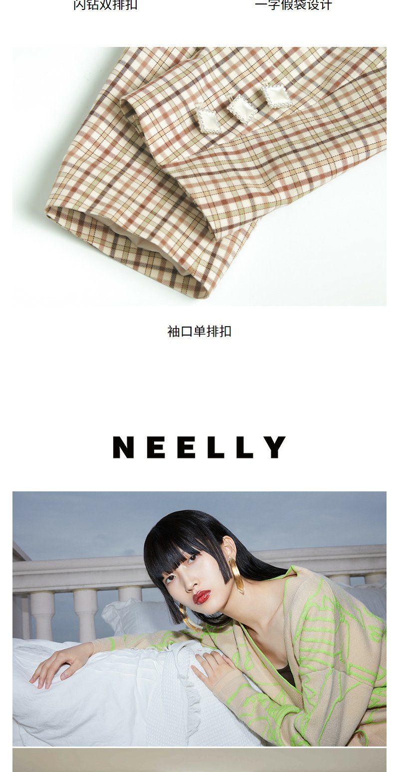NEELLY纳俪翻驳领西装女中长款格纹复古闪钻双排扣外套百搭显瘦N22074W04415