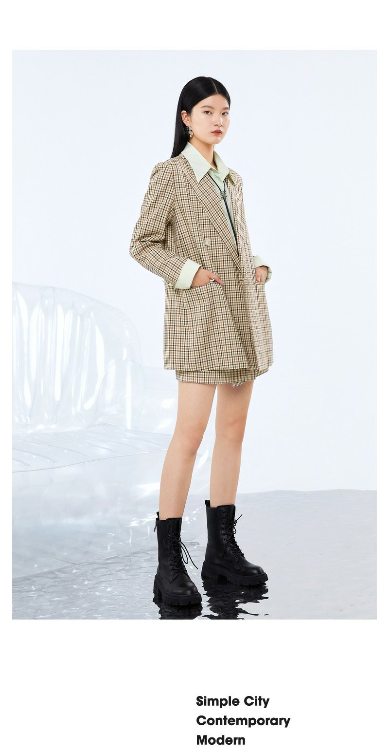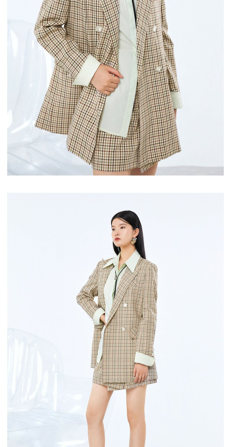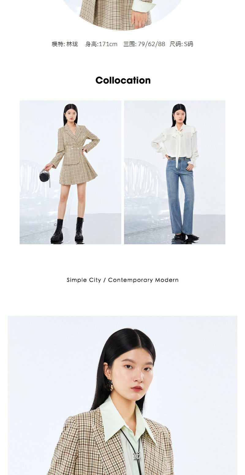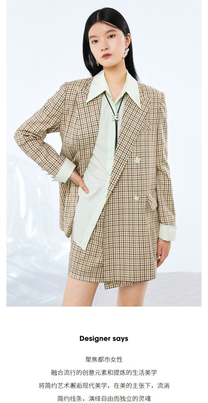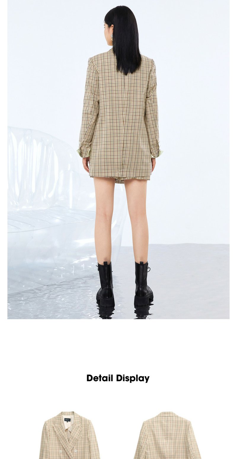 NEELLY纳俪翻驳领西装女中长款格纹复古闪钻双排扣外套百搭显瘦N22074W04415