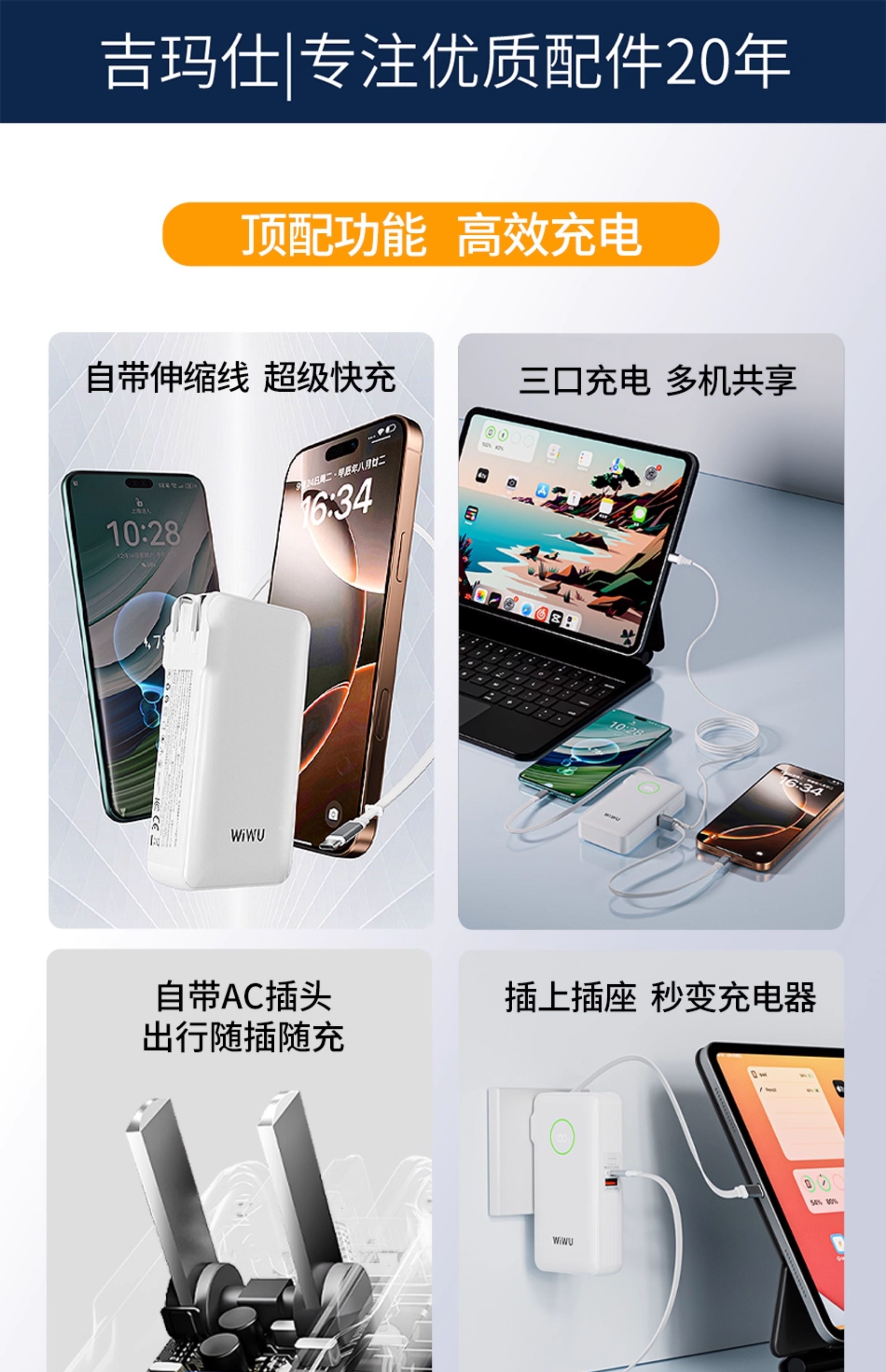 【3C认证可上飞机】wiwu自带线充电宝PD22.5W快充手机移动电源