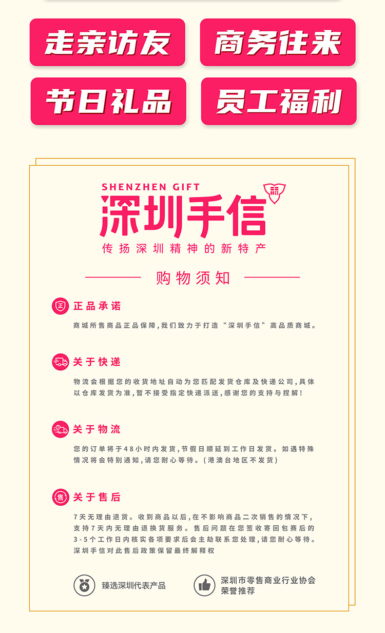 欢迎关注【深圳手信商城】 深圳手信是城市礼品的选购平台,臻选深圳八大优势产业代表产品,深圳市零售商业行业协会推荐。 闭着眼睛挑,每一份都是好礼,是商务往来、旅游出差、走亲访友、员工福利的好礼