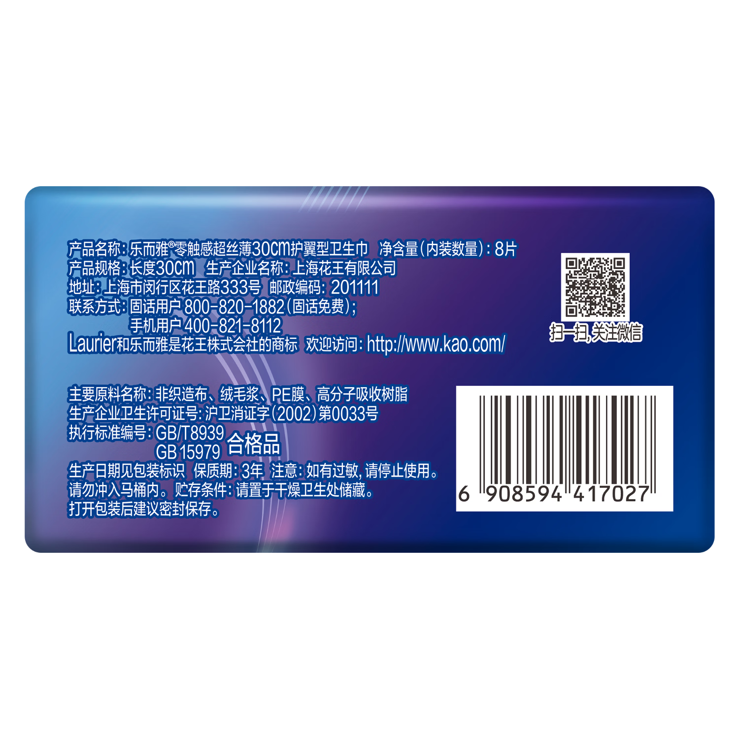 花王乐而雅 30cm零触感特薄夜用超丝薄绵柔卫生巾 8片/包