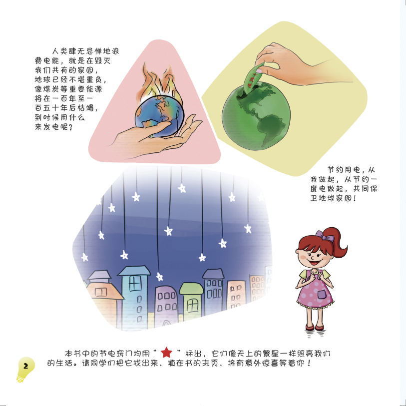 全书互动性强,每篇故事后设置的“节电小贴士”“我是行动派”,鼓励小学生们在老师或家长的指导下,通过自己的行动,进一步实践自己学到的节电知识。最后设置的“节约用电大本营”,鼓励孩子“以寻宝的方式”将书中节约用电的知识点(用★标出)进行总结和巩固。书中倡议小学生与家长玩一个游戏:小学生对照书中的节电方法监督家长改变用电习惯,一个季度后统计家中节省的电费,给小学生一个奖品作为奖励。