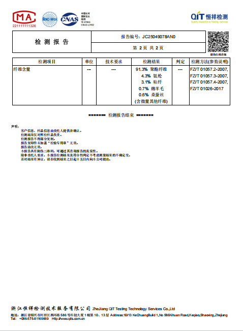 成分:91.3% 聚酯纤维,4.3% 氨纶,3.% 粘纤,0.7% 锦羊毛,0.6% 桑蚕丝